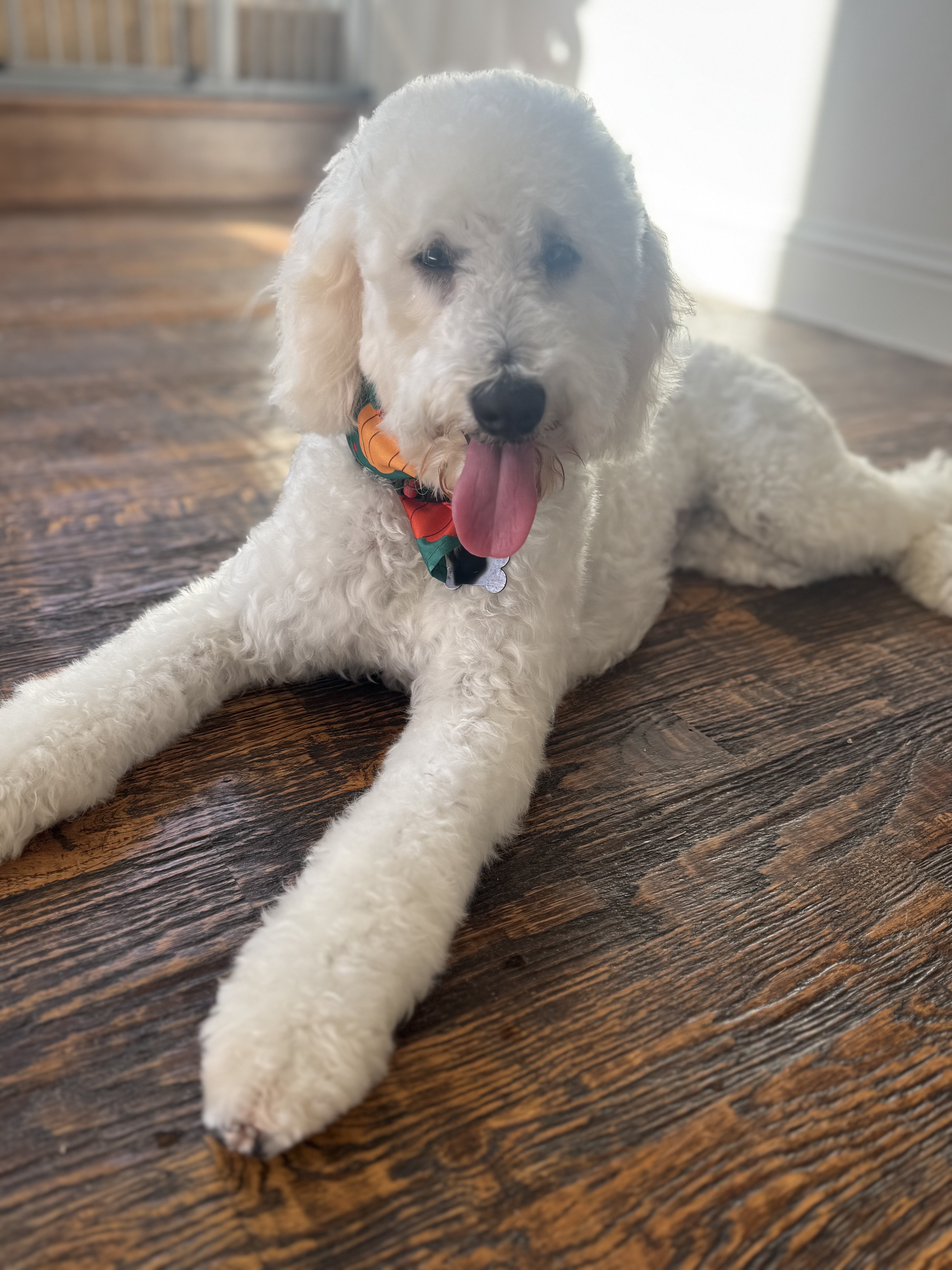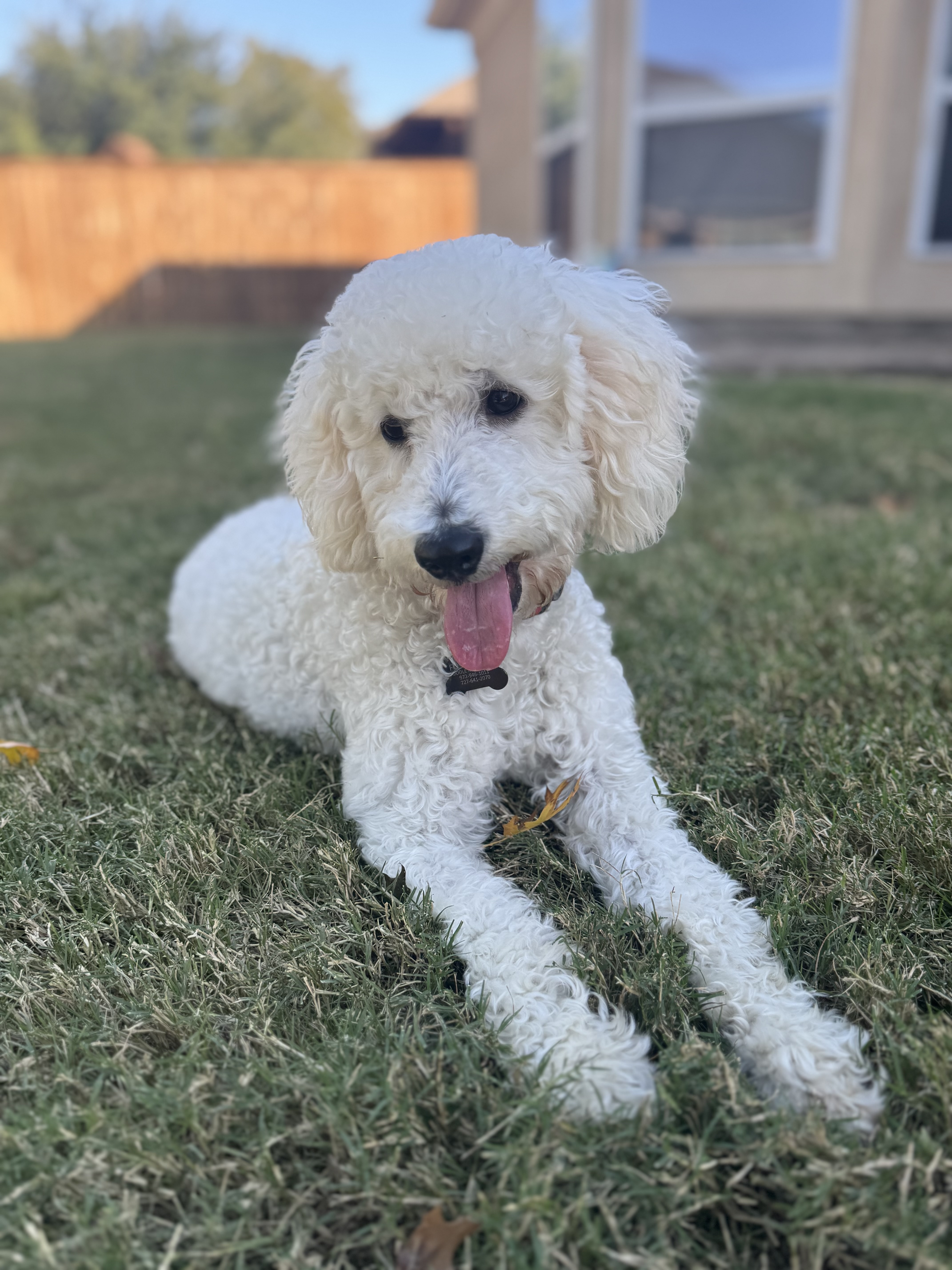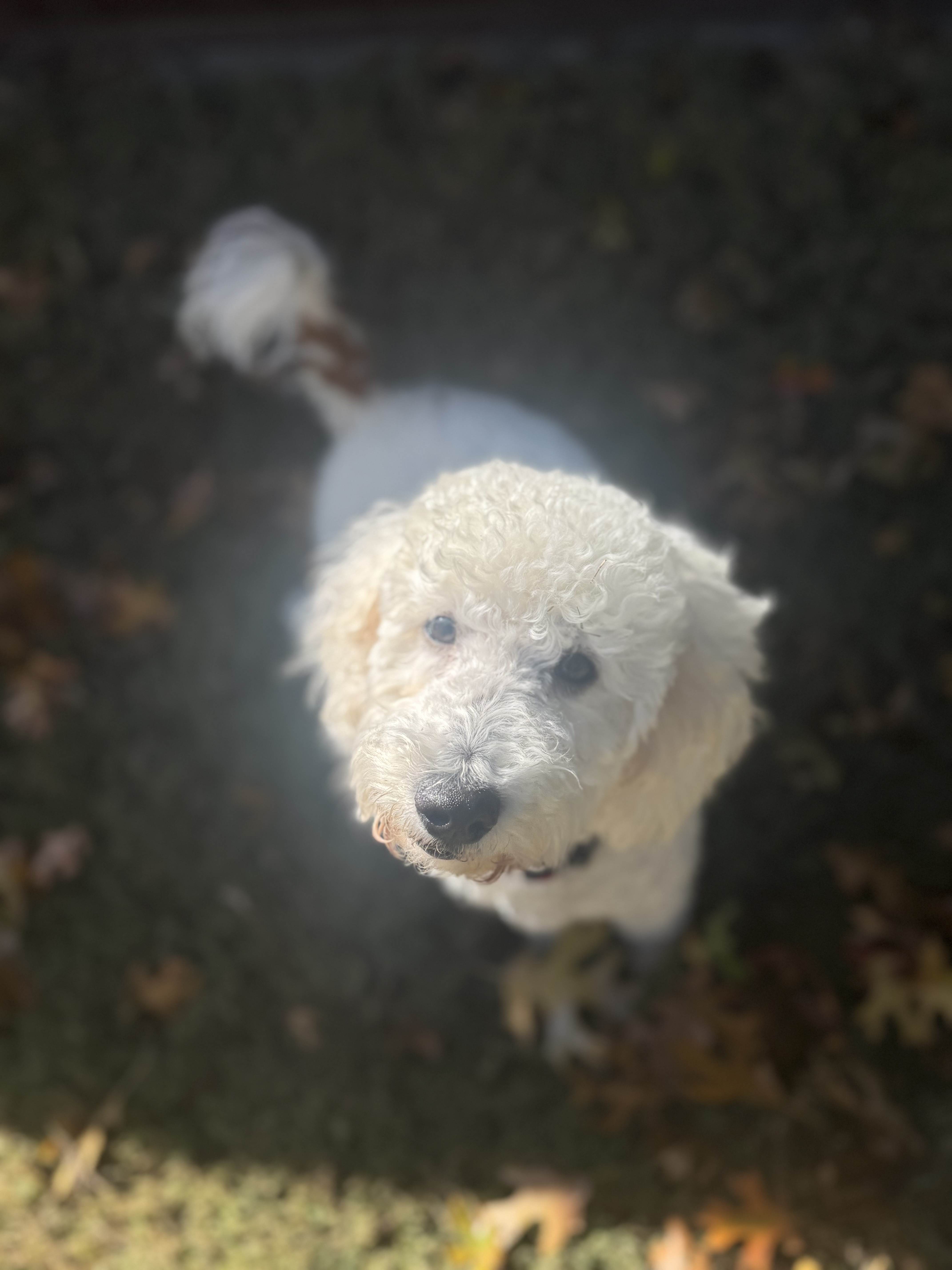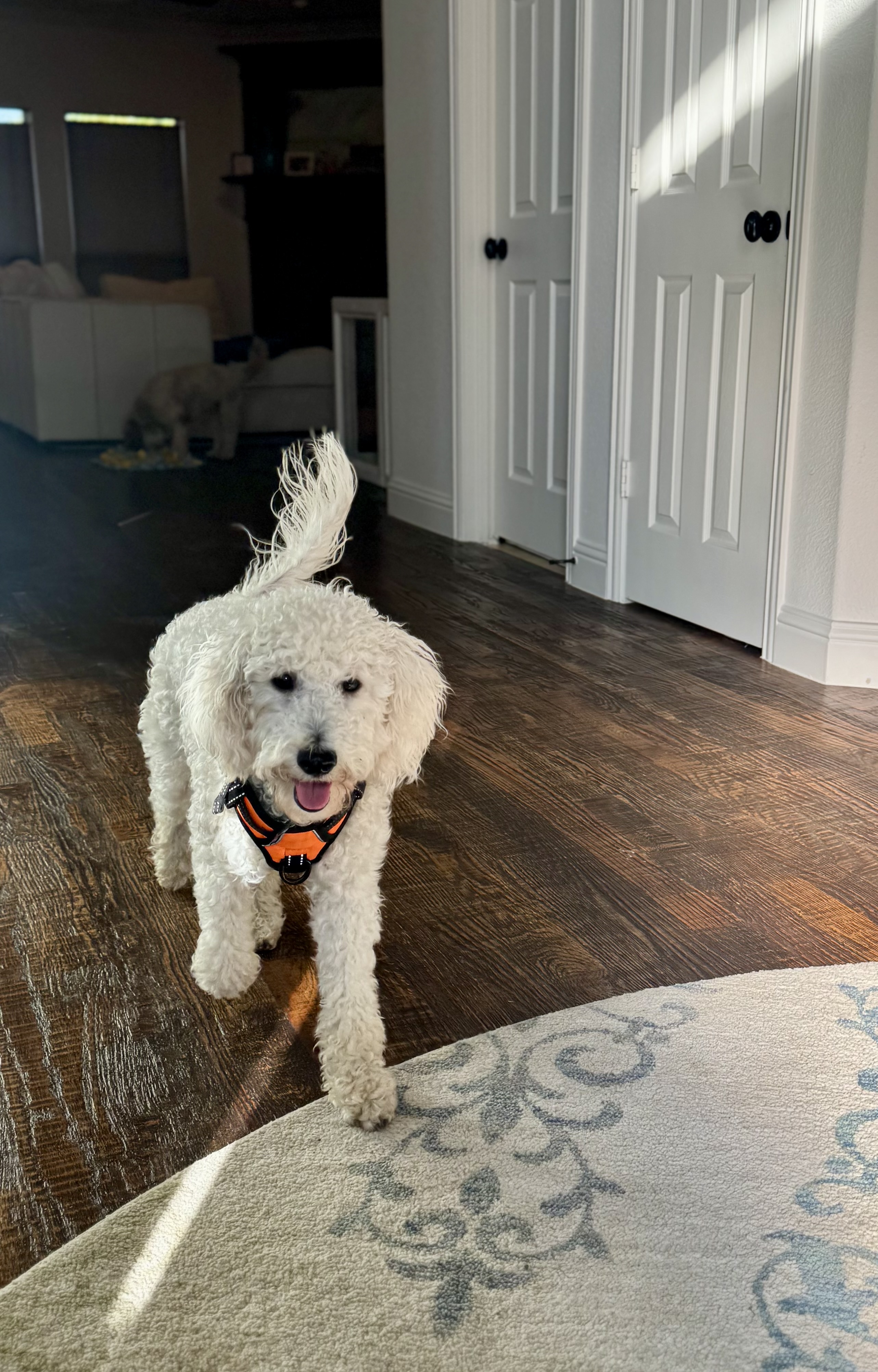 Hi, I’m Kerry, a 10-month-old, 20-pound poodle with main-character energy and a full-time zest for life. My foster dad swears you can’t have a bad day with me around, and I take that job seriously. I greet everyone like they’ve been gone for ages, and I trot through life with my signature mix of butt wiggles and head shuffles.