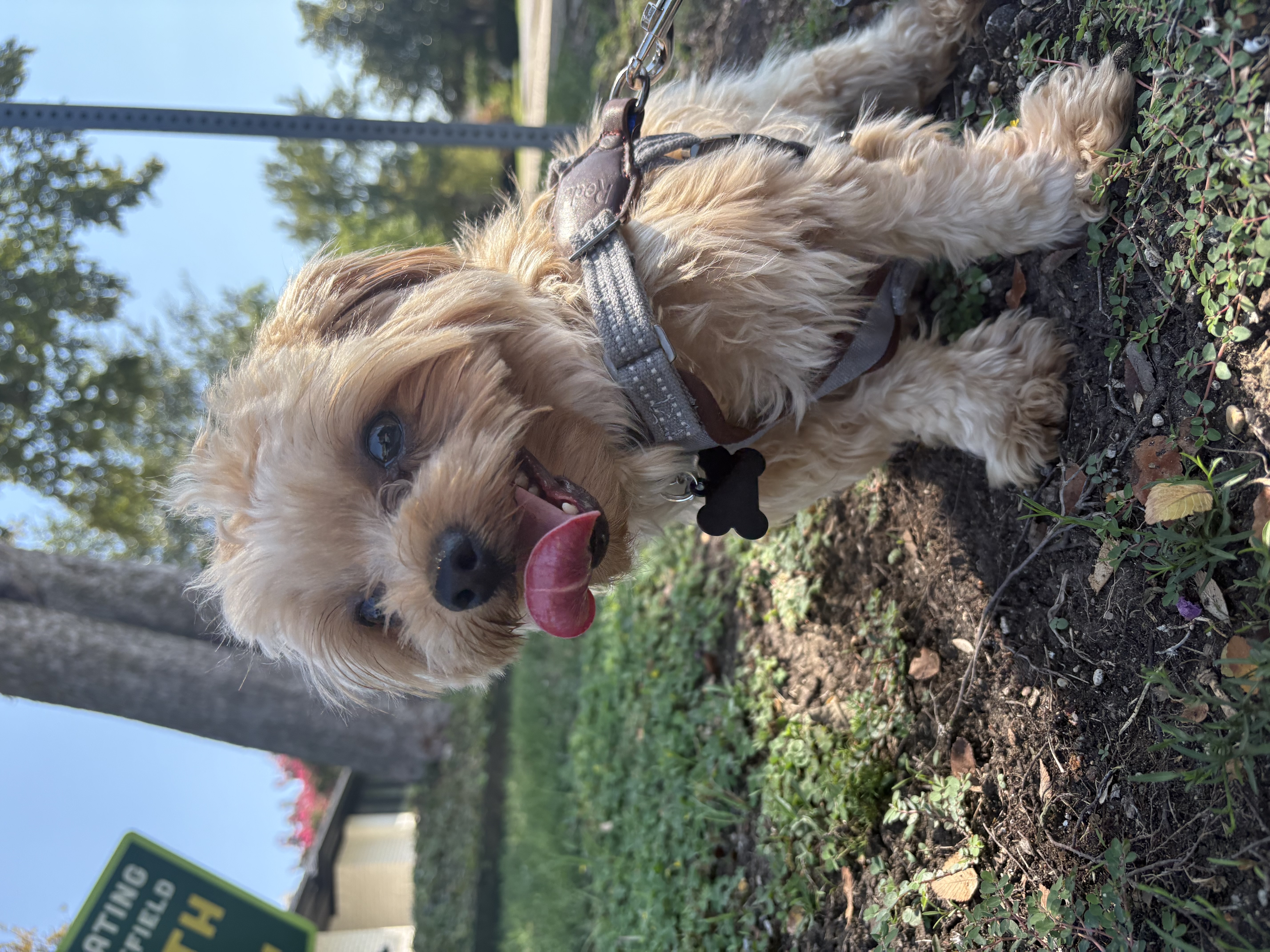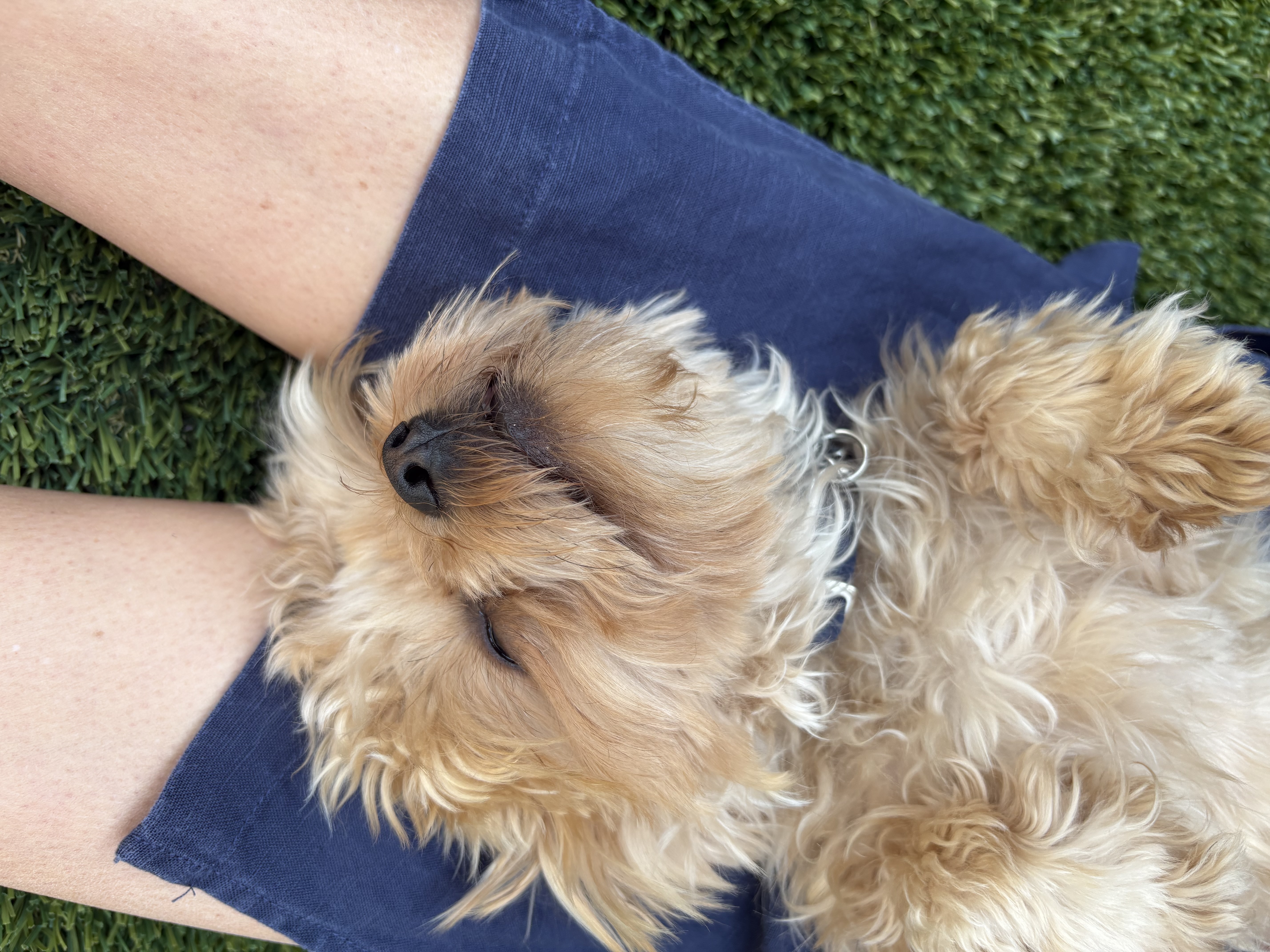 My days are full of fun and comfort: I wake up around 7am, go potty, eat breakfast, and then spend the day hanging out in the office with my foster mom, running around the yard, getting pets, and napping. I’m potty trained as long as I get regular outdoor breaks (and I’ve mastered the doggy door!). I enjoy a daily walk and short bursts of playtime before winding down in my crate around 9pm. I can get a little reactive with bigger dogs when I’m on leash, but I’m learning and improving every day.