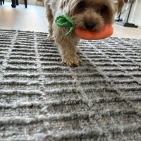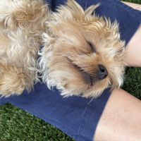 My days are full of fun and comfort: I wake up around 7am, go potty, eat breakfast, and then spend the day hanging out in the office with my foster mom, running around the yard, getting pets, and napping. I’m potty trained as long as I get regular outdoor breaks (and I’ve mastered the doggy door!). I enjoy a daily walk and short bursts of playtime before winding down in my crate around 9pm. I can get a little reactive with bigger dogs when I’m on leash, but I’m learning and improving every day.