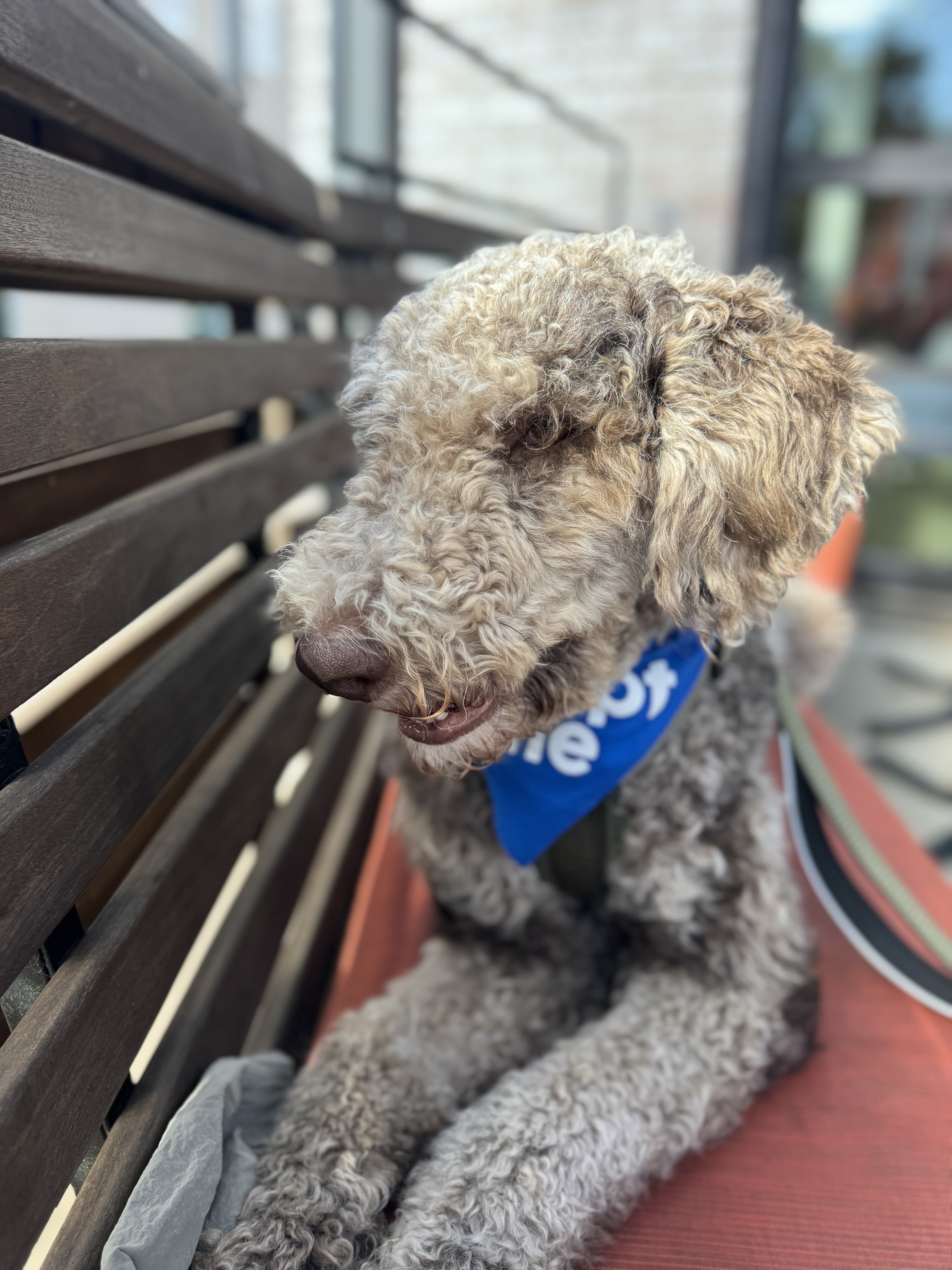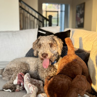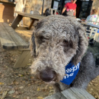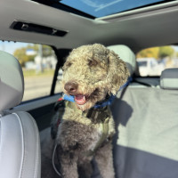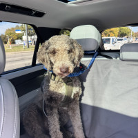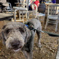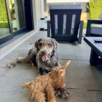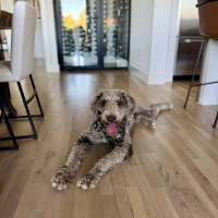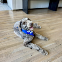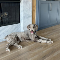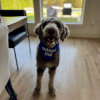 Hi, my name is Kru. I’m a 60-pound doodle with soft, curly gray fur and a gentle, playful spirit. I’m around one to two years old—past the puppy stage but still full of fun.