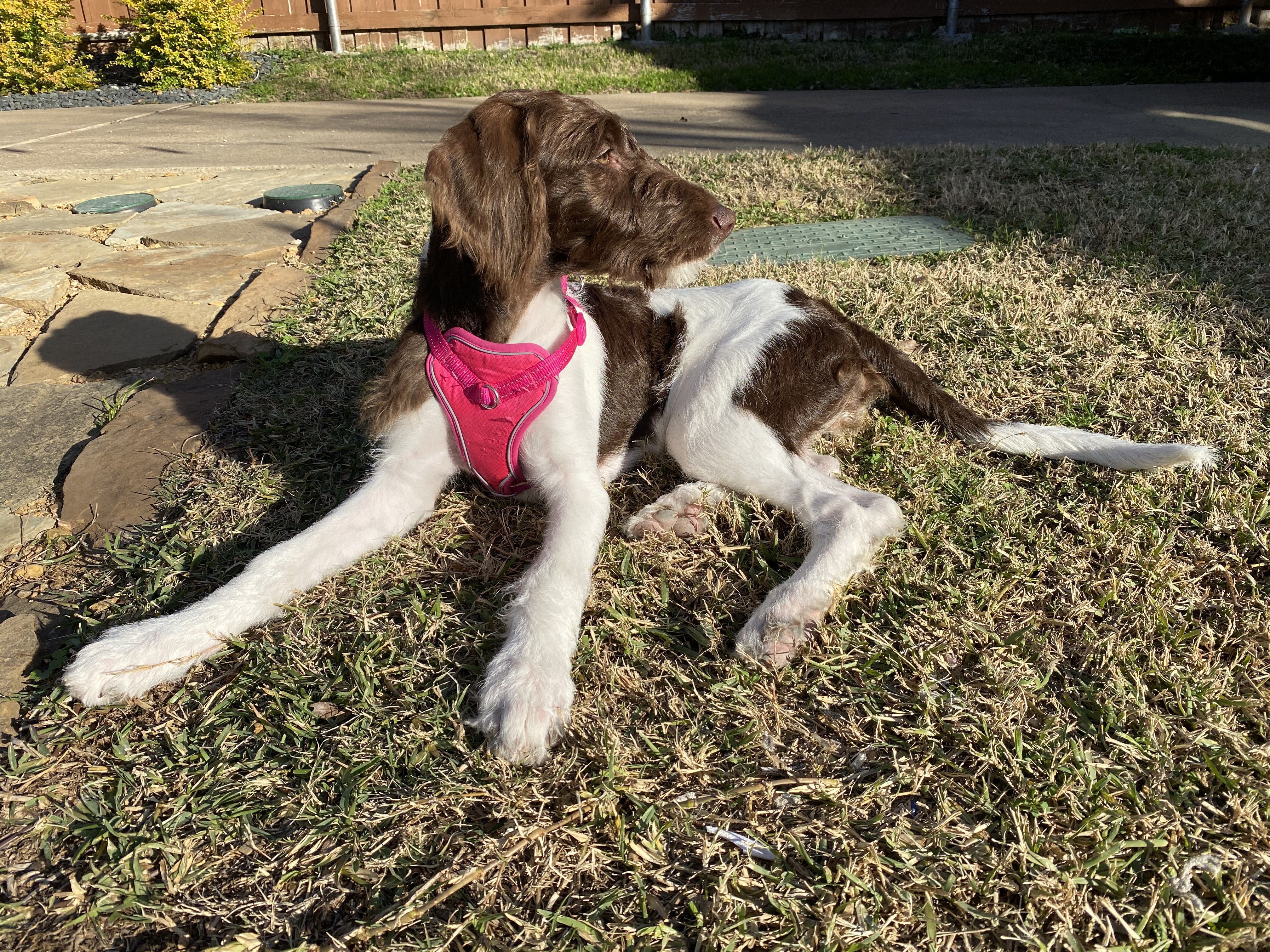 My basic commands are going well, could perfect them a bit more. Good news is I’m potty and crate trained! I love being near my humans, but when left alone I can be in my crate as well. I do best on a leash with my harness of course - daily walks keep me going! My puppy tendencies are mainly spurts of energy, no chewing at all, and as long as I’m exercised I’ll be good!