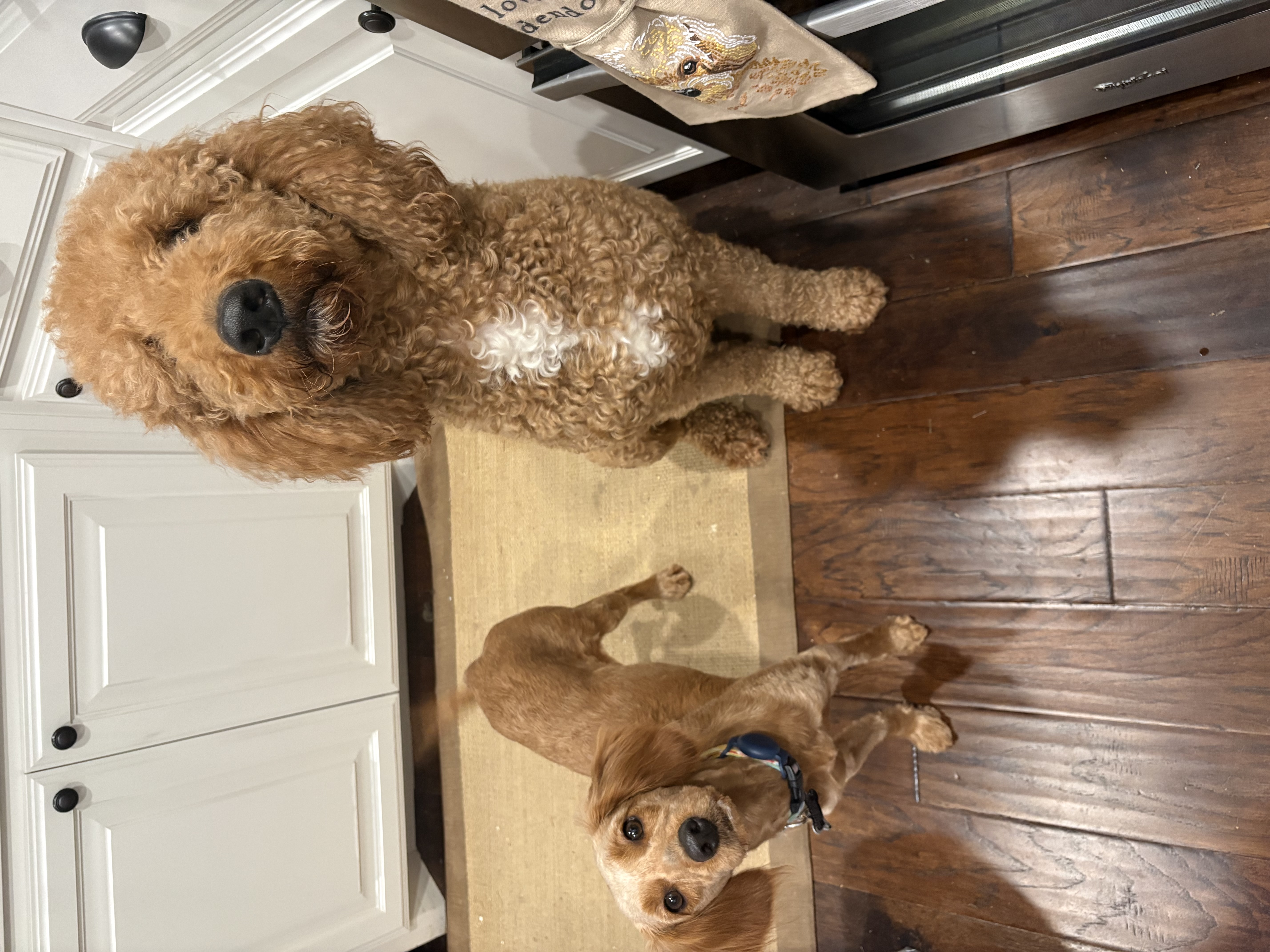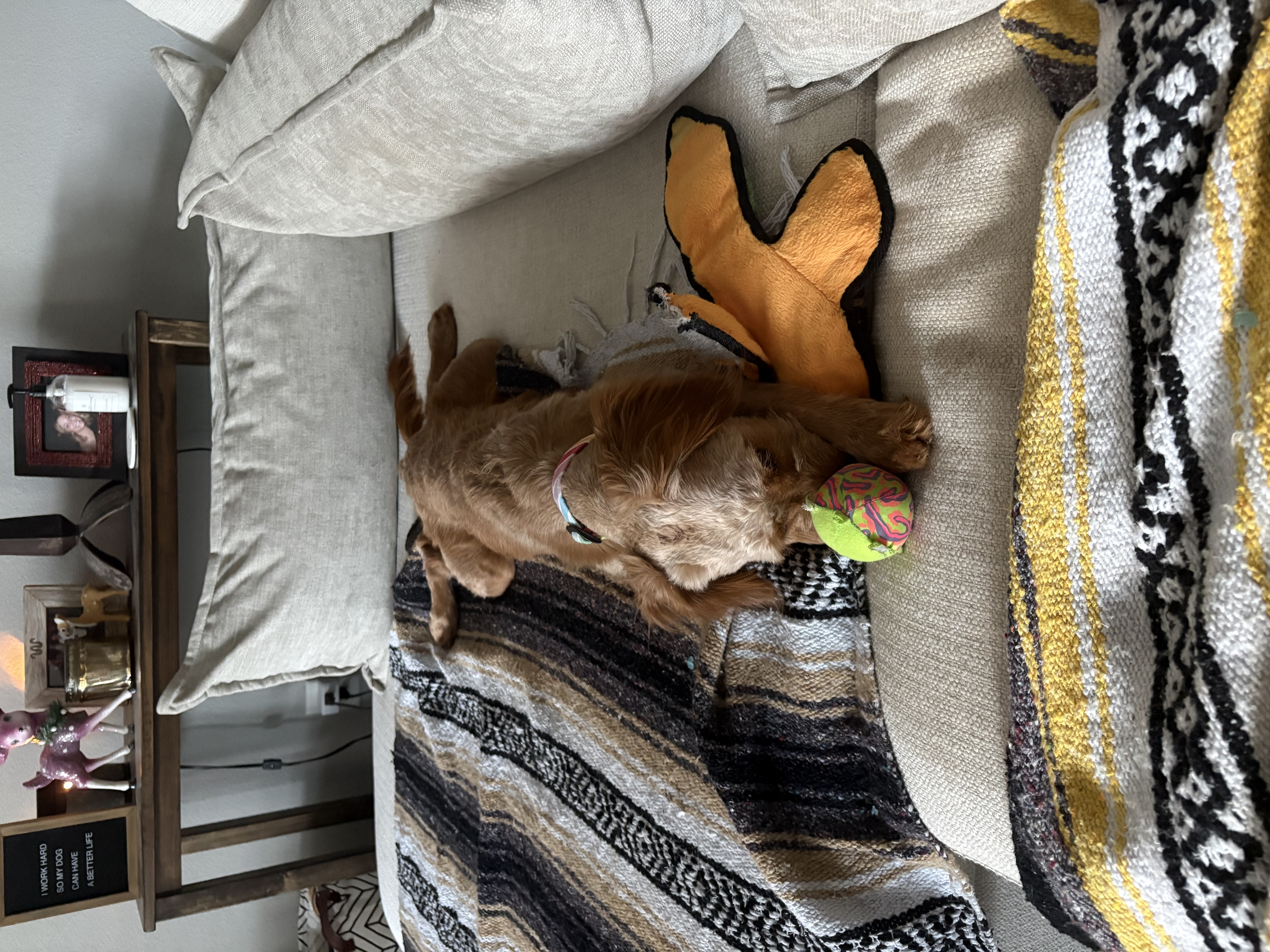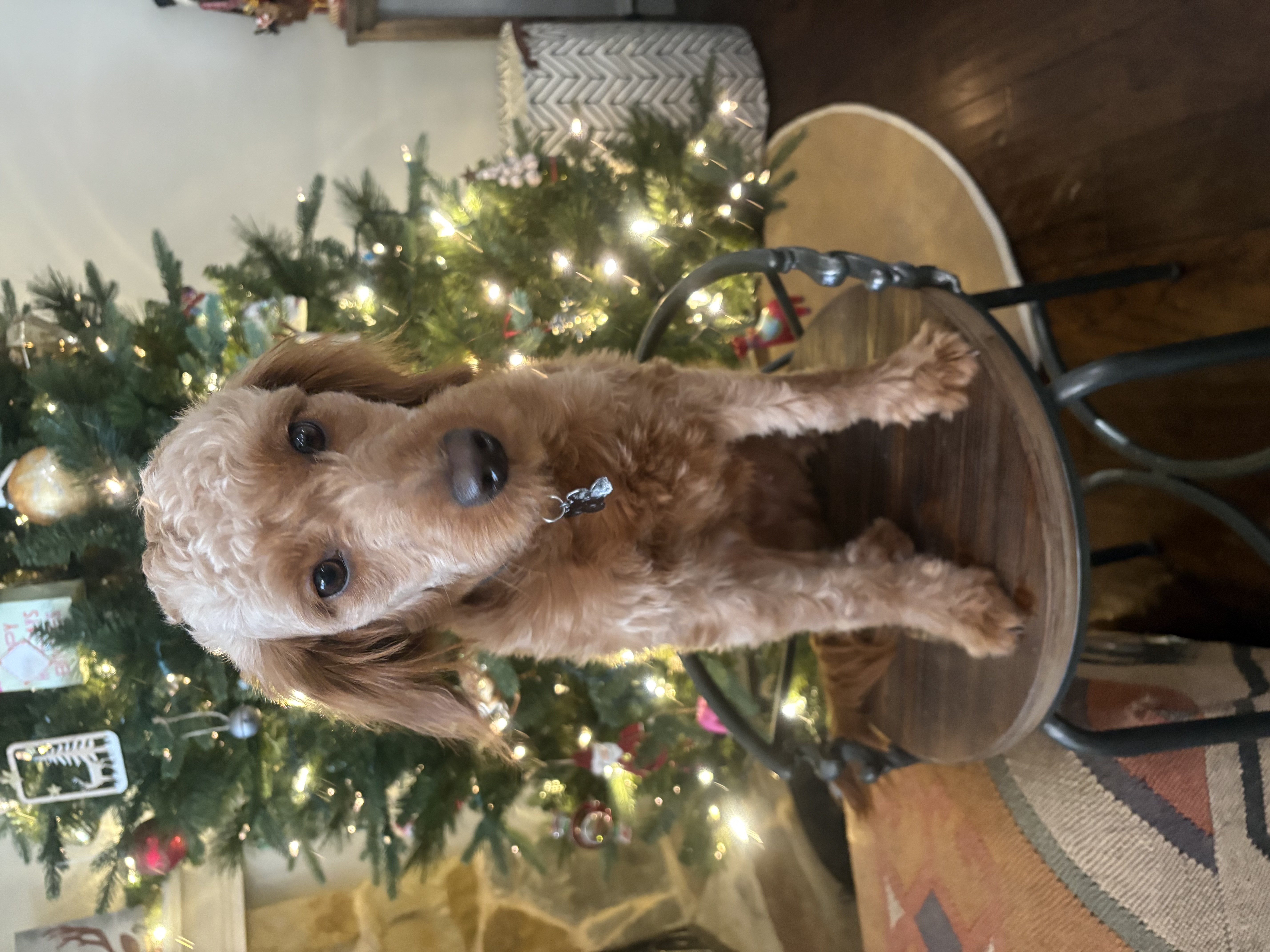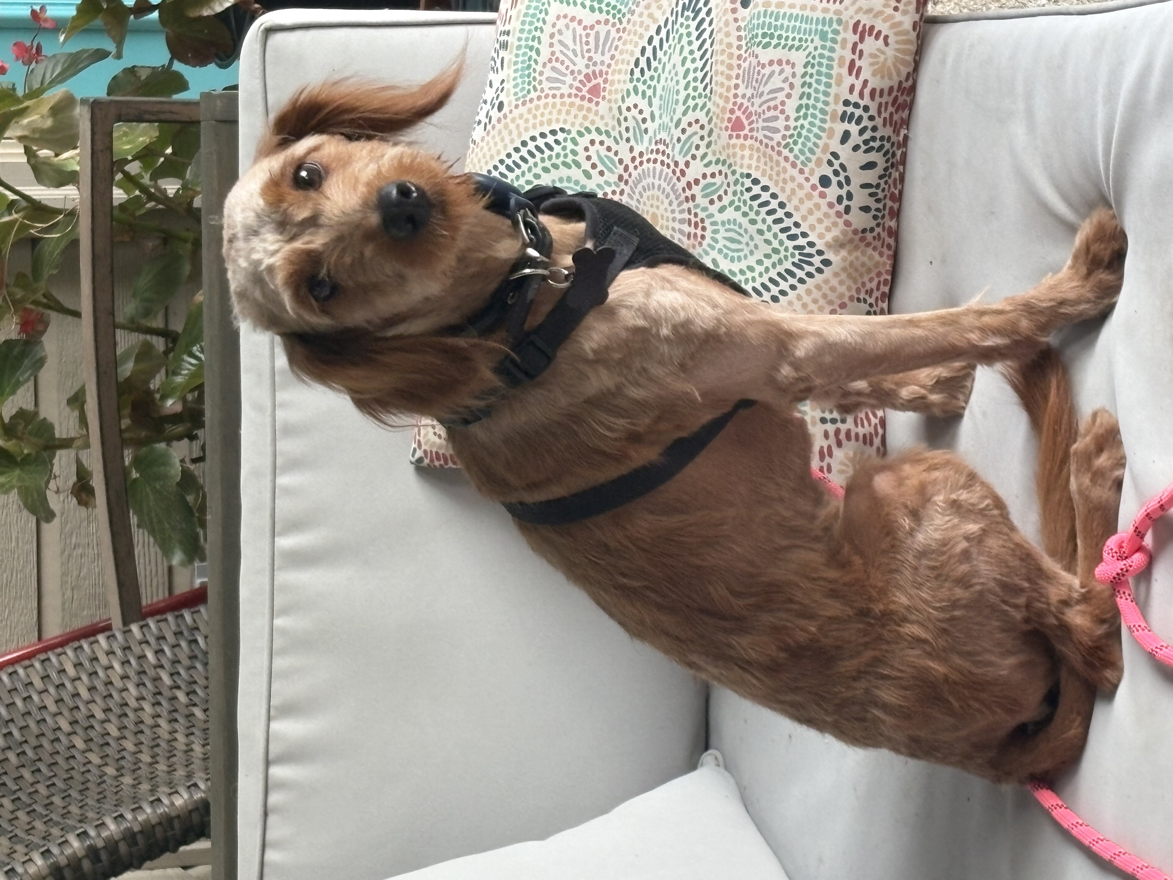 I’m a one-year-old mini Goldendoodle girl, weighing about 20 pounds and made up of long legs, soft curls, and an even softer heart. I may be “mini,” but don’t let that fool you—I’m mighty!