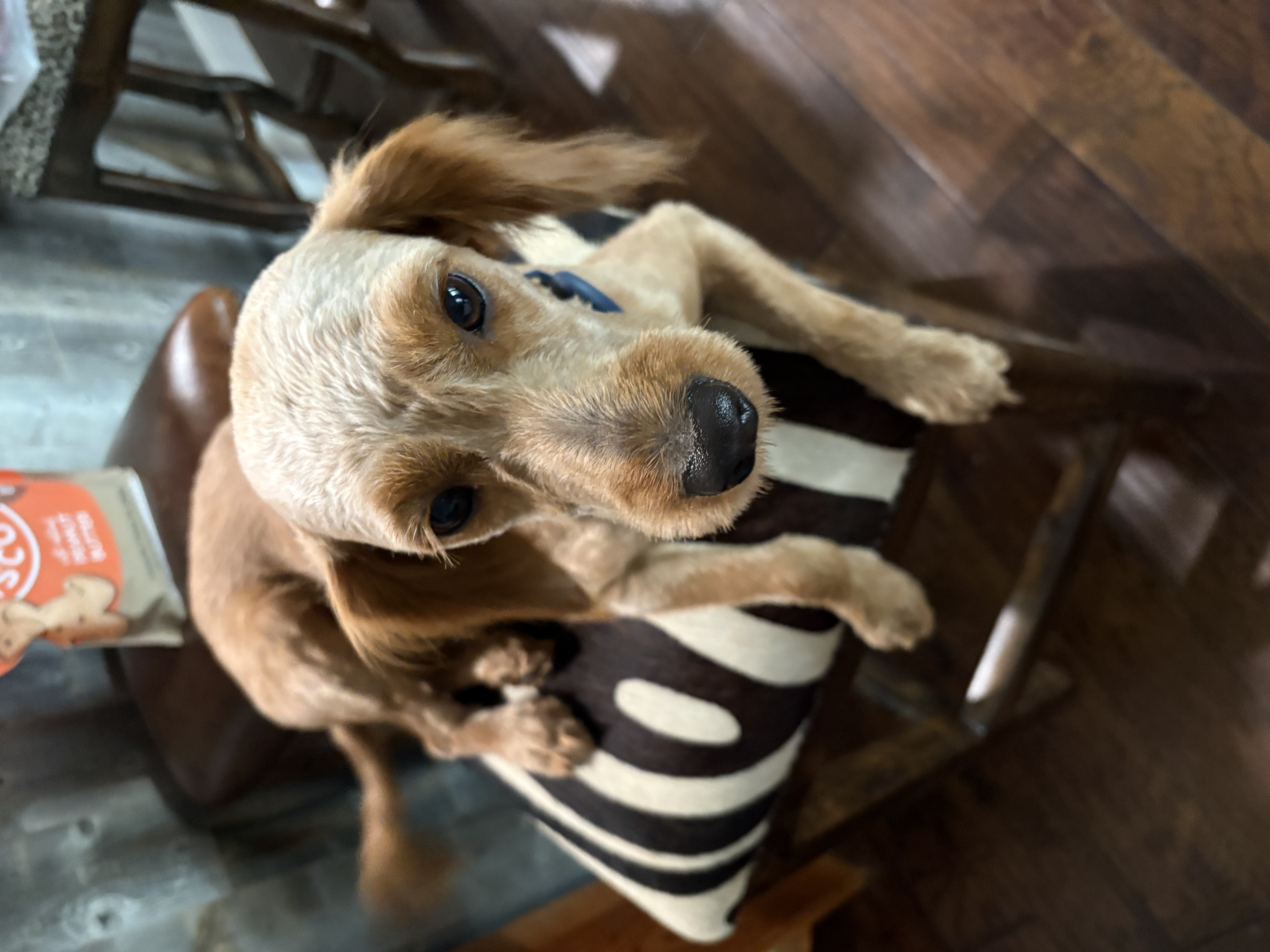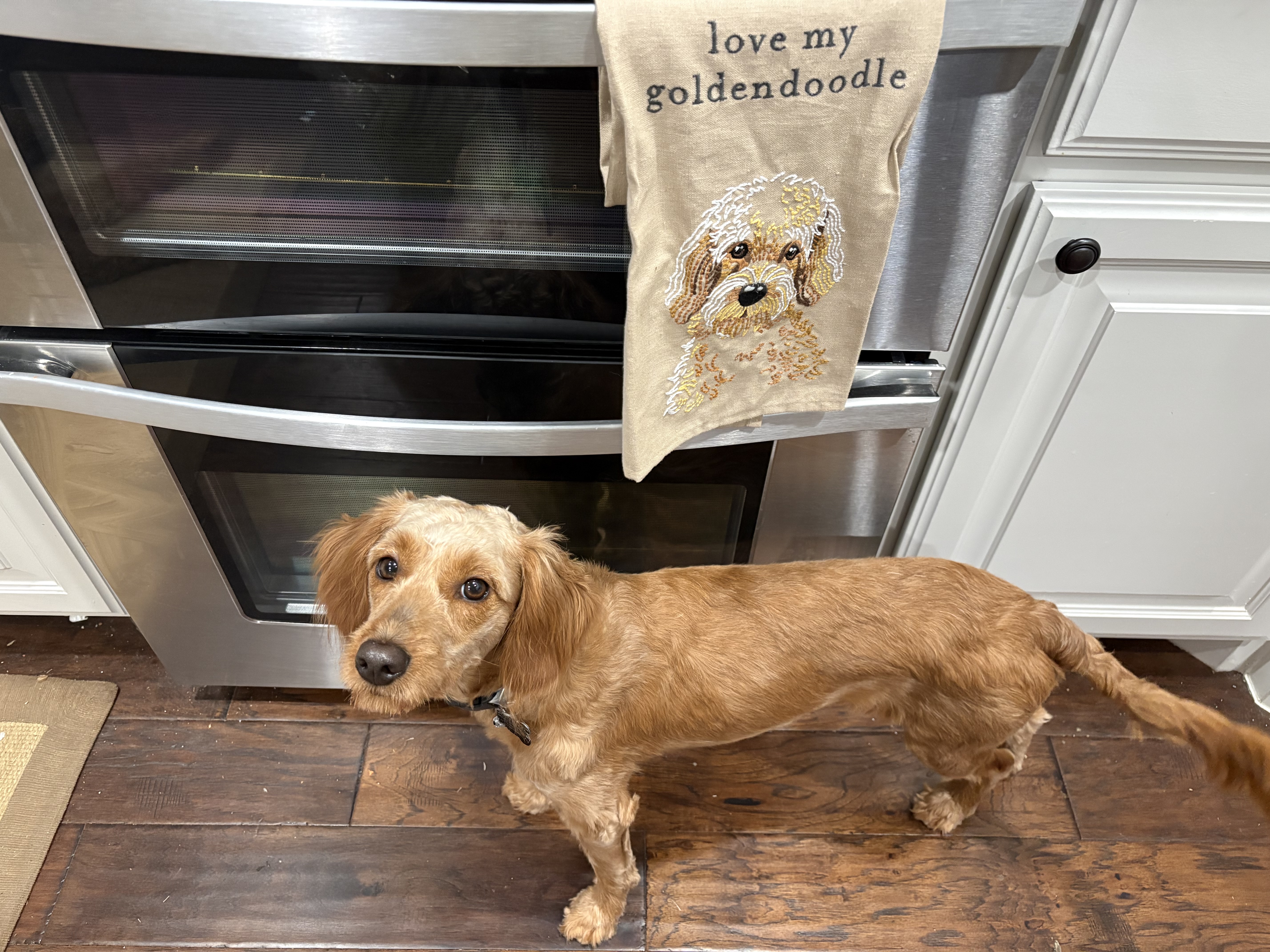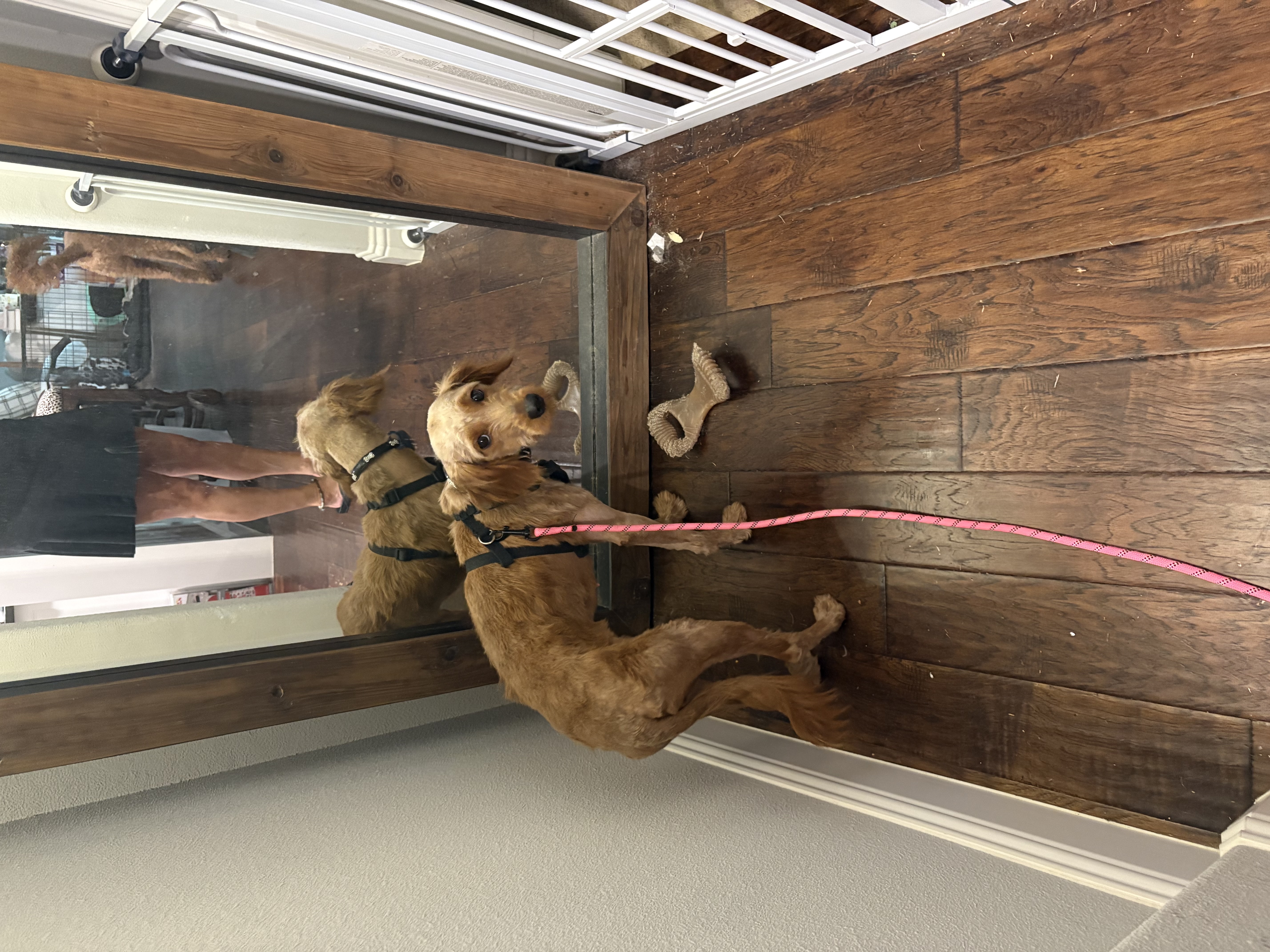 I’m a one-year-old mini Goldendoodle girl, weighing about 20 pounds and made up of long legs, soft curls, and an even softer heart. I may be “mini,” but don’t let that fool you—I’m mighty!