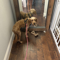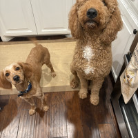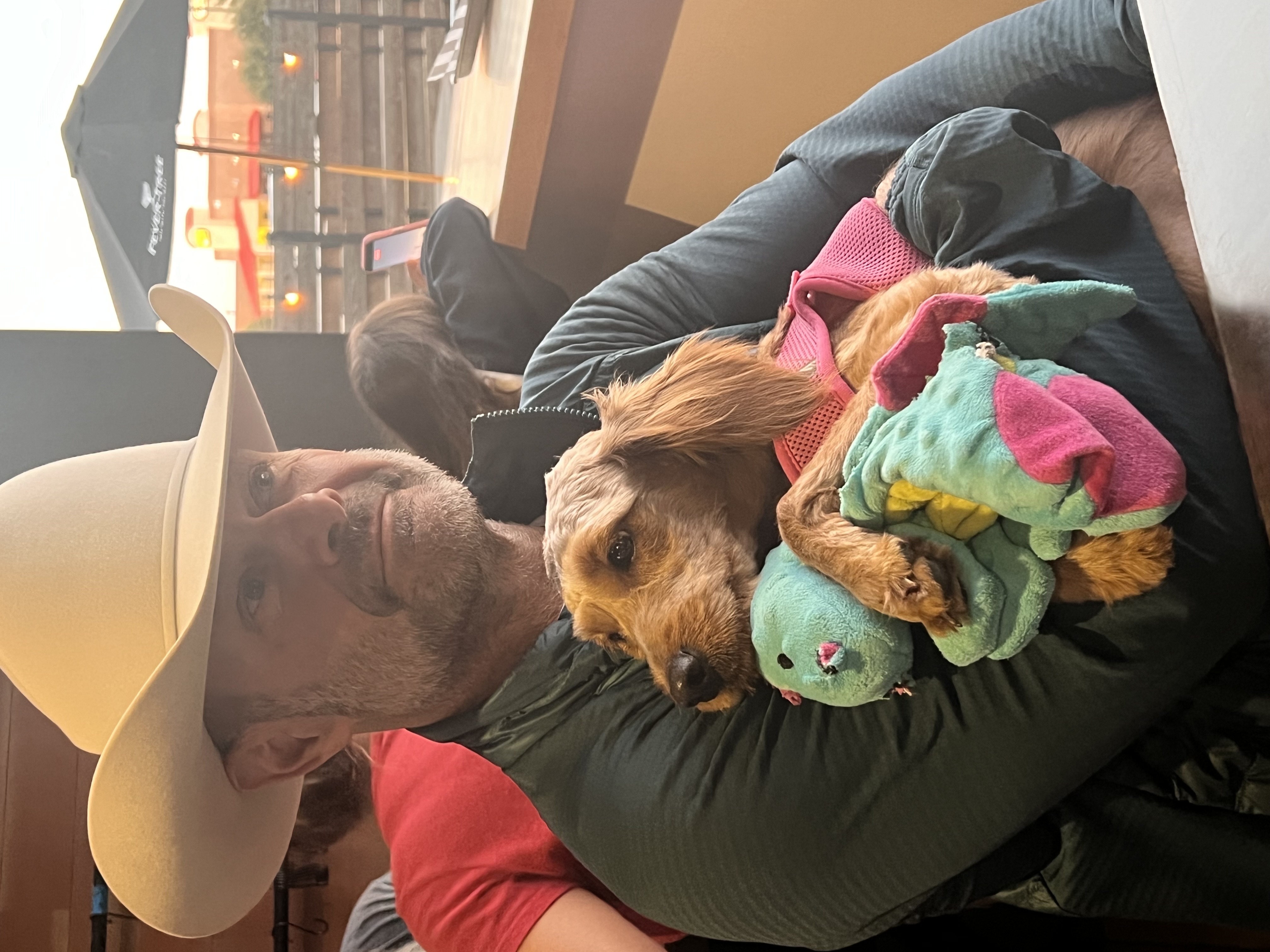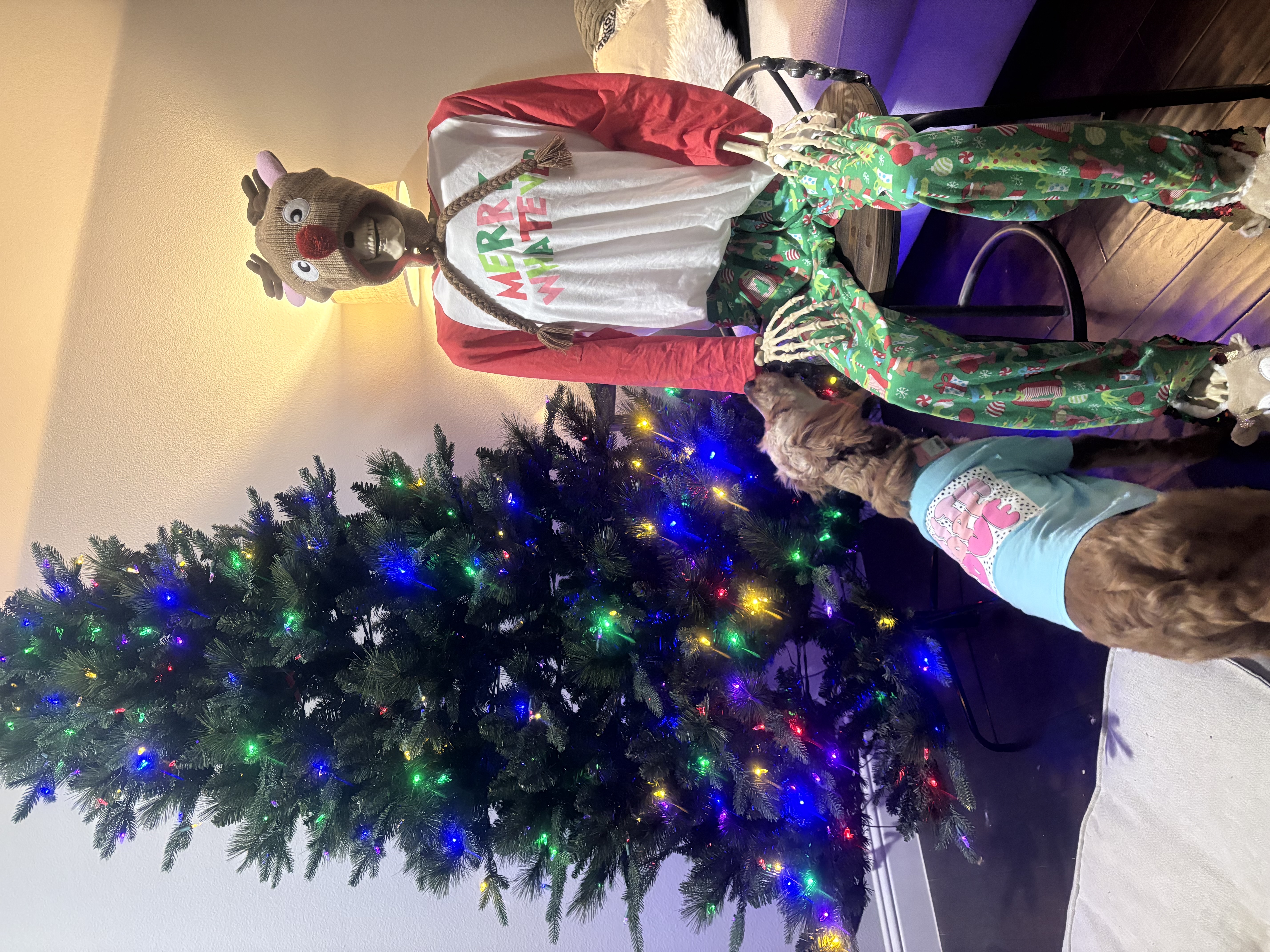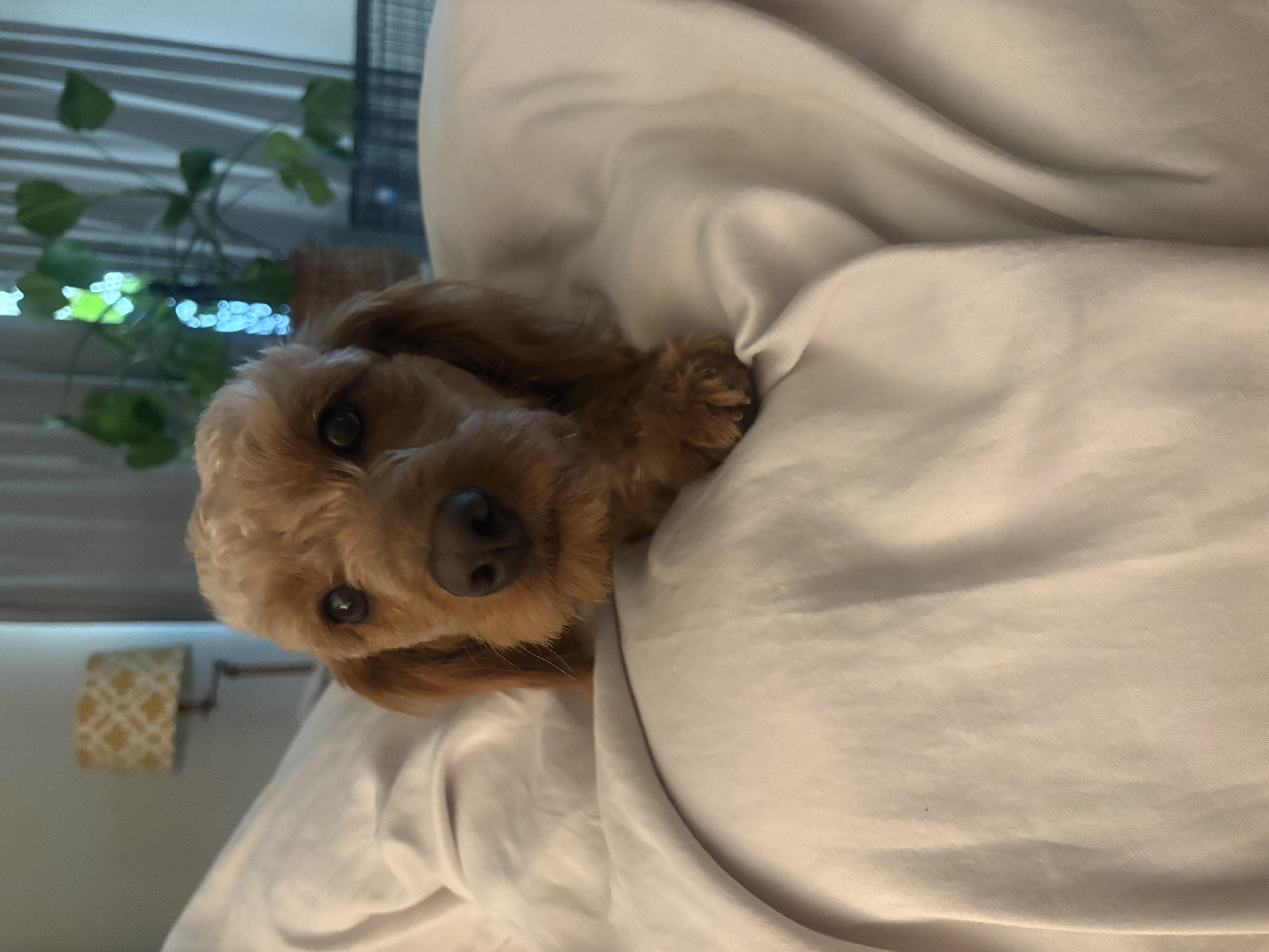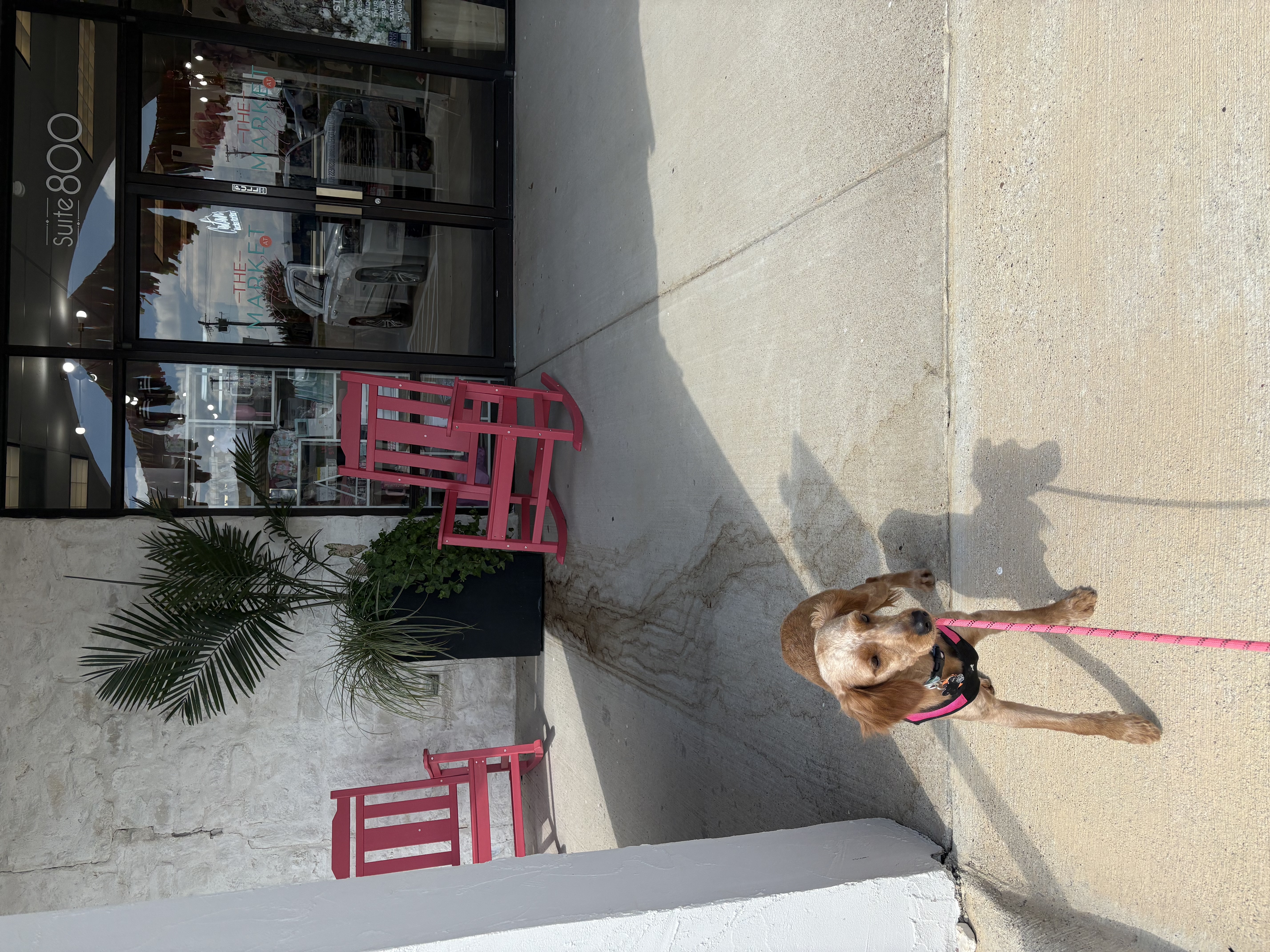 I’m a one-year-old mini Goldendoodle girl, weighing about 20 pounds and made up of long legs, soft curls, and an even softer heart. I may be “mini,” but don’t let that fool you—I’m mighty!