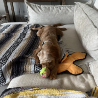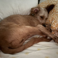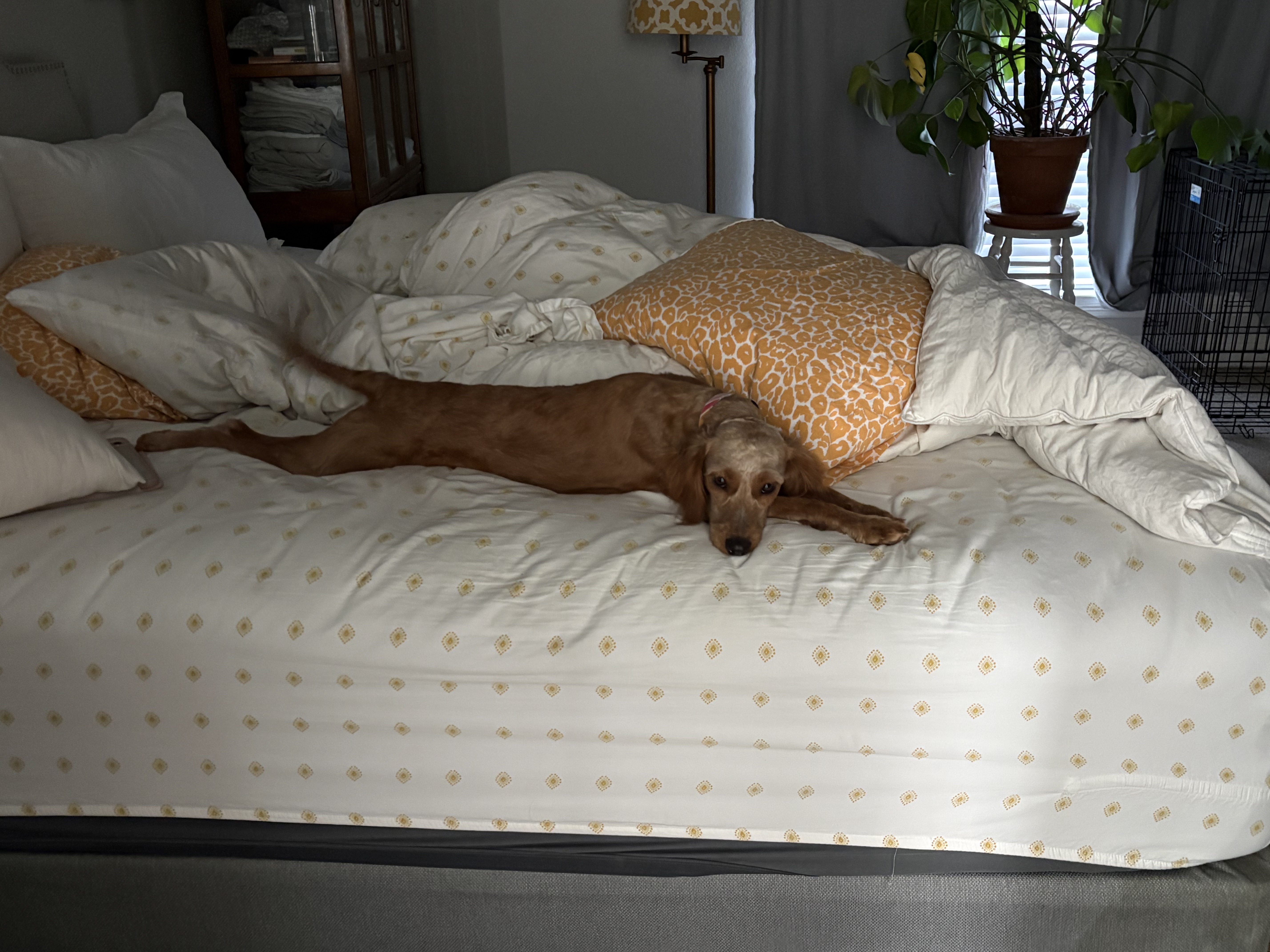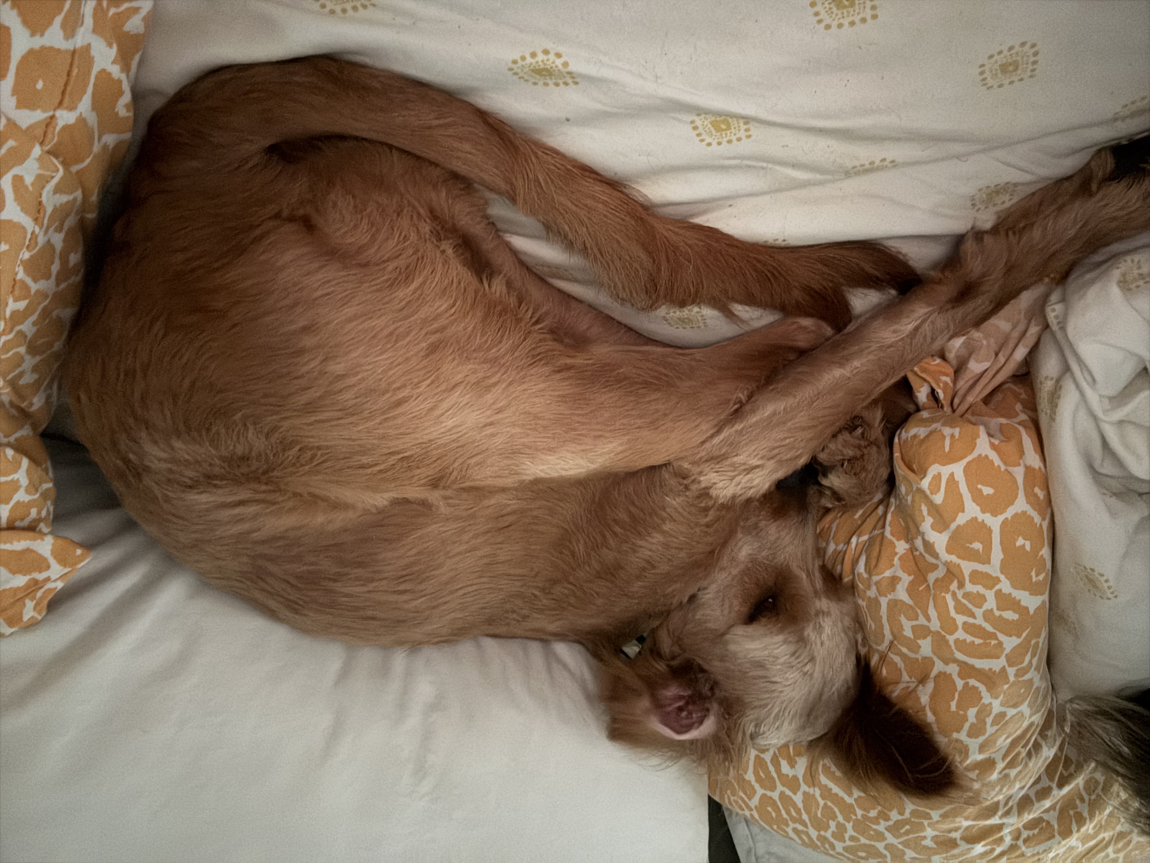 During the day, I’m a relaxed companion—happy to nap, take walks, or play a little fetch. Dinner is around 5:30, and by 9:00, I’m ready for bed. Once I’m tucked in—usually right on your pillow—I’m down for the night. I sleep hot but always like to be touching my person.