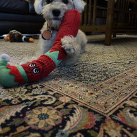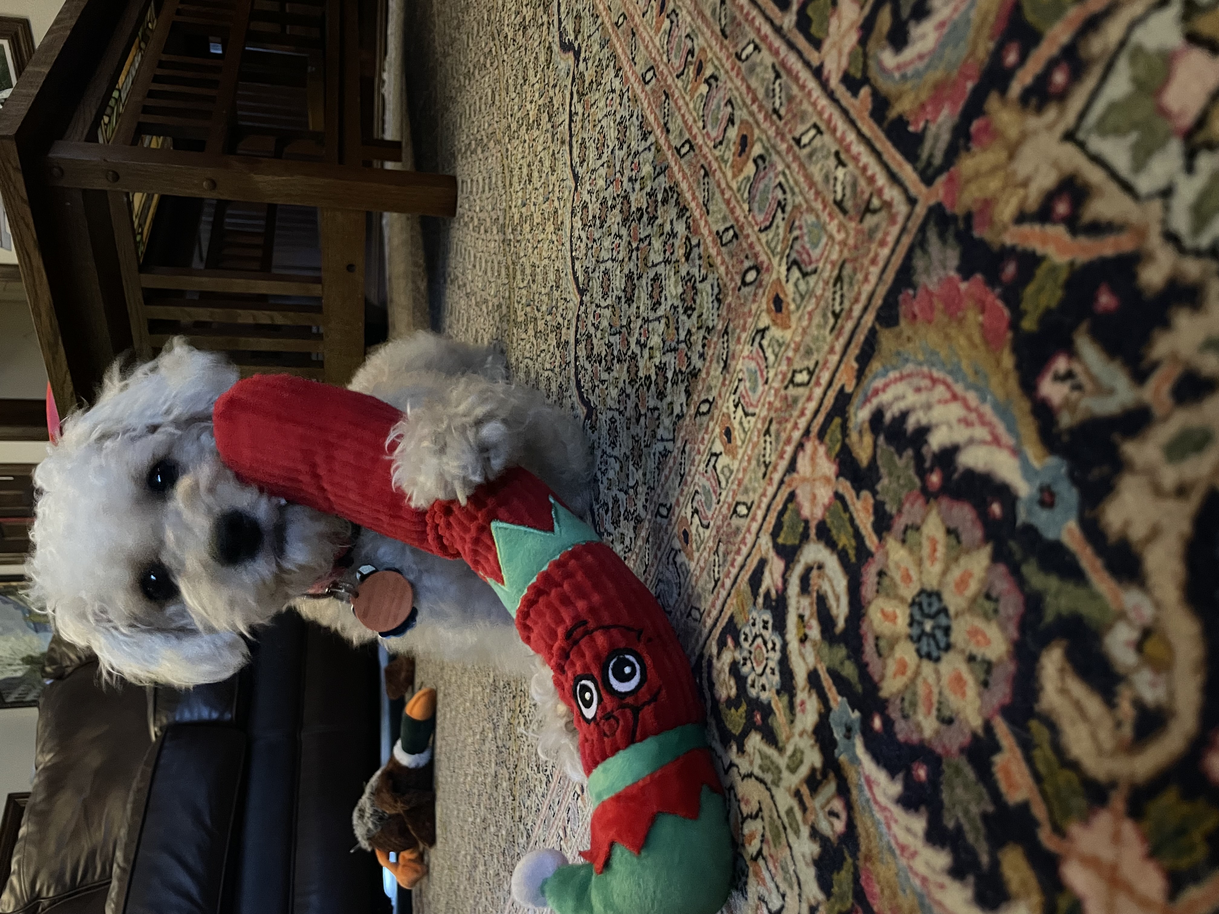I can happily relax and snuggle, but I also have lots of playful energy. Squeaky toys are my absolute favorite, and I enjoy playing fetch—even if I’m still learning how to share toys and attention. I love following my foster mom from room to room, and sometimes I let her know I miss her if she steps away.