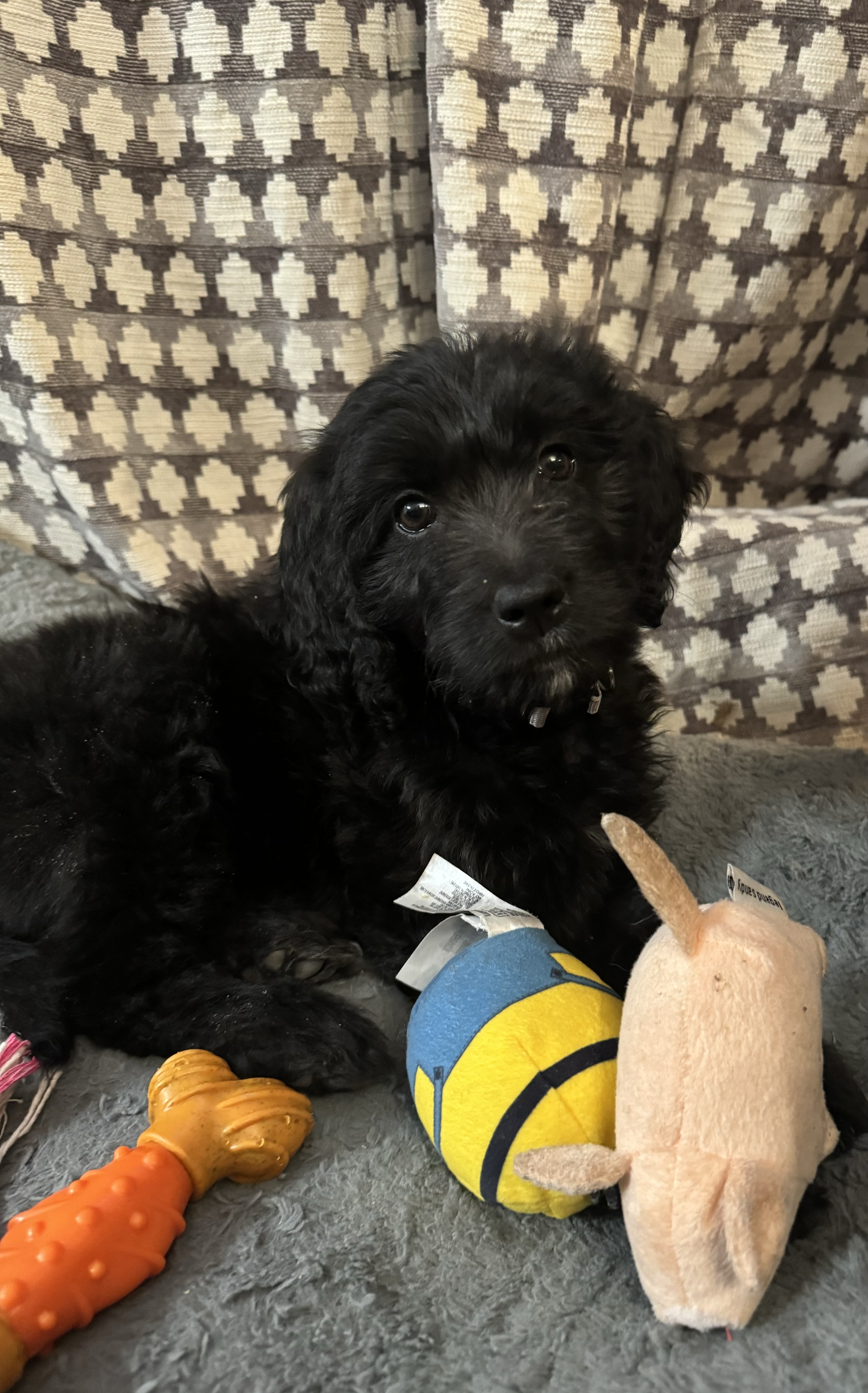 Hi, I’m Lola! I am a 3-month-old Female Goldendoodle puppy! My foster mom says I’m really sweet. I love affection and am very friendly. I’m a “happy go lucky” kind of girl. I like to play with my siblings, run in the yard, and cuddle up to sleep!