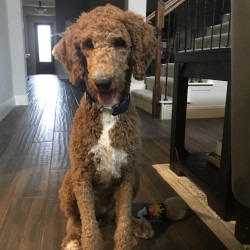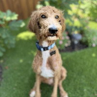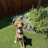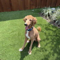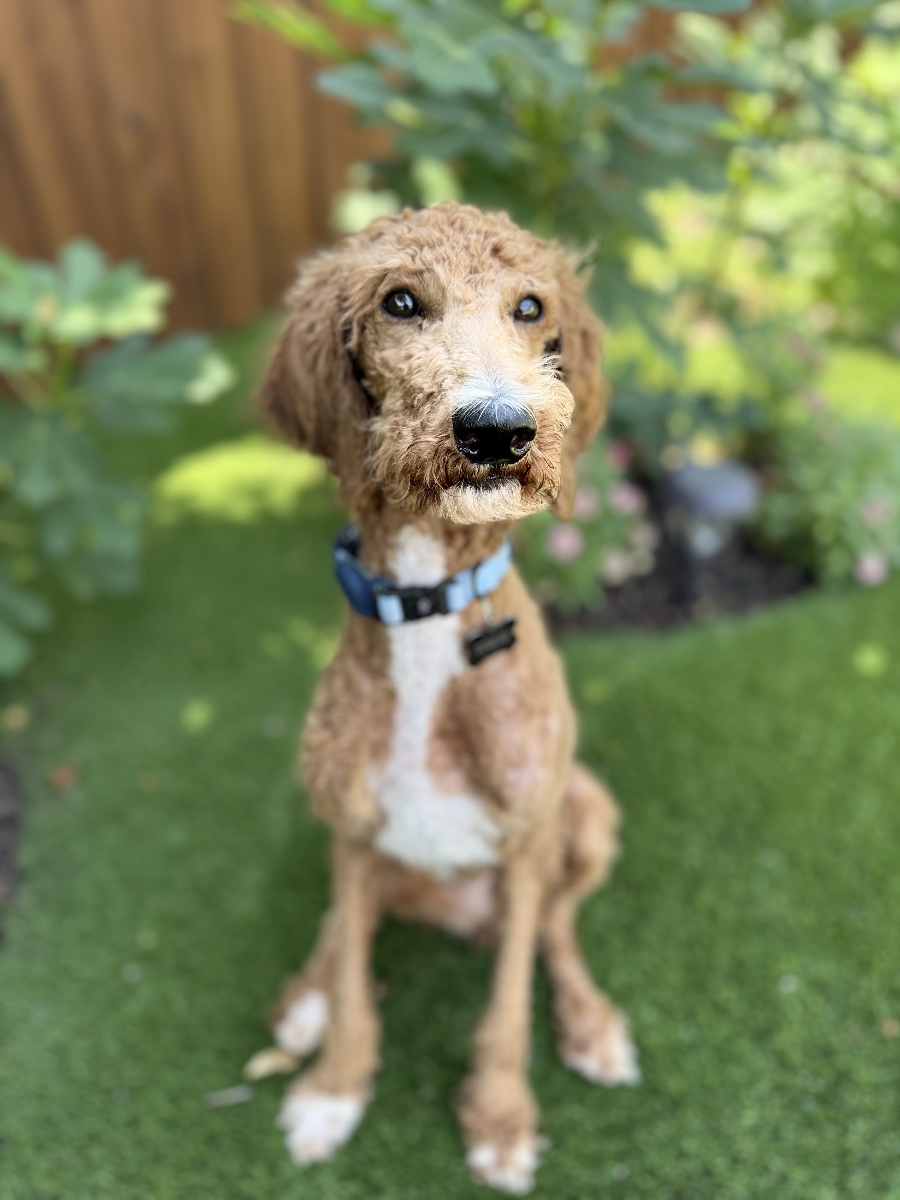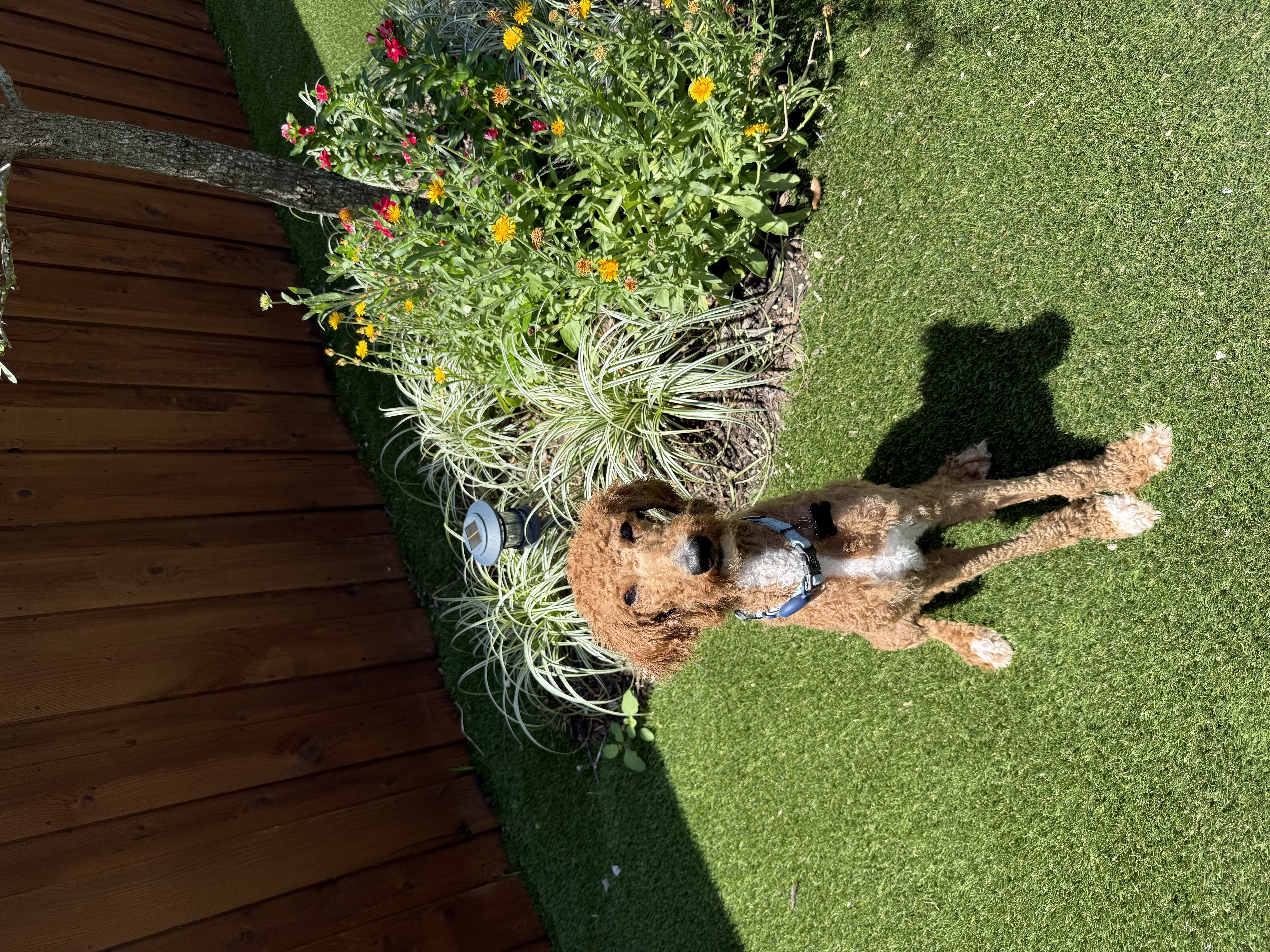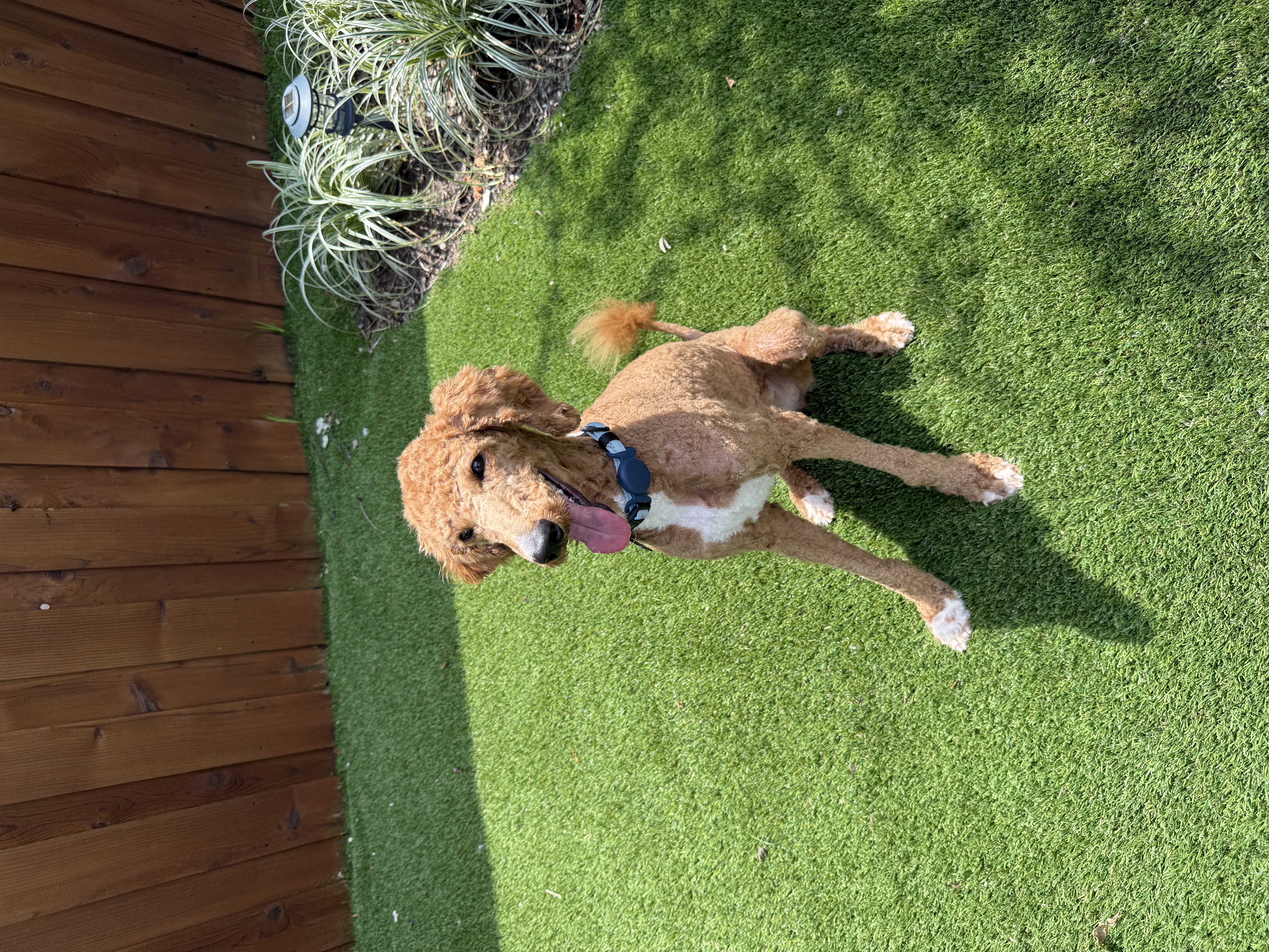 Hello, my name is Lottie! I’m a 40-pound, one-year-old poodle mix with soft, non-shedding curls, bright eyes, and a playful, curious spirit. I love being in the center of the action—whether that’s running around the yard, going on adventures, or simply soaking up affection. While I may be a little cautious in new situations, once I warm up, my fun-loving personality really shines.