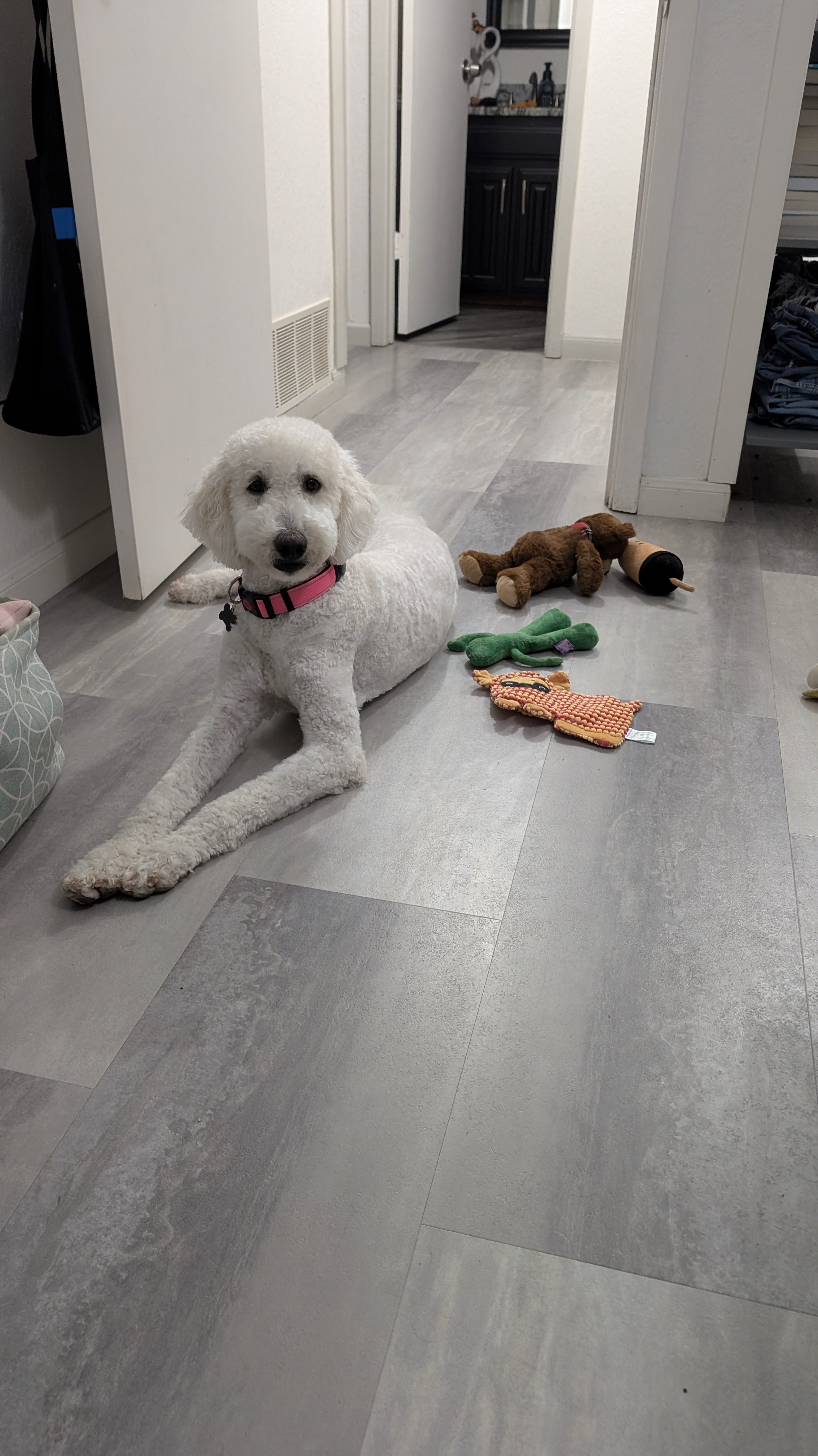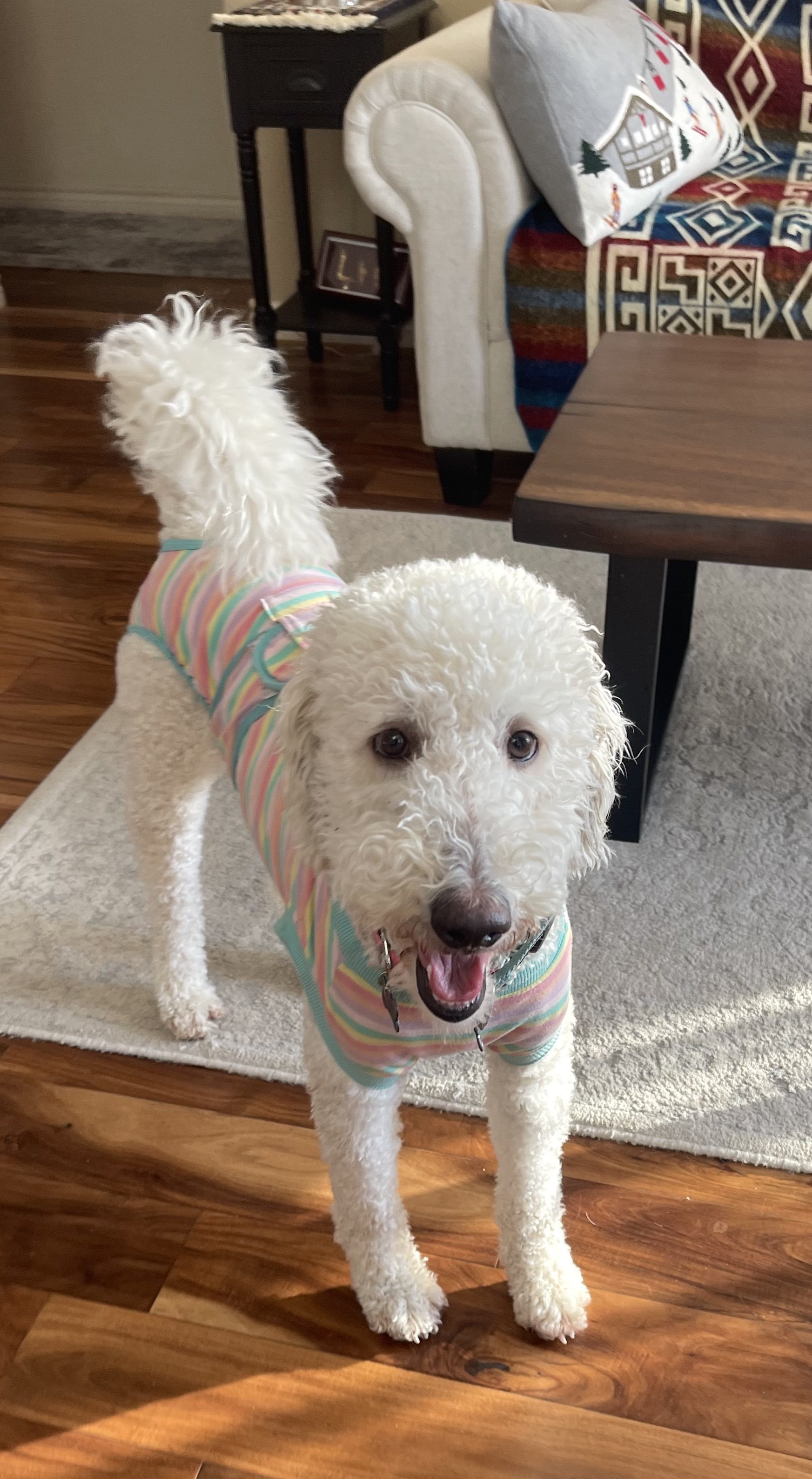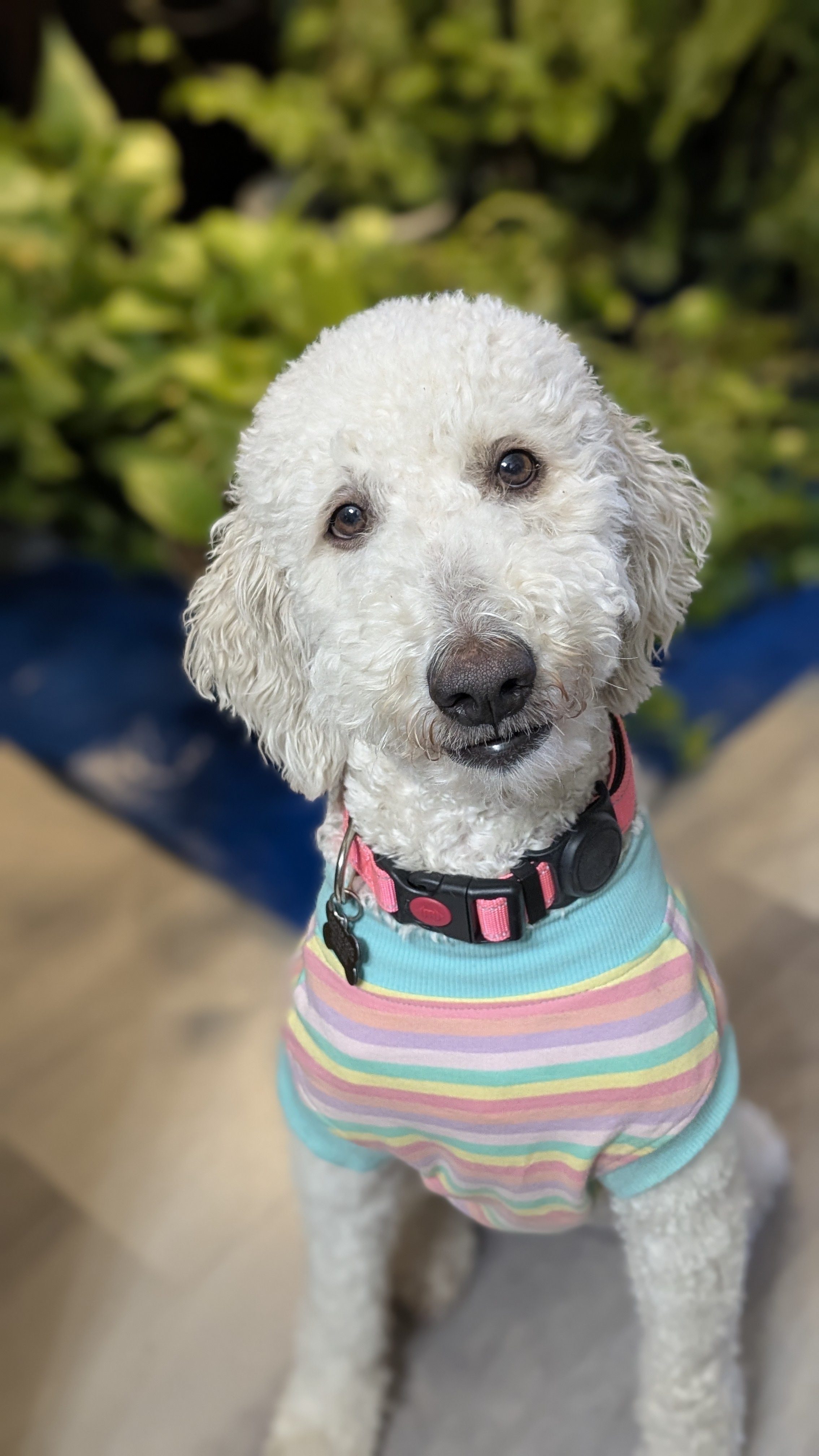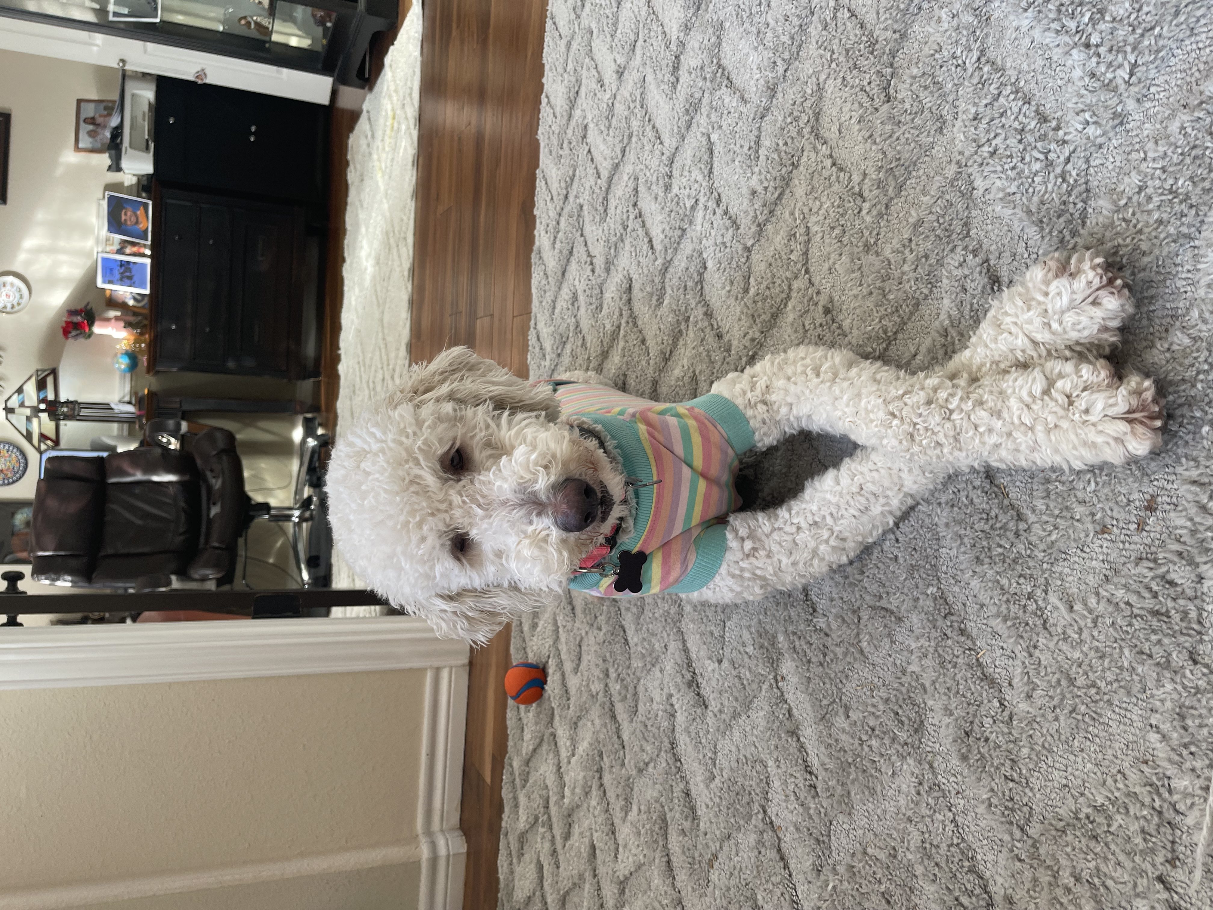 I’m a snow-white poodle mix with a big heart, a big personality, and so much love to give. When you walk through the door, I just can’t help myself. I jump, I wiggle, I talk, and I celebrate you like you’re the best thing that’s ever happened to me. I’m working on my “down” command, and I’m trying really hard, but sometimes my excitement just wins. I promise I mean well every single time.