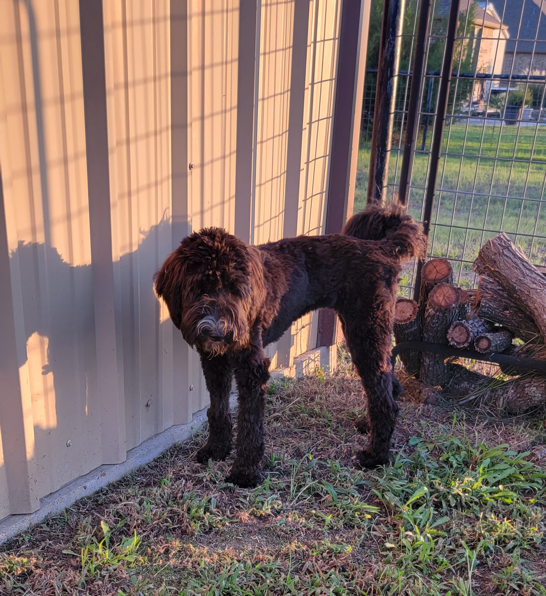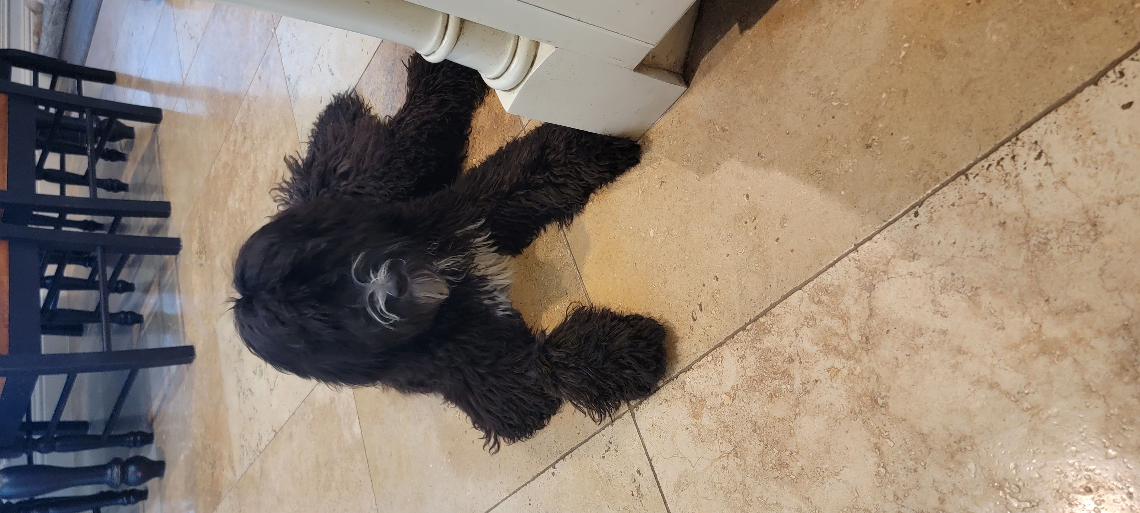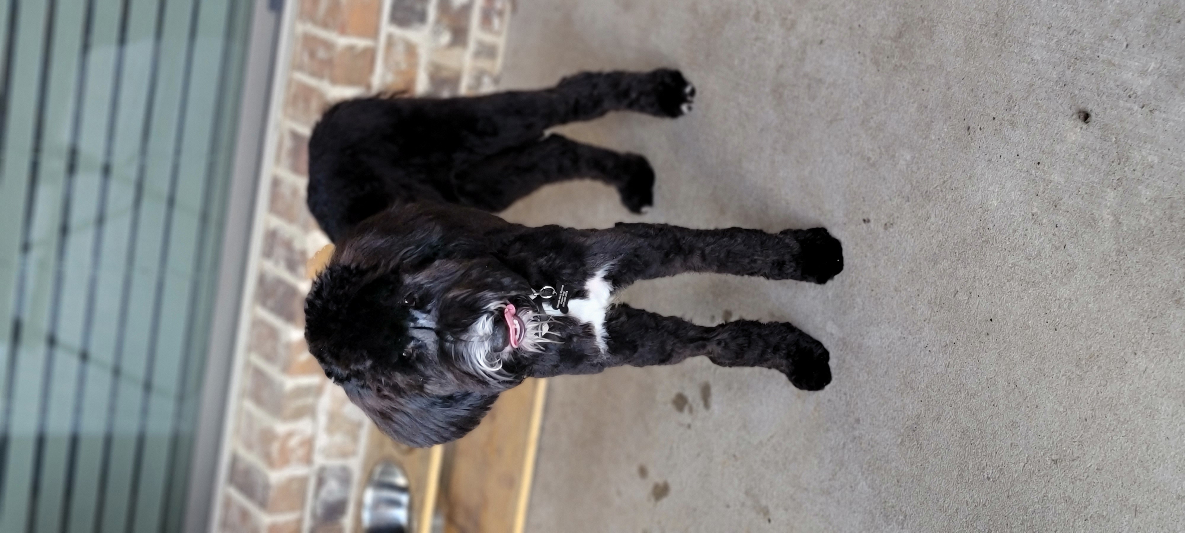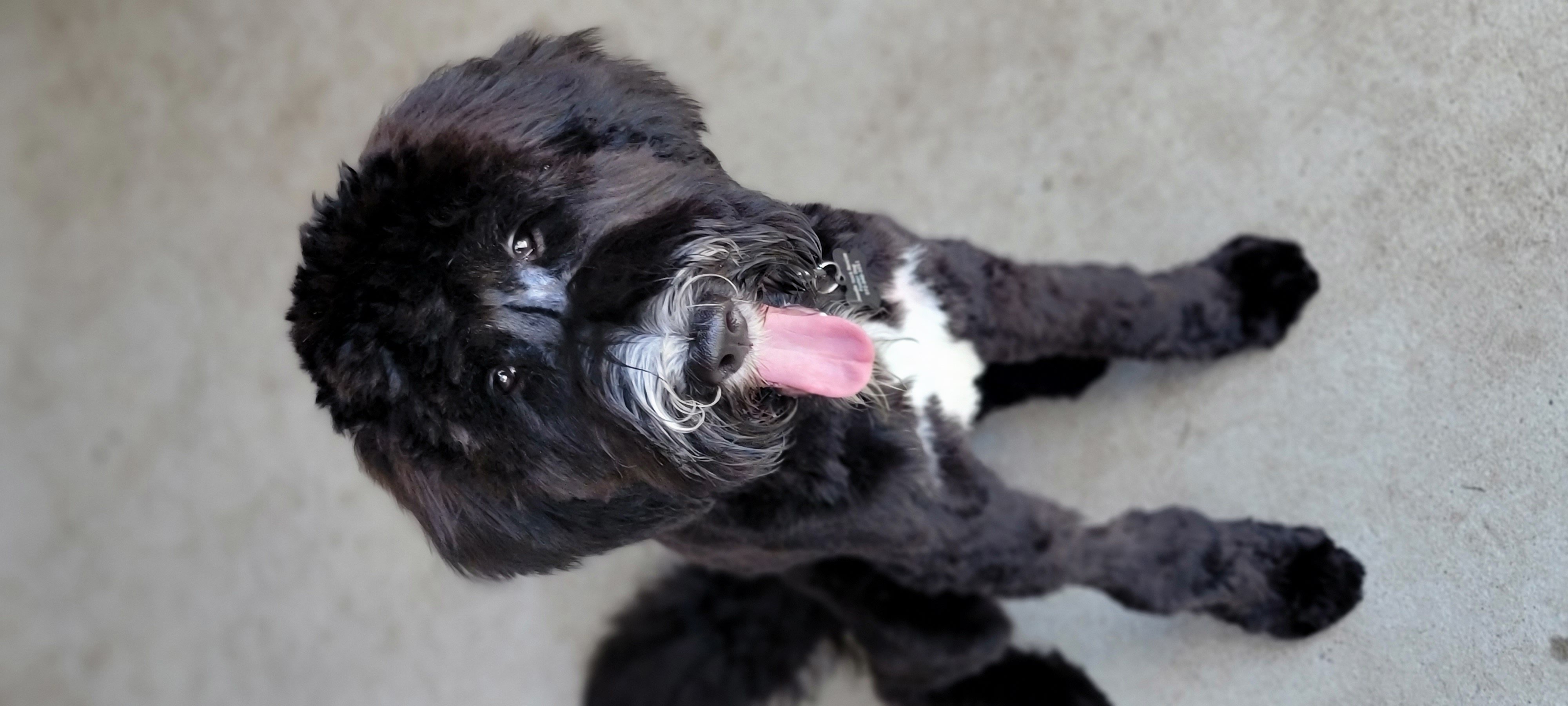 Hi! I'm Magnolia, a sweet 8-month-old, Female Sheepadoodle. I have super soft black fur with just a smidge of white on my nose, chin and chest. I weigh 21lbs, but I'm still growing.
