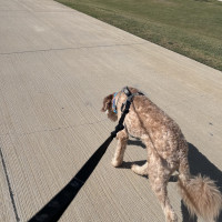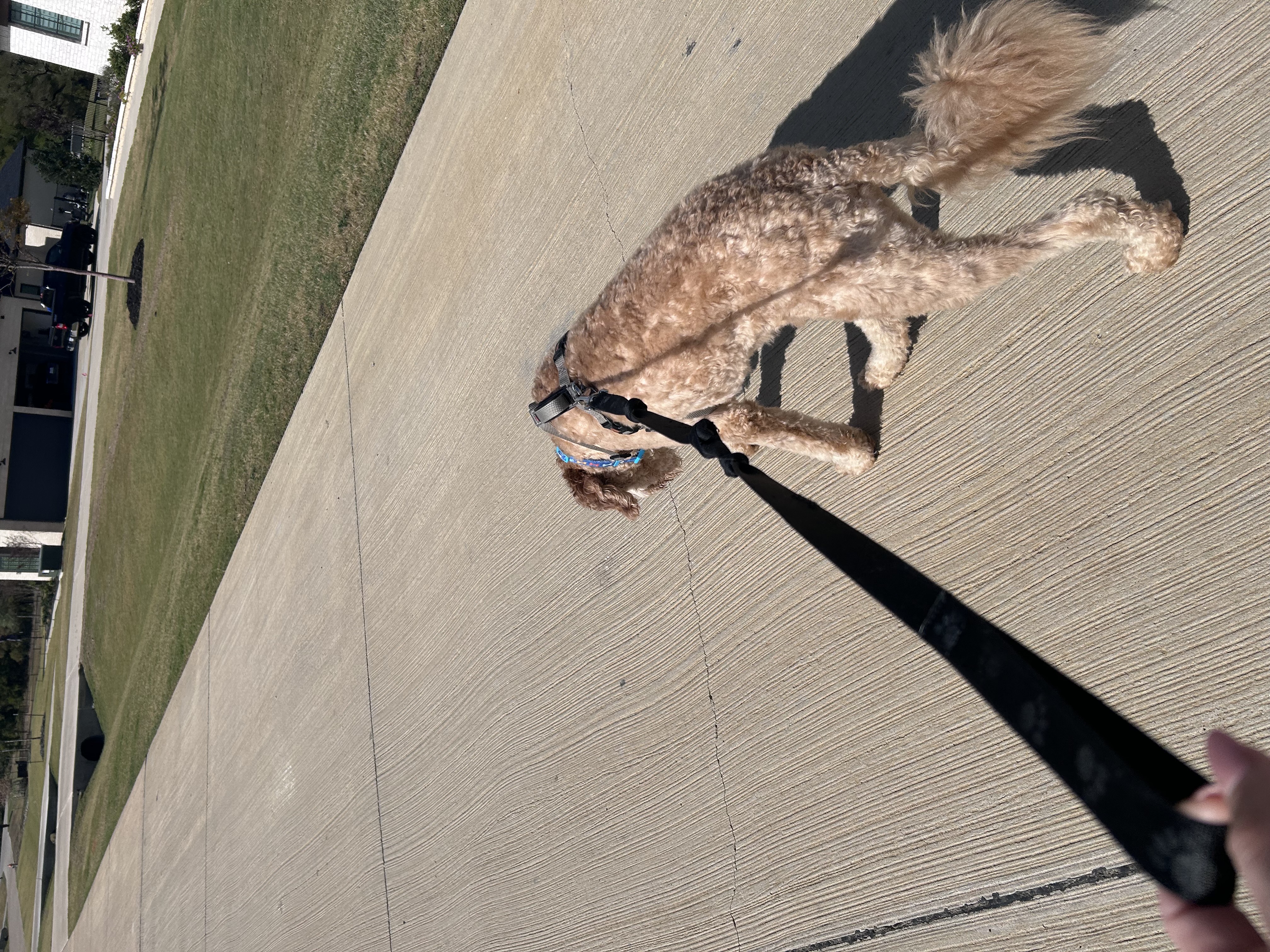 My days start early, around 5 a.m., when I head straight outside to potty, then I wait (very impatiently) for breakfast. I go into my crate around 6:30, and my foster dad lets me out again when he gets home around 9. After that, it’s a mix of playtime, wrestling, running around the yard, and napping with my dog buddies. Dinner is around 6:30, and bedtime is 8:30—with a quick snuggle in my foster parents’ bed before I settle into mine.