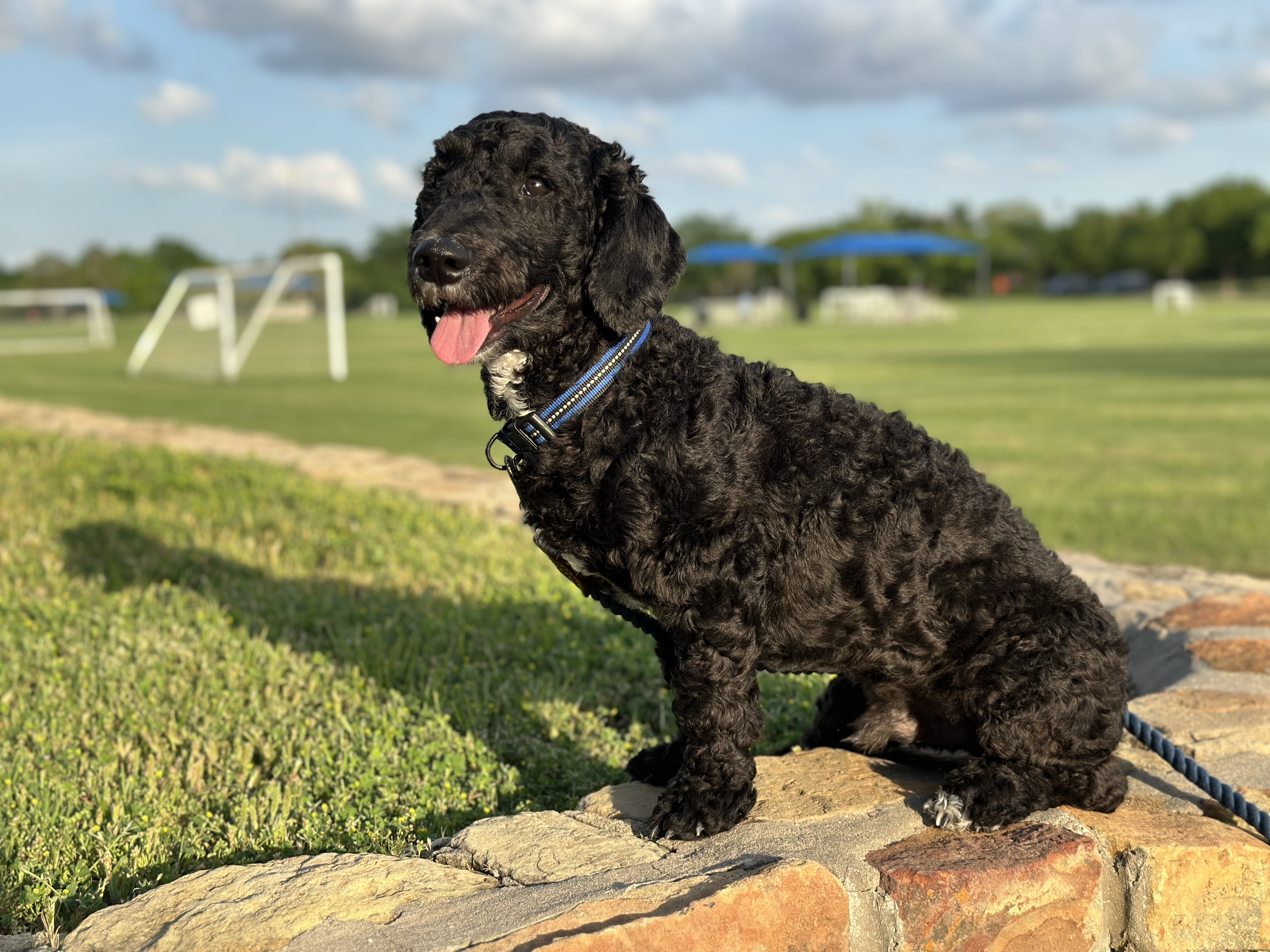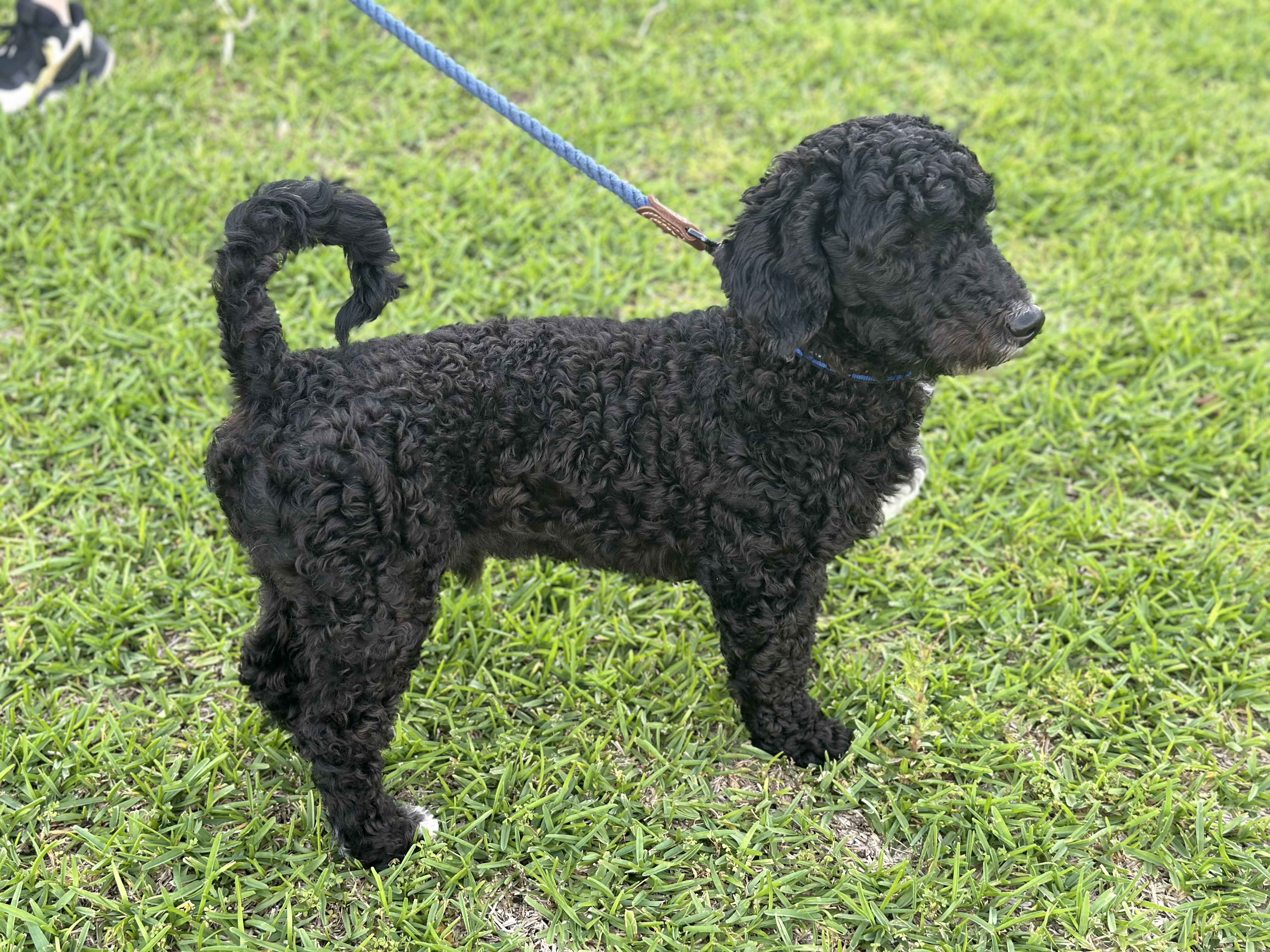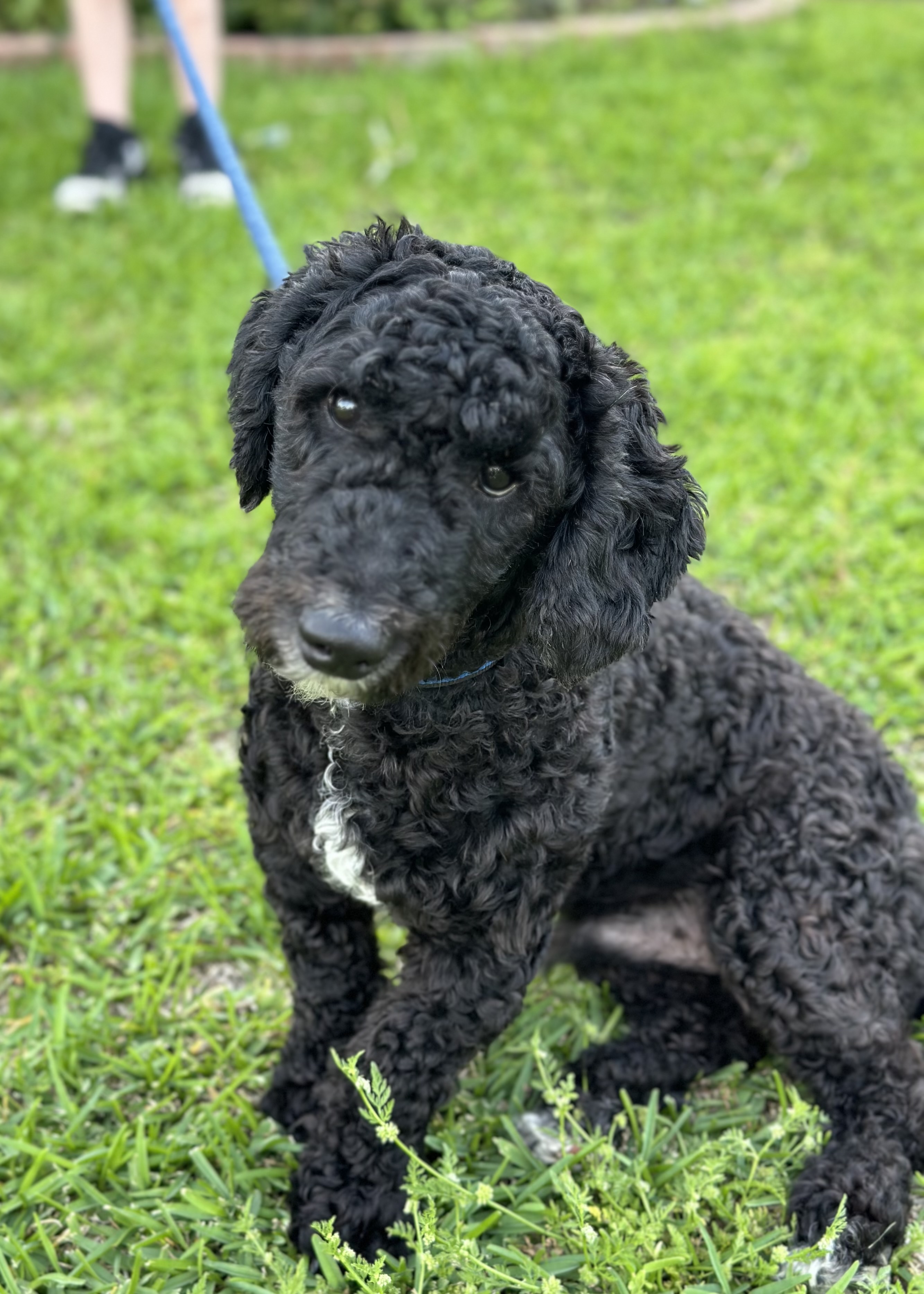 Hello, I’m Master Shifu (but my foster family members call me Otis). I’m an 8 month old poodle mix boy. I weigh 22 pounds. I was shaved upon being surrendered to DRR, but my curls are coming in nicely! I do not shed. I’m mostly black with white markings on my chin, chest, and back paws.