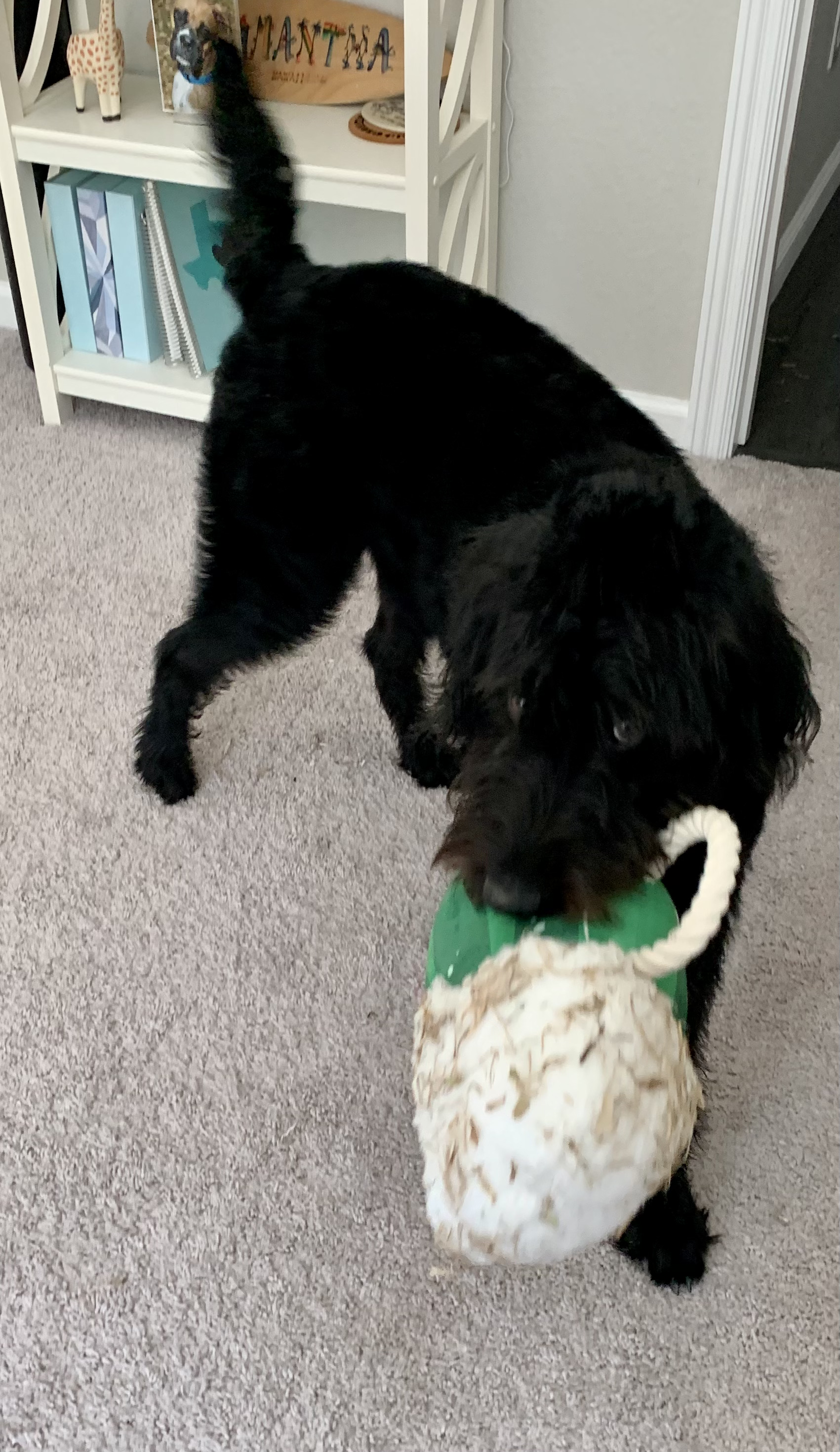 I’m an energetic oversized puppy. I would like to redecorate your home with all my toys! And yes I play with them all. I prefer playing over eating most of the time. Although I do counter surf if something is left out. I would love a fur sibling I can rough house with and a large yard to chase squirrels. I also LOVE a good game of tug of war! I know what toys I should play with, but sometimes a shoe or sock manages to find its way into my mouth. I will show you what I have and then want you to chase me. It’s something I’m working on. I don’t love my crate. I have no problem getting in with a treat, but will bark most of the time I’m in it. Luckily, I’m fully house trained and foster family only used the crate when they left for a few hours.