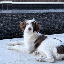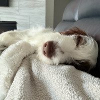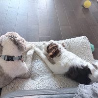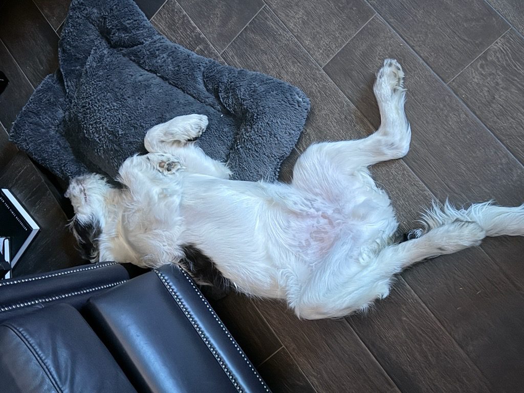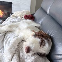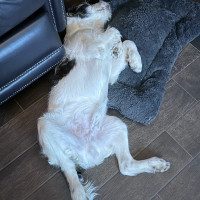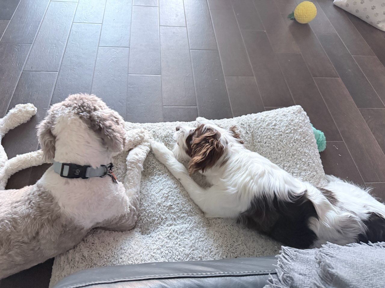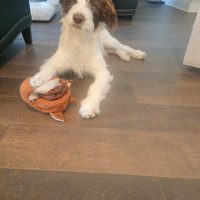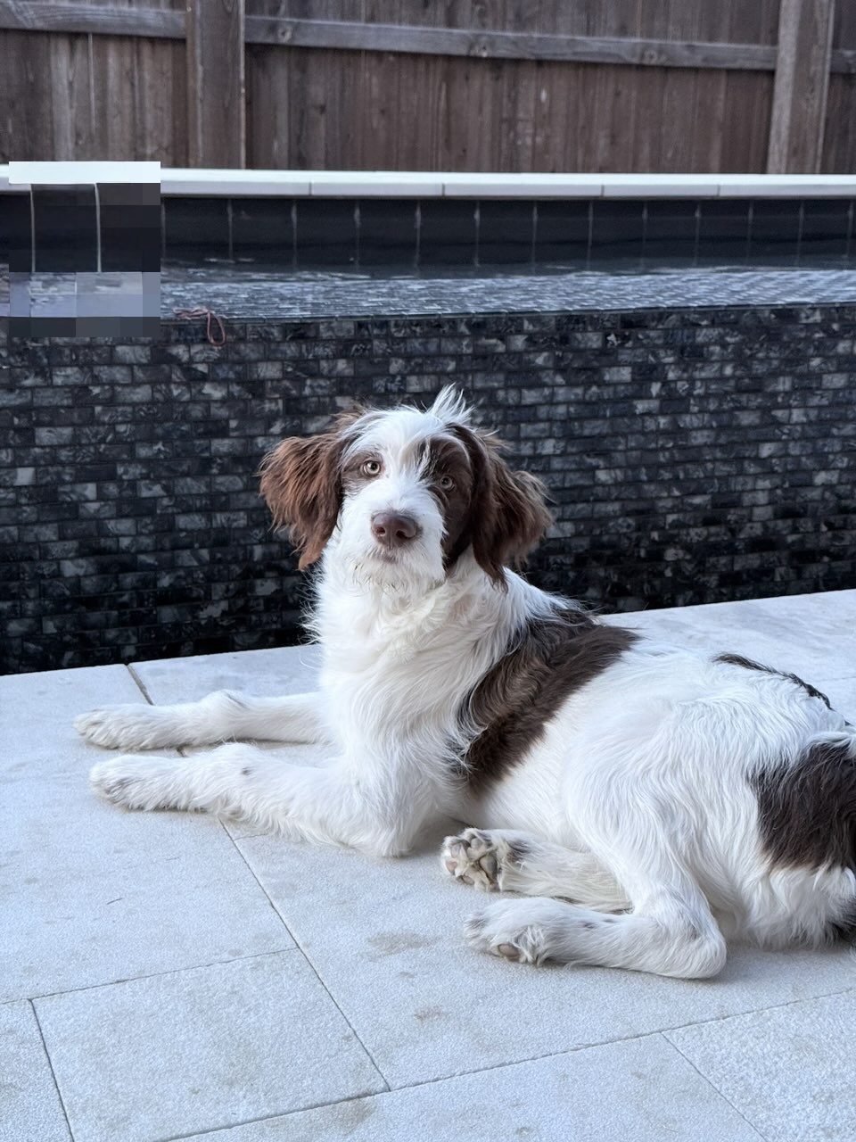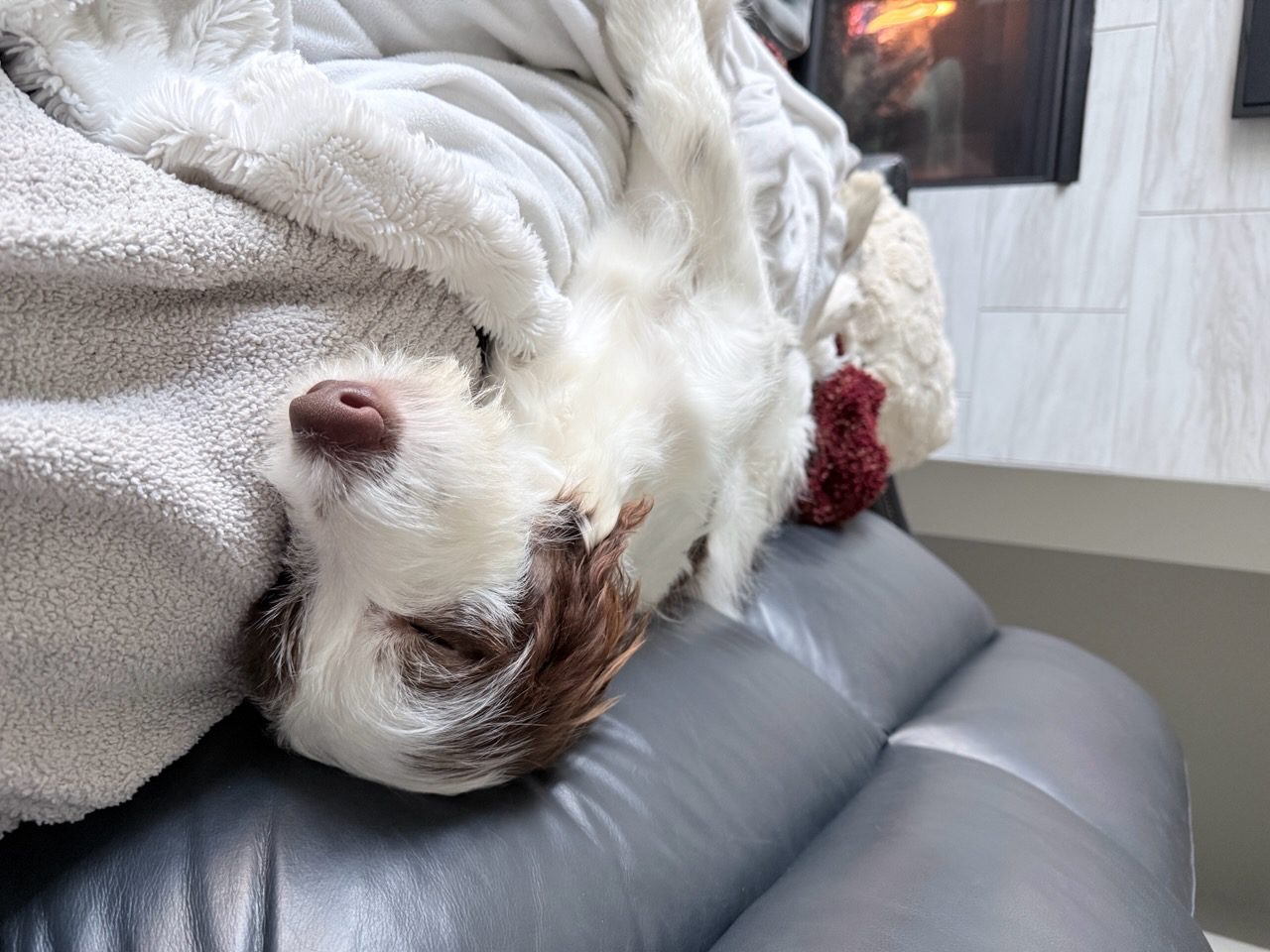 Hi, I’m New Balance, but my friends call me Newbie. I was born on October 5th and I’m one of the bigger boys from Matcha’s litter. My mama’s DNA came back 75% Poodle and 25% Old English Sheepdog, so I come from a smart, loyal, playful mix. I’ve got a fluffy coat, one eye framed in brown, the other bright white, and chocolate brown ears that make me look extra sweet.