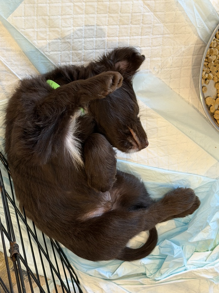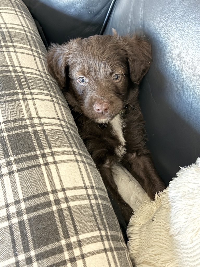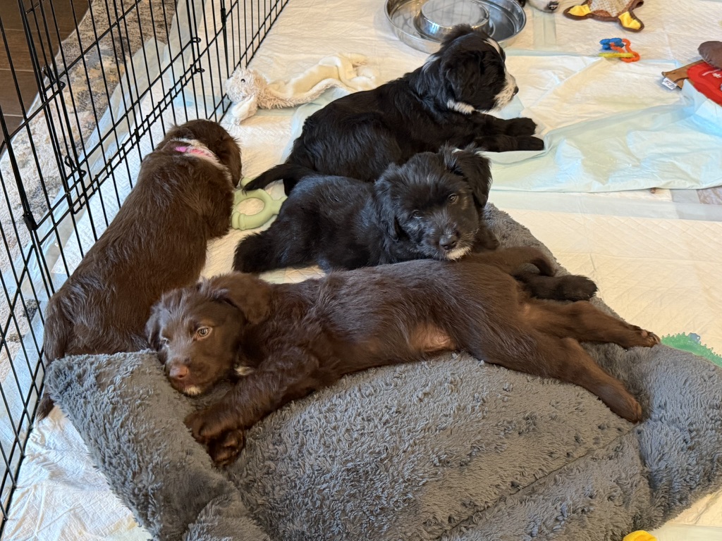 Hi, I’m Nike, and I’m one of Matcha’s boys born on October 5th. I’m a mid-sized pup with long legs and bright blue eyes that tend to stop people in their tracks. My breed mix is a bit of a mystery, but I likely carry some poodle and retriever from my mom, which might explain my thoughtful looks and gentle curiosity. I’m the kind of puppy who notices everything and wants to understand the world one step at a time.