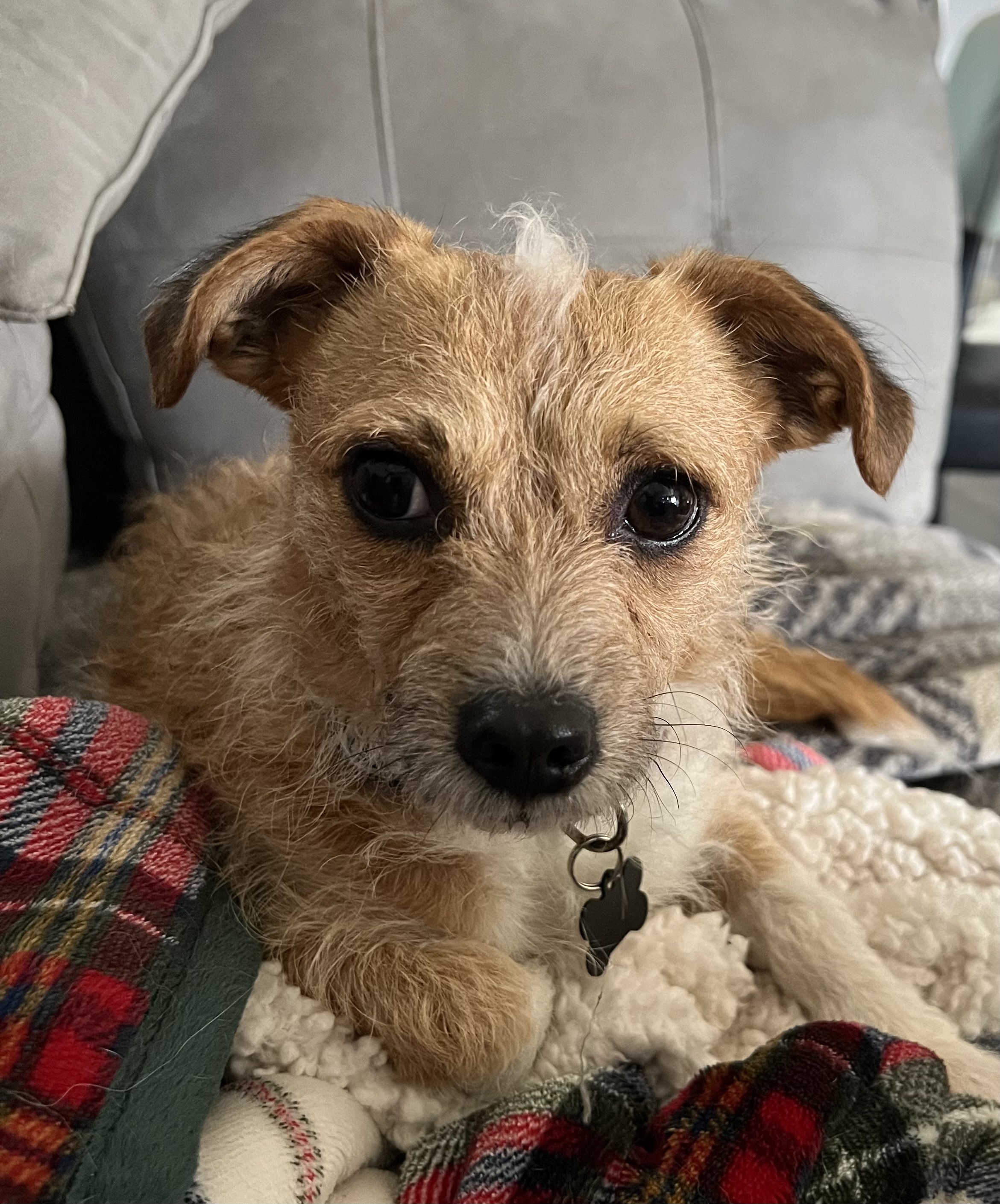 I am an absolute cuddle bug that enjoys the life of leisure lounging on the couch or on a big comfy dog bed. I do get spurts of playfulness where I will run around with my foster siblings. I walk great on a leash, no pulling! I will seek out affection from my people by putting my head on their lap. My coat makes me unique in that it’s curly and straight in other places. I have a tiny baby patch of hair on my head that looks like a Mohawk. I absolutely love belly rubs and am learning to like treats. At first I wasn’t sure what they were or what to do with them. I’m house (potty trained) and crate trained. I currently use a doggy door at my foster home,