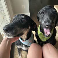 I’m the sweet and spirited one who loves being part of the action, whether that’s chasing toys, playing with other pups, or curling up for movie night. Odie’s the life of the party with his goofy charm—he might "borrow" your stuffed animals (don’t worry, he gives them back!) and he’s always ready for a game of chase or a cuddle session. We both love being with our humans and are happiest when we’re involved in family life.