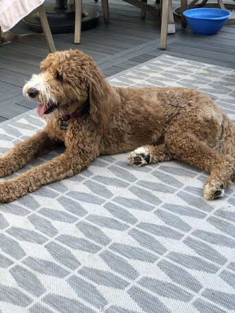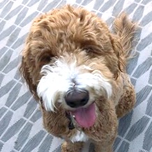 I am a beautiful, calm, apricot and white, female Goldendoodle. My fur is so soft you’ll never want to quit petting me. I weigh around 46 pounds and will be 3 years old in December. I currently party with my two dog friends at my foster Mom's house and we have a blast! I am playful and very sweet. I must have another dog to play with as I get lonely when you're not home and may cause trouble.