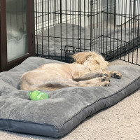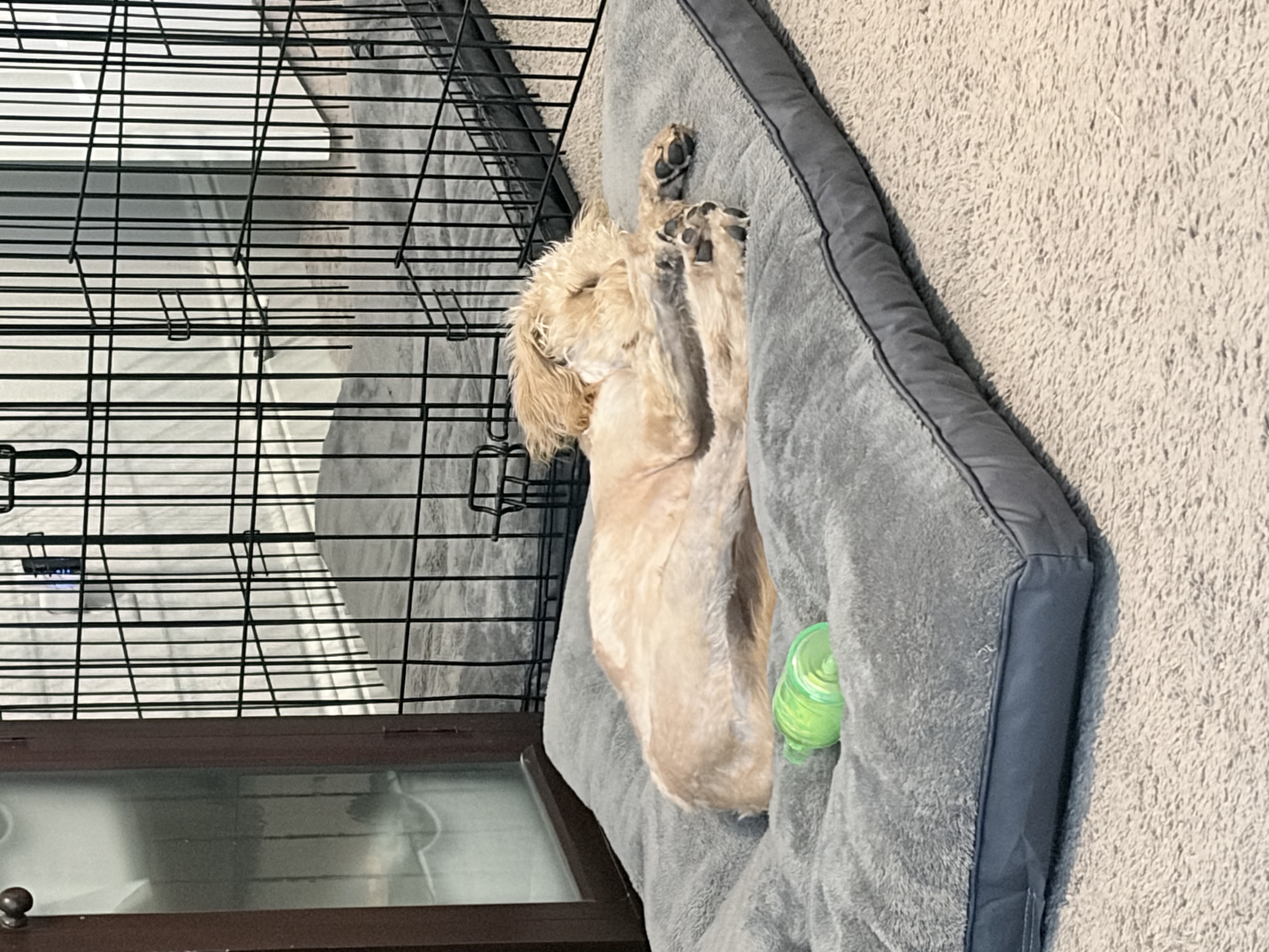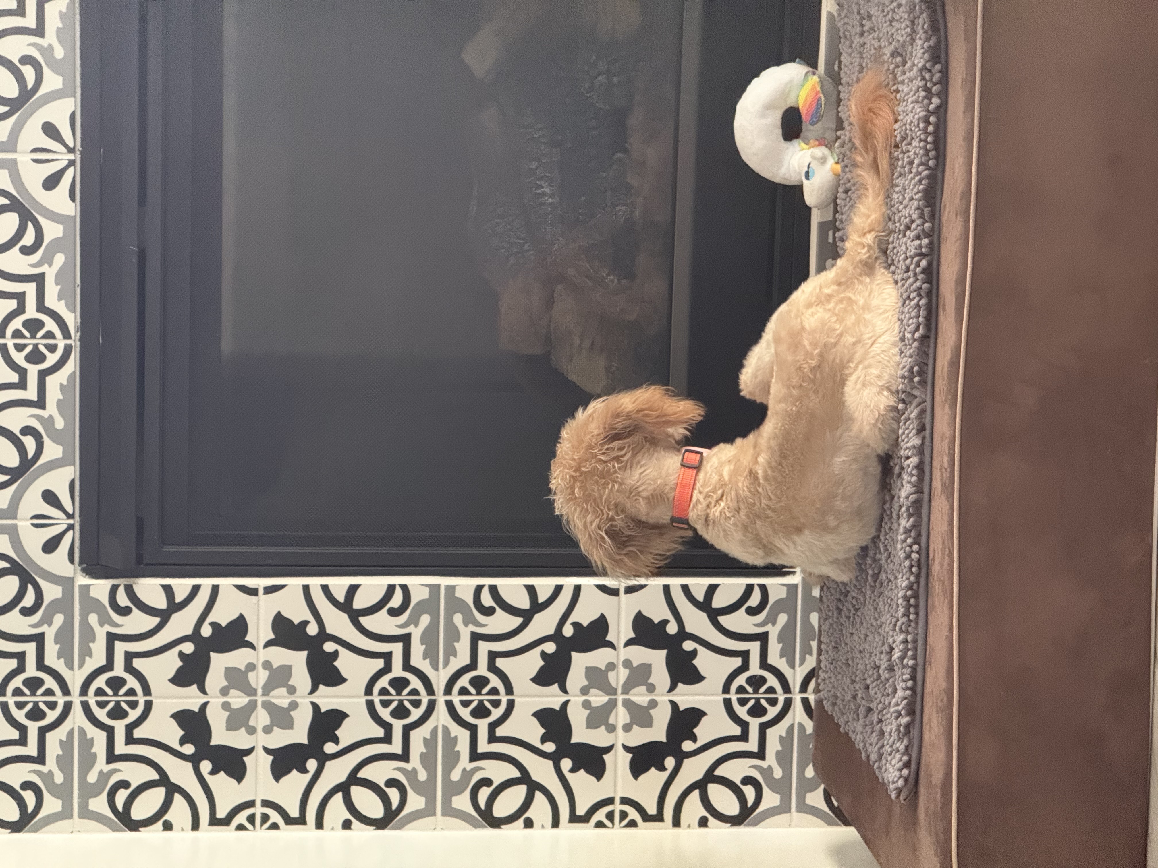 If I’m not power-napping, I’m looking for entertainment—attention from you, wrestling time with my foster brothers, or anything fun I can find. I wake up early at 5:30 for breakfast and morning playtime, then chill in my crate while the house wakes up. When my foster dad starts his day, I hang out in his office, alternating between toy time and guarding the yard from imaginary burglars. At 4:30, I’m ready for my big energy burst outside, followed by dinner and more backyard adventures. By 7:30 I’m tucked into my crate with a treat, and asleep by 8, like the good girl I am.
