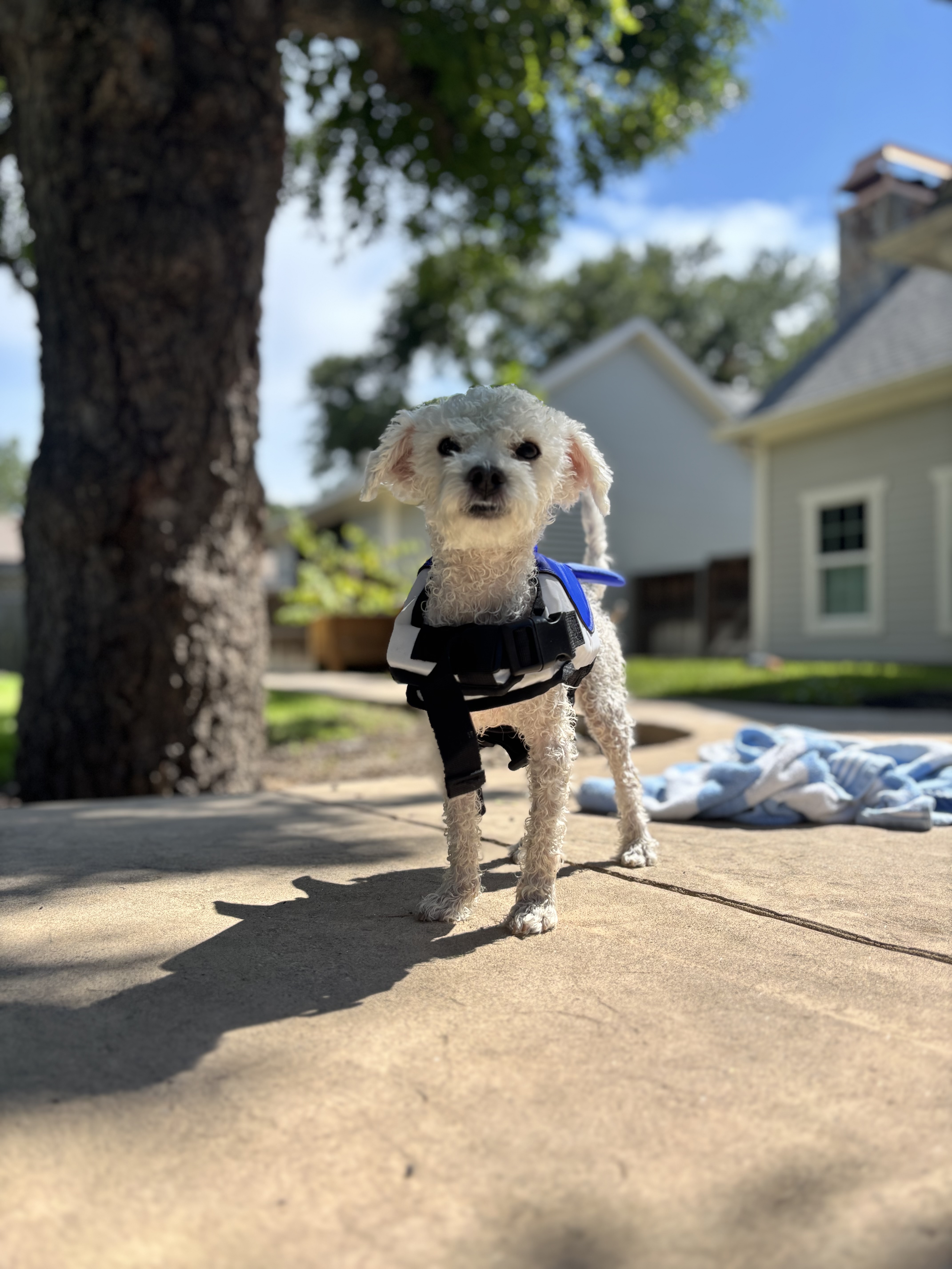I wake up bright and early around 6am, head outside for a potty break, and then wait patiently (okay, maybe not *too* patiently) for breakfast at 8am. After that, I clock in as my foster dad’s pint-sized office assistant, making sure to check in regularly for hugs and moral support. I’m still mastering potty training, so I like to go outside often—I’m getting the hang of it, one grassy success at a time.