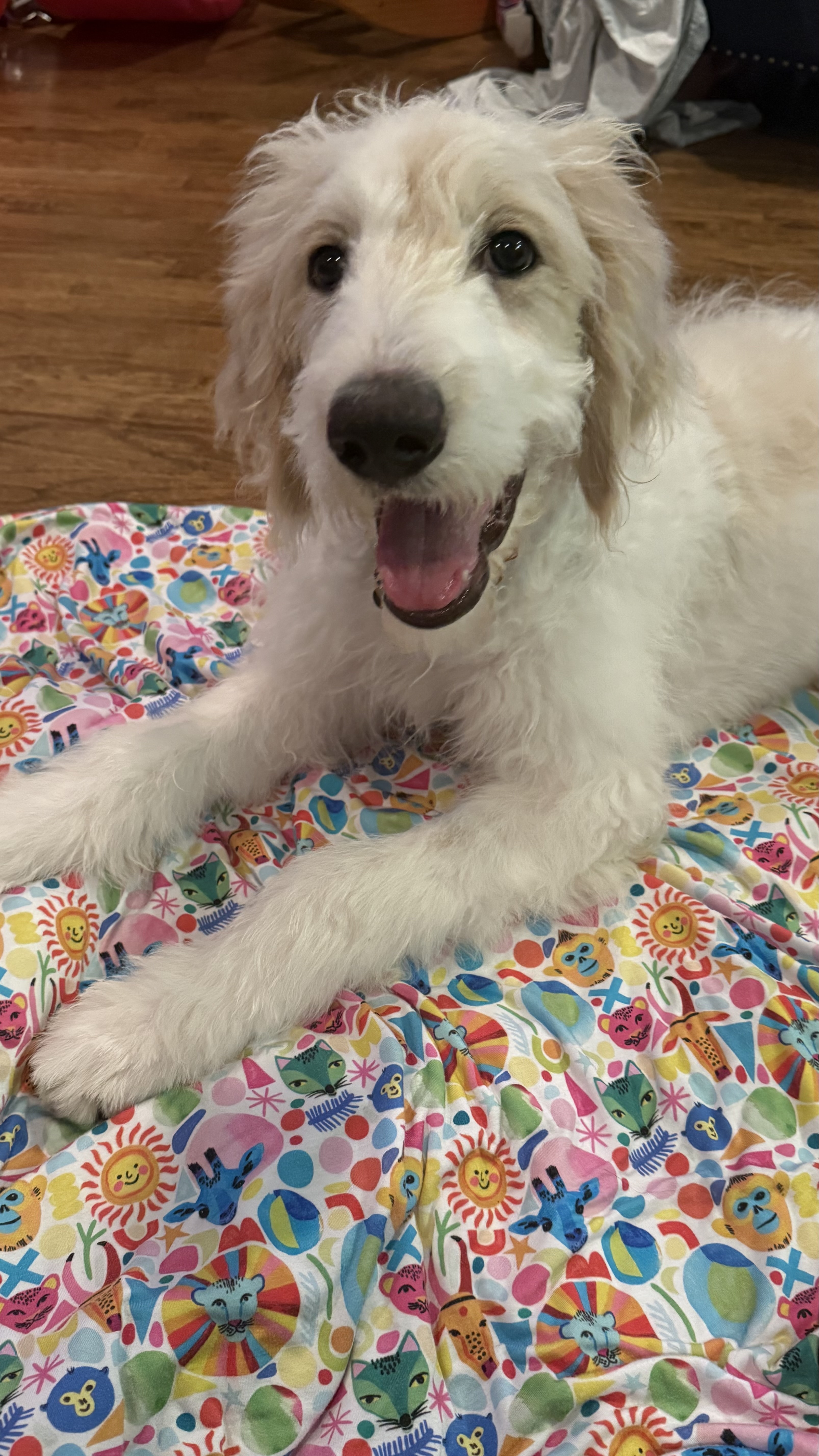 Hi, I’m Peanut Butter — but my foster family calls me Peanut, or Mister Peanut when I’m being especially ridiculous (which is most of the time). I’m a 4–5-month-old Pyredoodle with legs for days, ears that still haven’t caught up with my head, and paws that say I’m destined to be a big boy. Basically, I look like a baby giraffe in a fluffy coat — and yes, it’s as entertaining as it sounds.