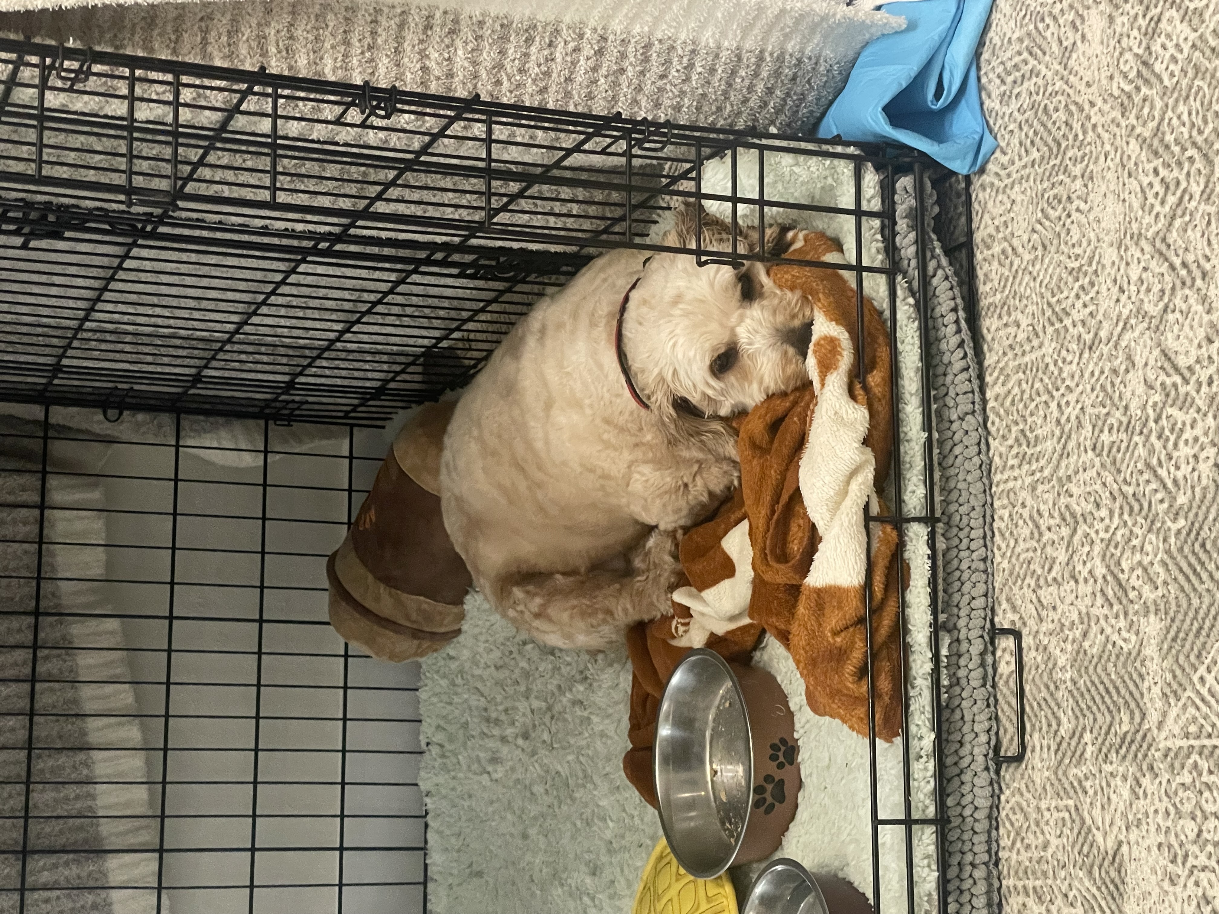 My foster family wakes me up about 6:30 am during the week (8 am on weekends) for morning pets then potty. I go first thing in the morning and hold my potty all night! I eat breakfast in my crate - love my crate! Then I take my first morning nap in my crate. Around 11-12pm we take another walk and then another around 4:30 pm before my human sister gets home. I like to go in my crate to chill and then I eat dinner at 5:30. Then it's time for another nap and play session. Rinse and repeat! I go bedtime potty around 8:30 pm followed by a small treat. Then nighty-night in my crate!