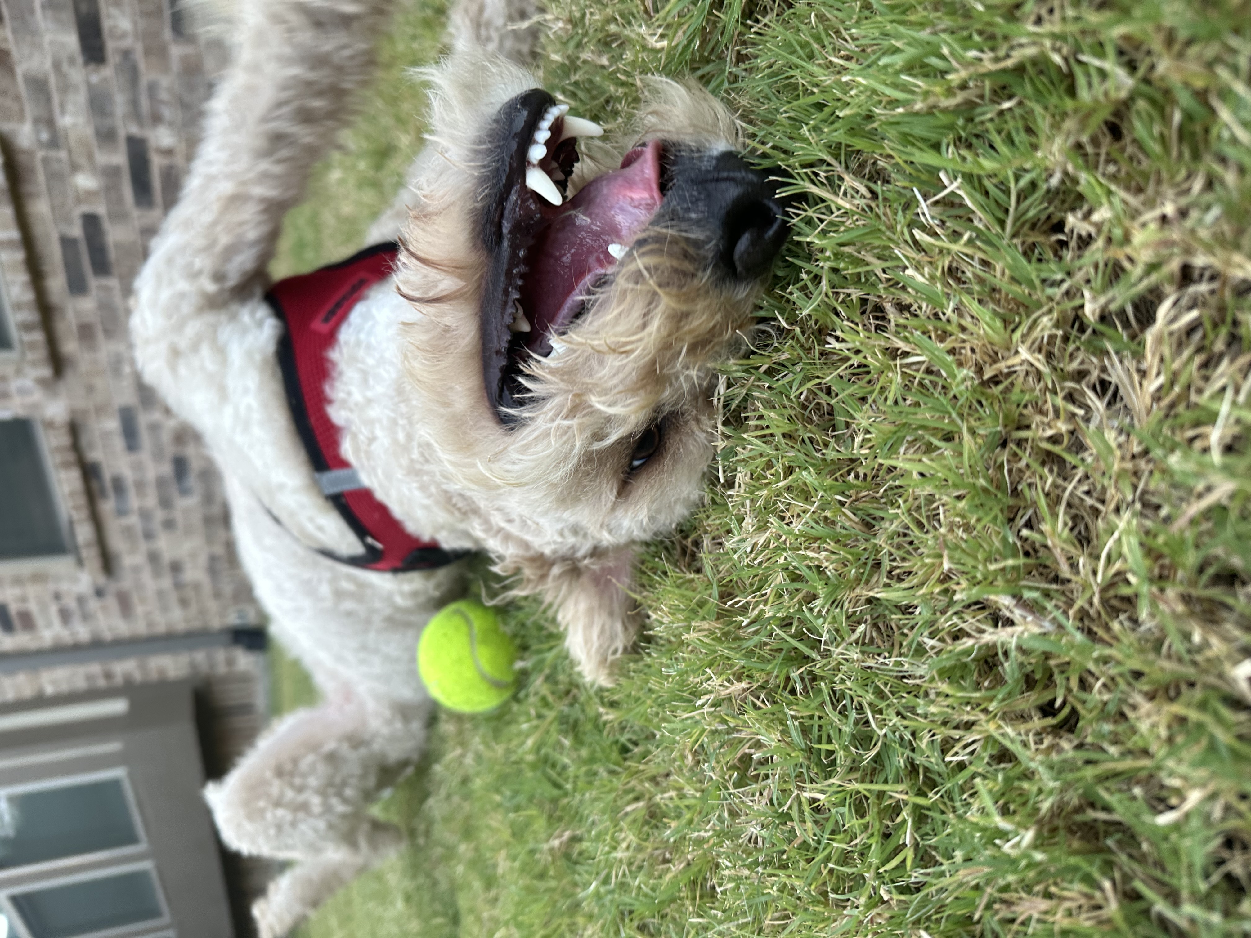 My foster parents think I am the most laid back dog they have had so far. I am good with waking at 7 during weekdays and good with waking at 9 on the weekends. I like chilling in the backyard but do like sometimes to dig up dirt. I do not prefer my crate but will be in it patiently if my foster family is away. I sleep well in my crate. I love playing catch with my foster brother and absolutely love fetching the ball. I am learning my manners to not to counter surf for food. I am a little careful when meeting new people and can sometimes bark at new people. However once I know them I love to be pet by them.
