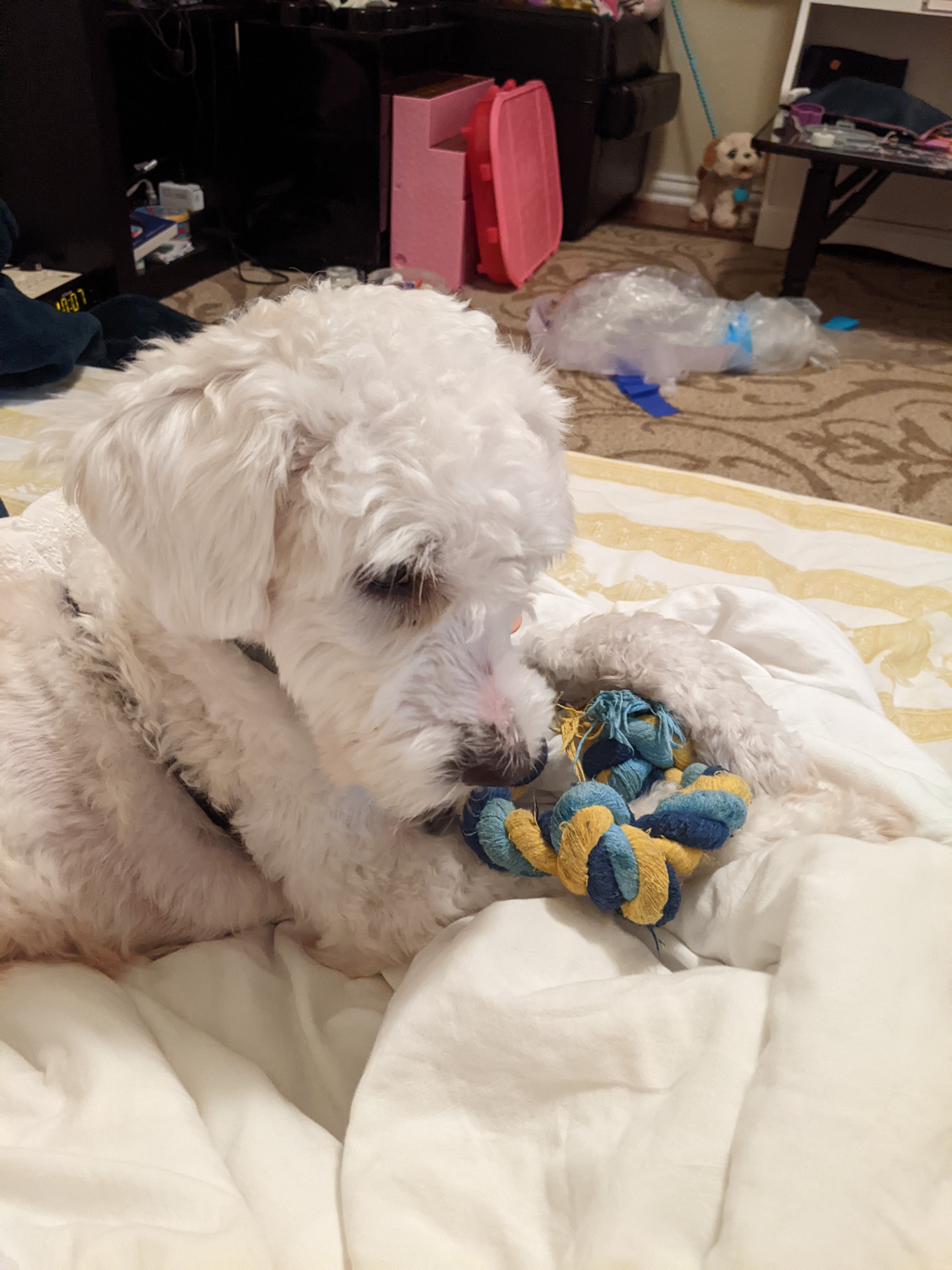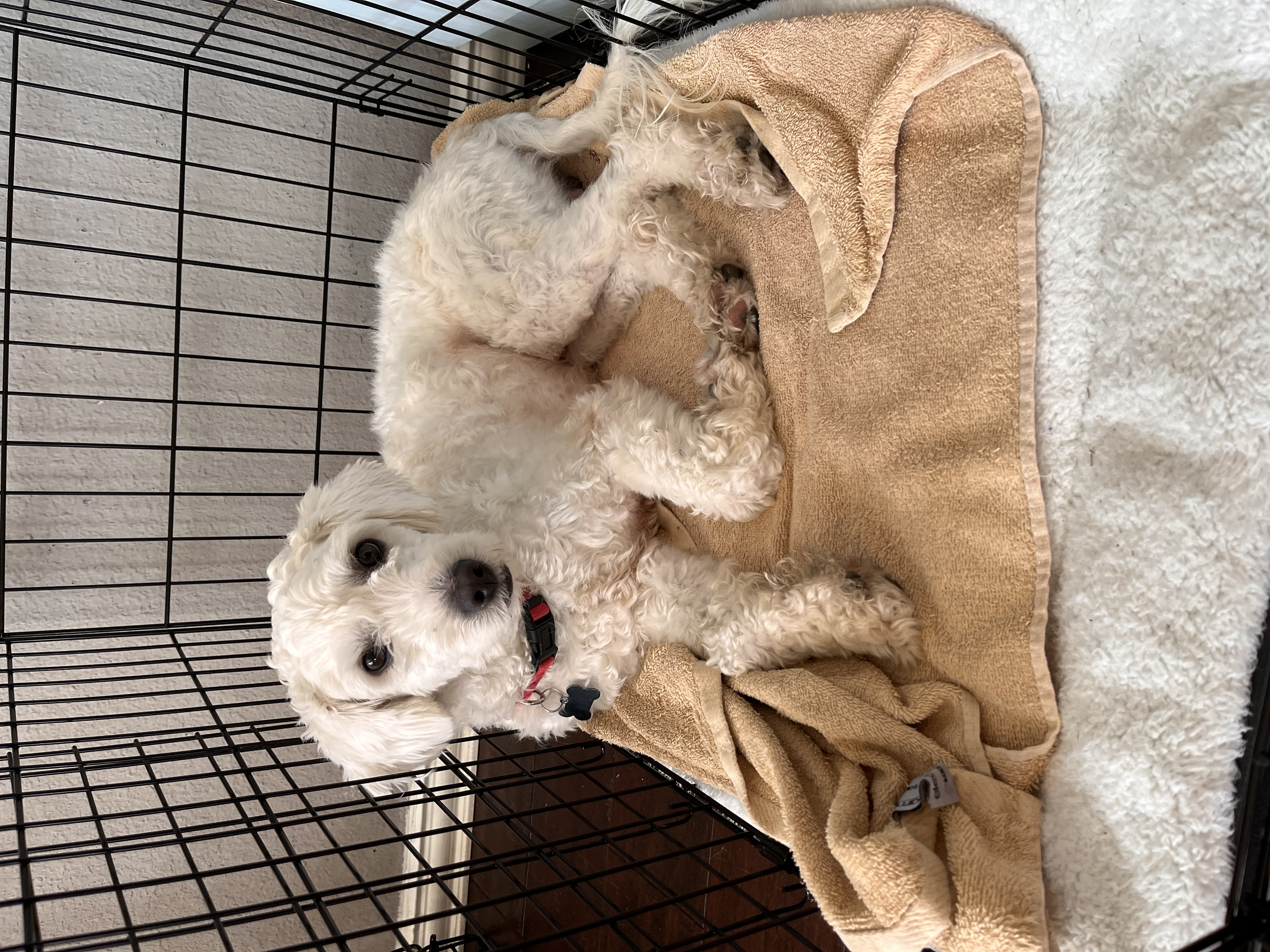 I’m potty and crate trained (I like having a toy in there with me), I love going for walks but I’m still working on not pulling and I get very excited when I see other dogs. I love head and belly rubs and having my head scratched.