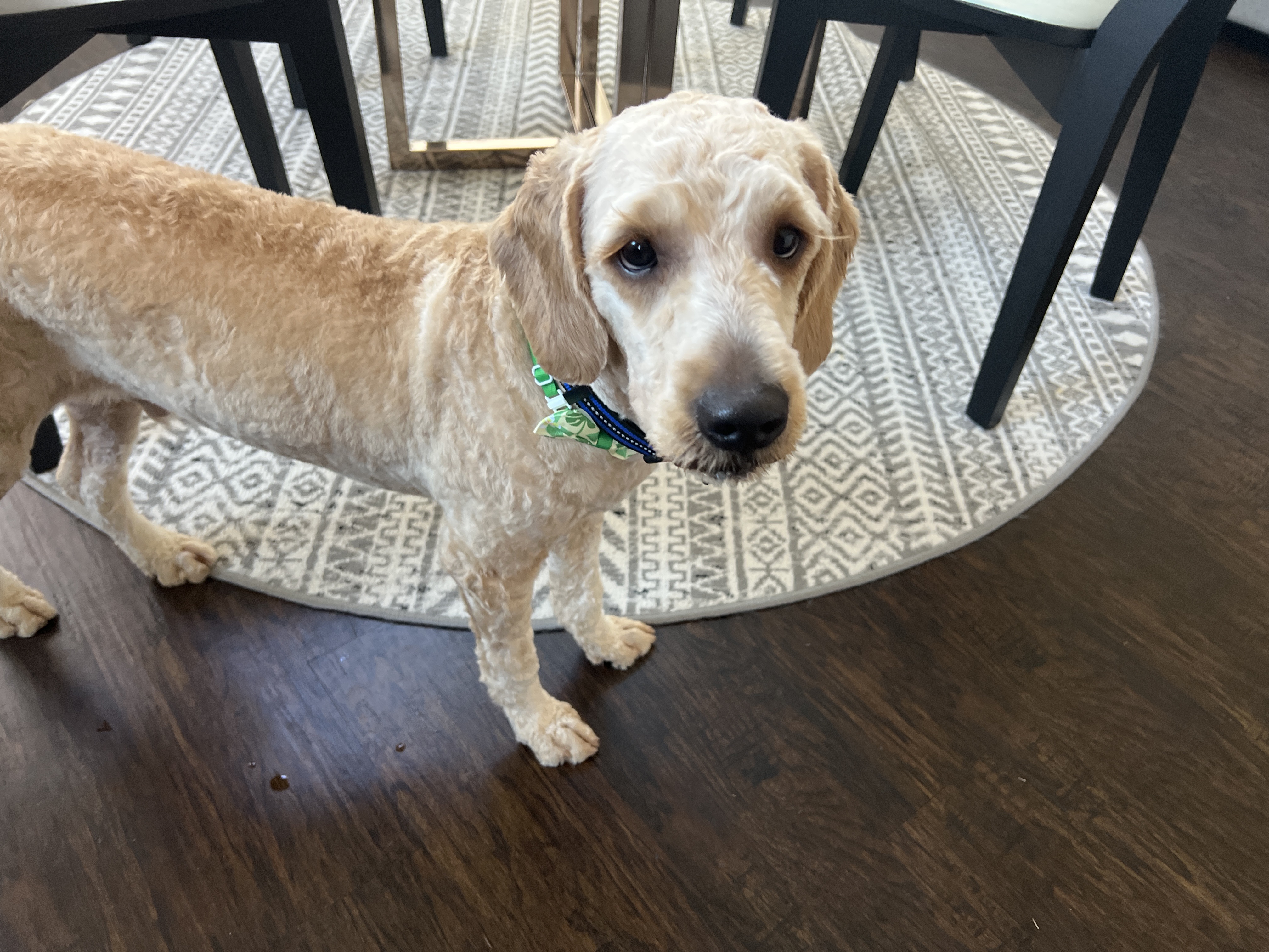 Hi, I'm Rooster! I’m a Male Mini Goldendoodle, 8 months old and weigh about 33lbs, plus I don't shed. When I joined the Top Gun crew, I had to get the typical military buzzed haircut, but it’s finally starting to grow out, and man, I’m good-looking! Basically, I’m the total package.