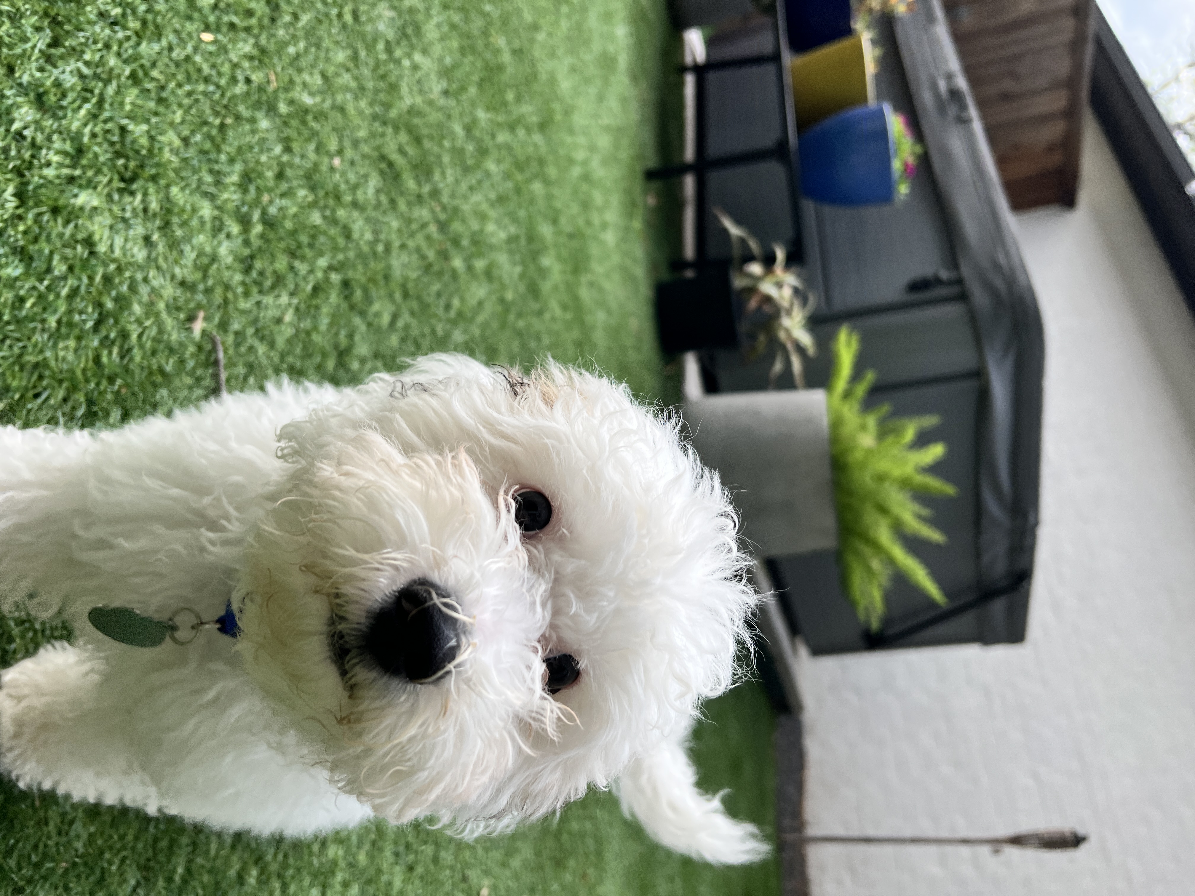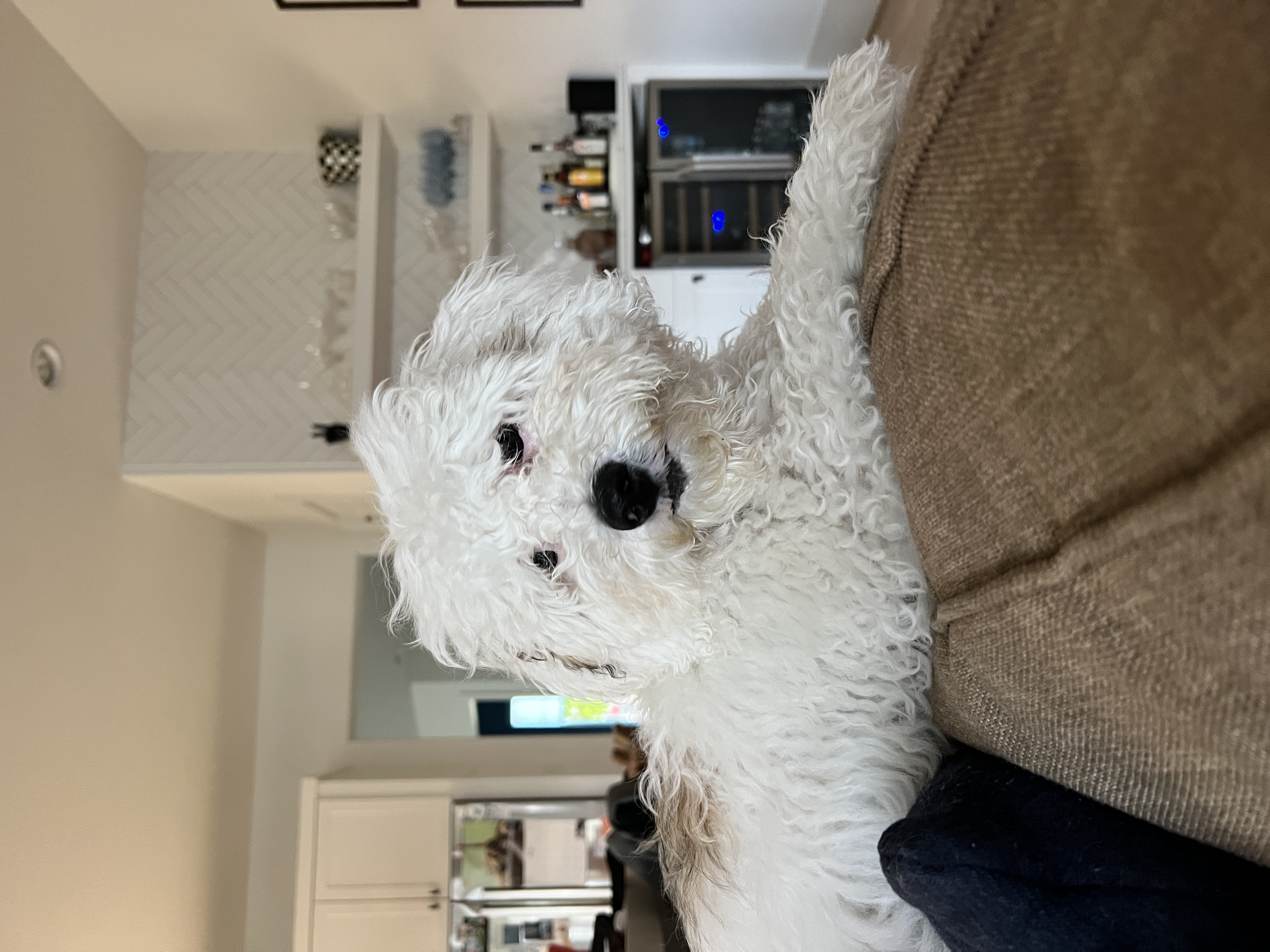 I am a rambunctious puppy who loves to run, play, and most of all, snuggle! I have the softest fluffiest non-shedding hair and interesting coloration giving me almost human eyes. I LOVE being with my people and hate being away from them. I don't like the crate and I just want to be where you are all the time. I love to snack on veggies (and leaves, sticks) and am a quick learner.