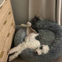 I am a very sweet but timid girl who prefers my own space most of the time. You’ll usually find me curled up in my bed or resting somewhere I feel safe, and while I don’t seek out pets or cuddles, I do like being nearby and will quietly keep you company. My happiest moments happen outside, whether I’m going on walks, exploring the backyard, or visiting the dog park. I really rely on another confident dog to help me feel safe and will often follow their lead. Right now, my playful and happy moments are still rare, usually just once or twice a day, and the rest of the time I am calm, quiet, and reserved. I can be sensitive to things like loud noises, thunderstorms, and being alone.