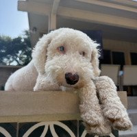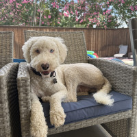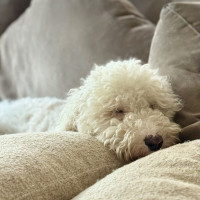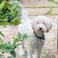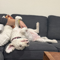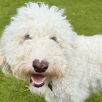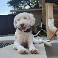 Hi there, I’m Soleia—but my foster family lovingly calls me Leia, and I’ve grown quite fond of it. I’m a 1-year-old, 45-pound Sheepadoodle with a snowy white coat, the bluest eyes you’ve ever seen, and a tiny heart-shaped nose that seems to melt everyone I meet. I’m a gentle-hearted, curious girl who always wants to be near my people—whether I’m quietly watching what you’re doing or hoping to join you on a little adventure. I love to explore, climb, and bounce with excitement, but I take my time when something feels new. I like to be brave, but I’m also thoughtful.