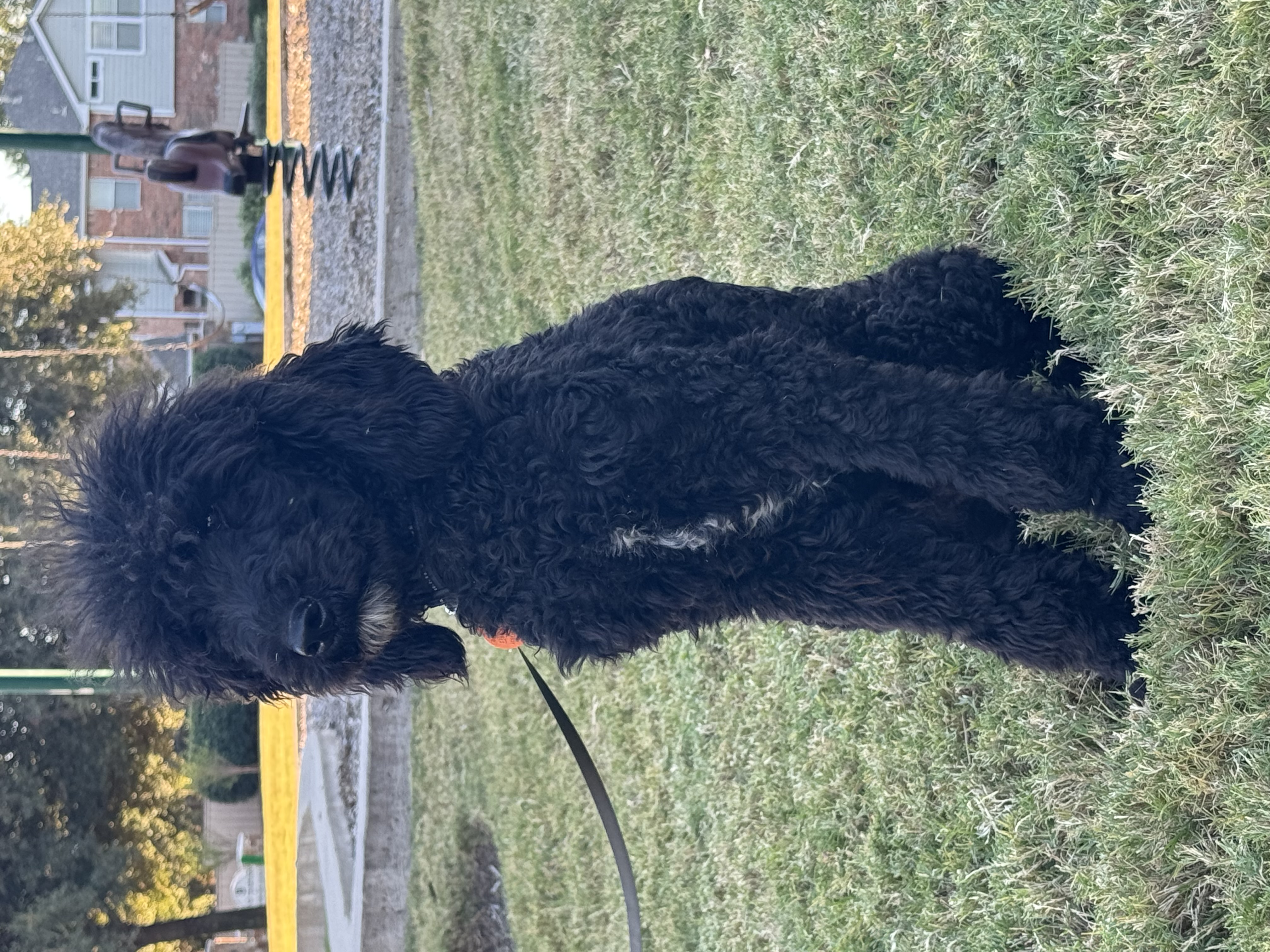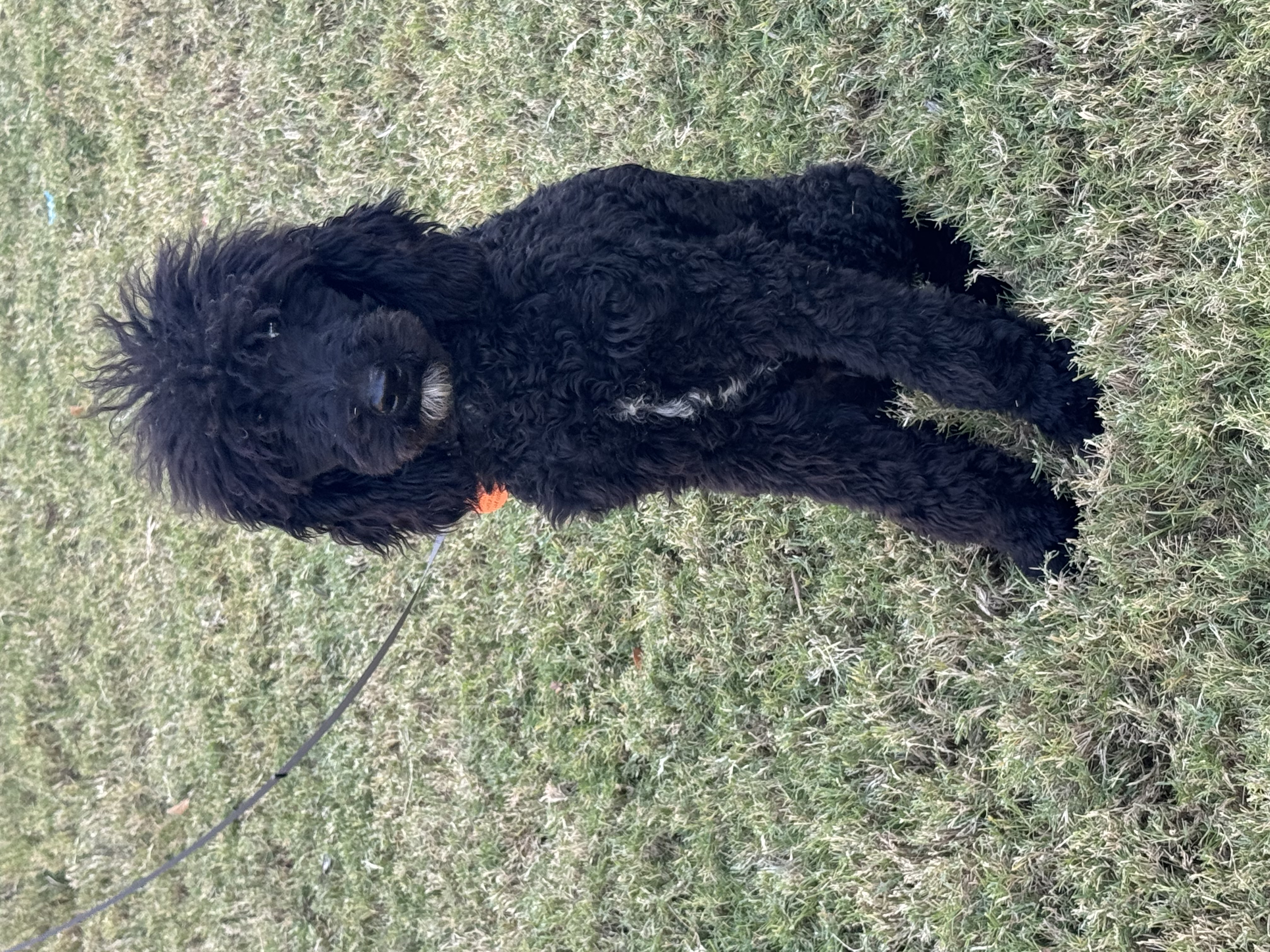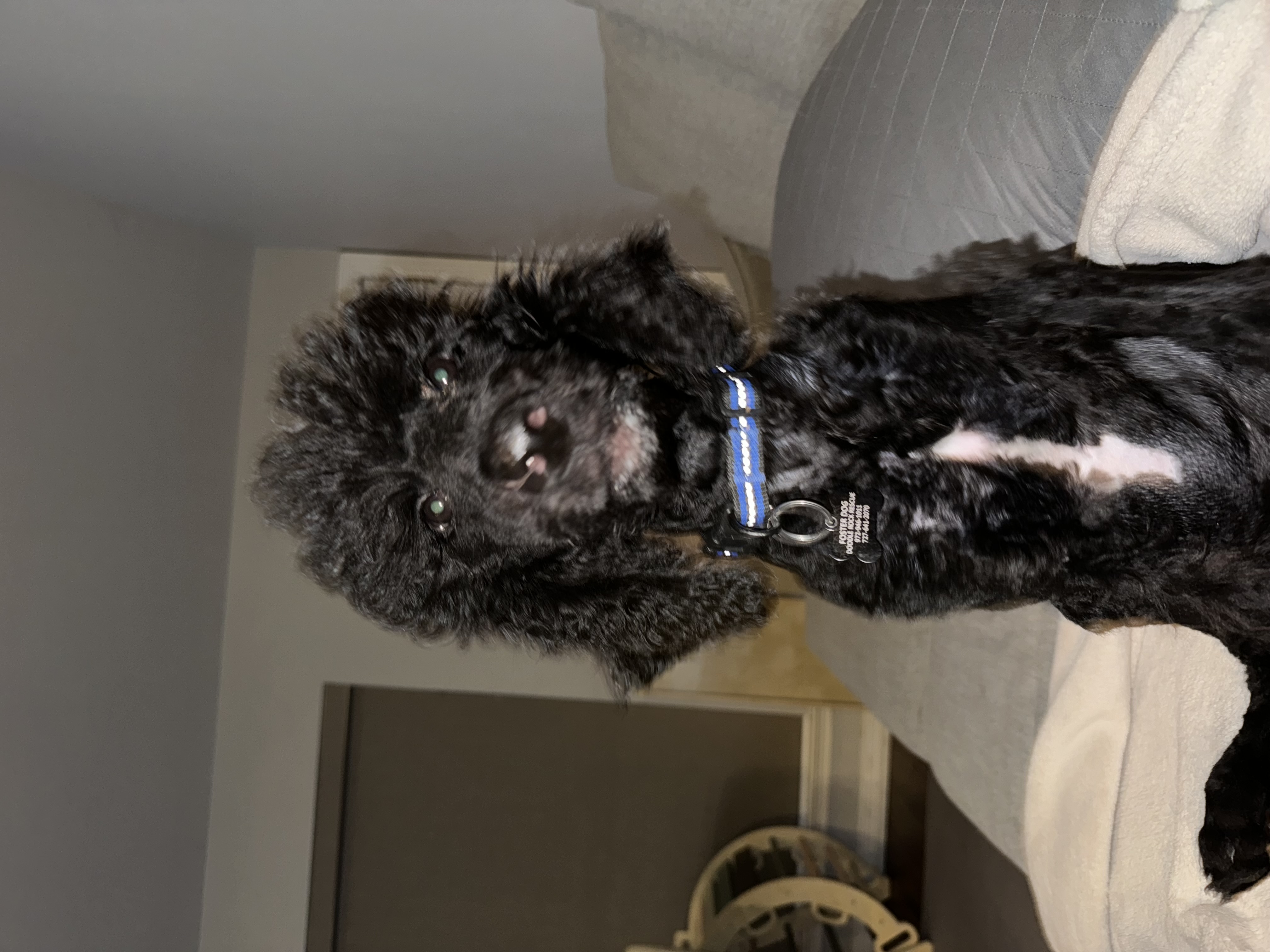 Hi there, I’m Starsky! I’m a 6-month-old standard black poodle with a little white patch on my chest – pretty stylish, huh? I’m around 25 pounds now, but my foster mom says I’m growing fast and will be a tall boy!