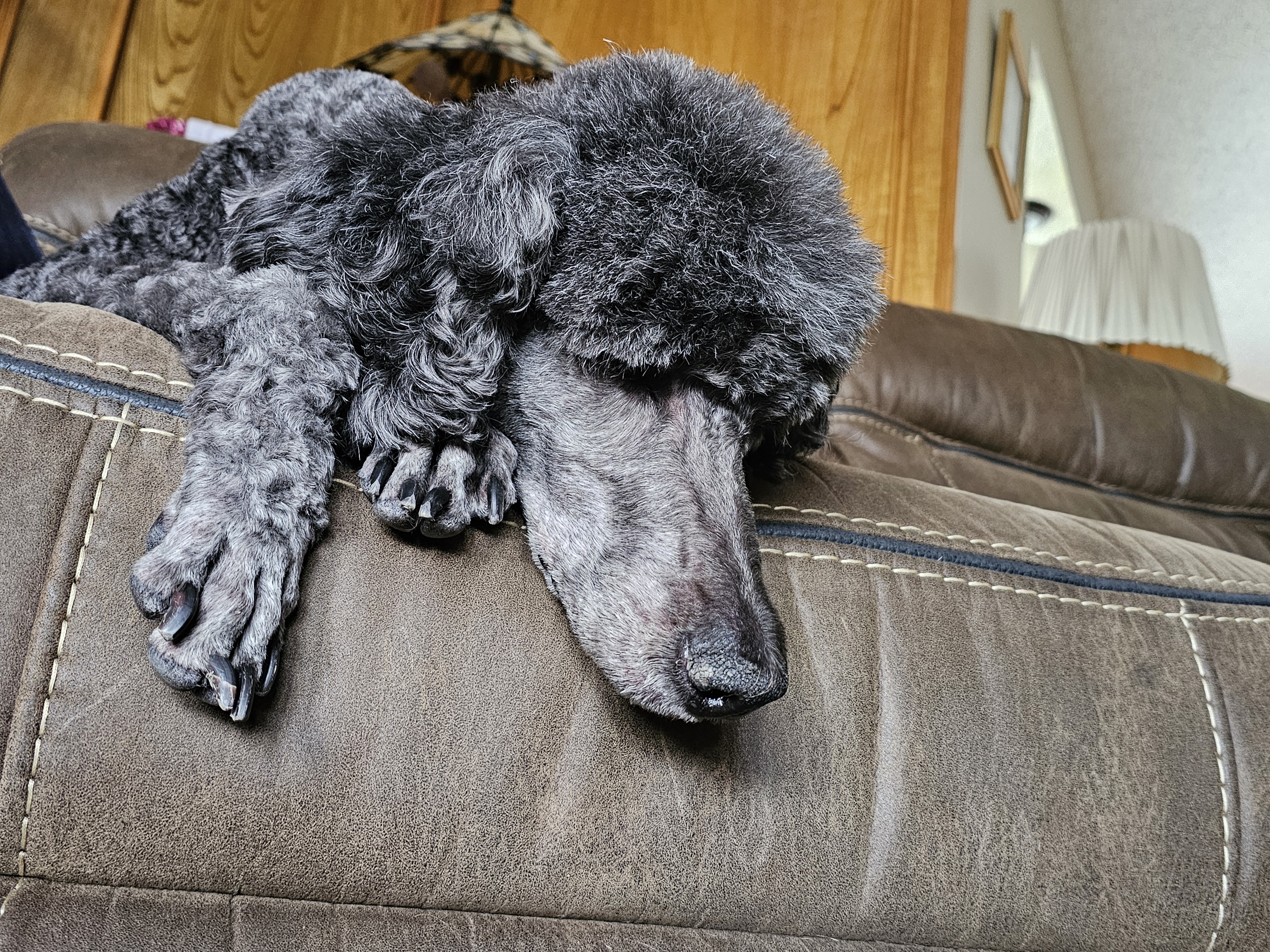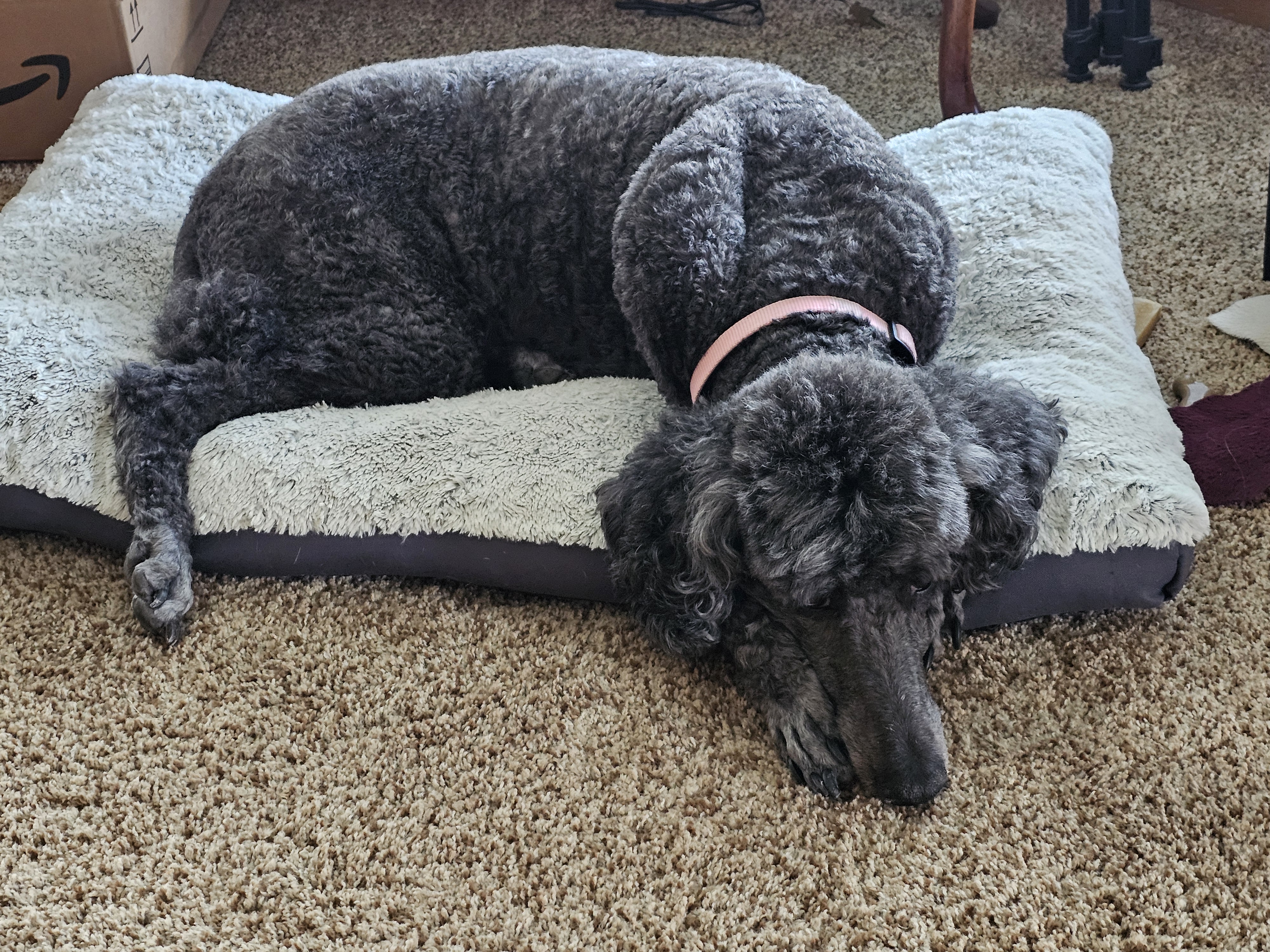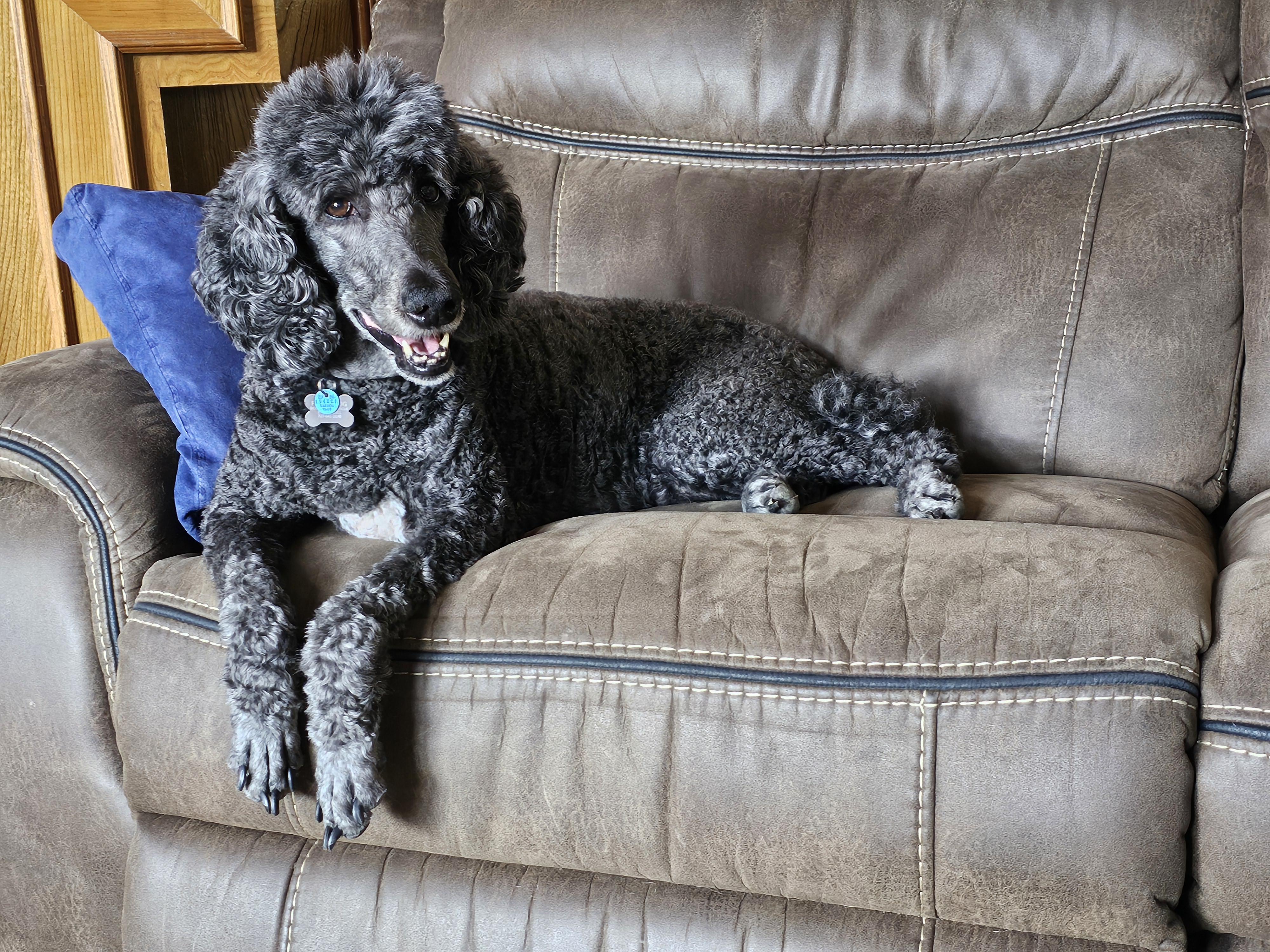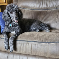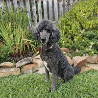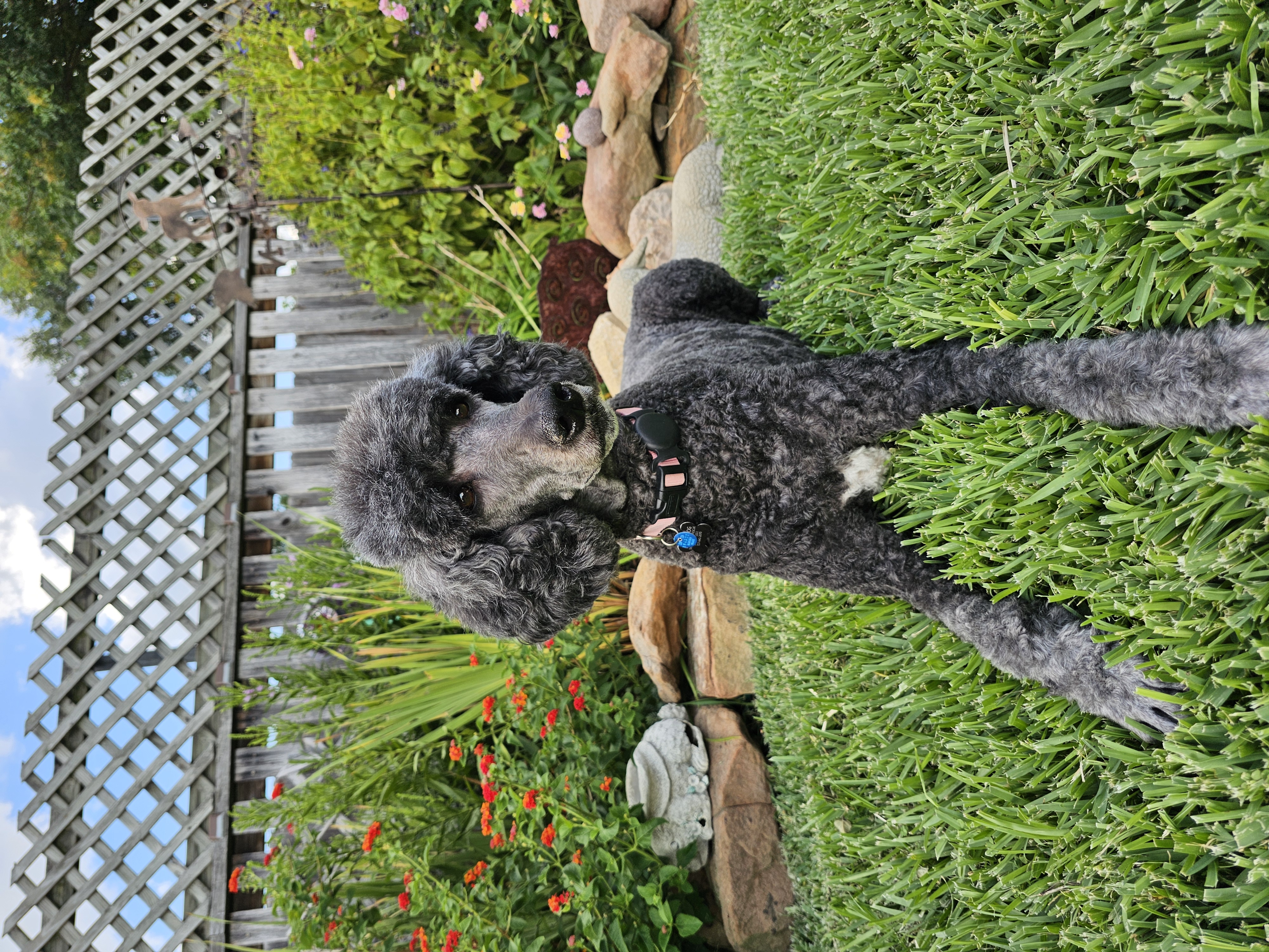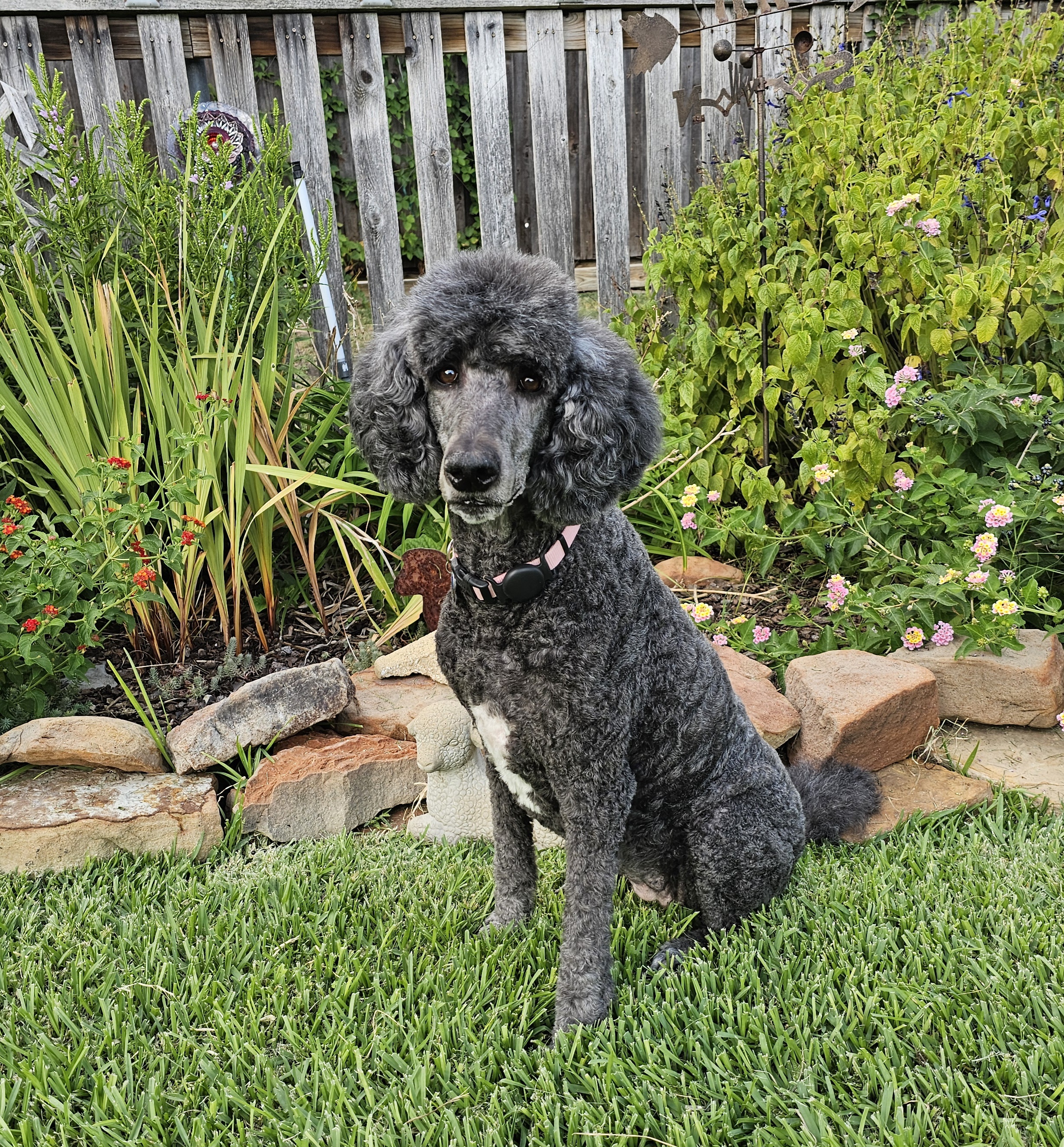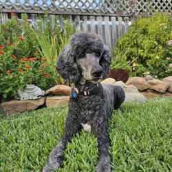 Hi, my name is Stella, though my foster family often calls me Girly-girl—and honestly, I kind of love it. I’m an 8-year-old Standard Poodle with a soft black coat, a charming white patch on my chest, and a gentle, elegant presence. I weigh around 50 pounds, and I carry myself with calm confidence (unless there’s a squirrel—more on that later).