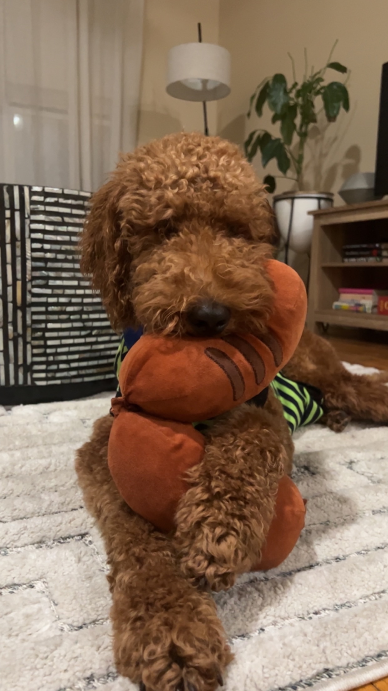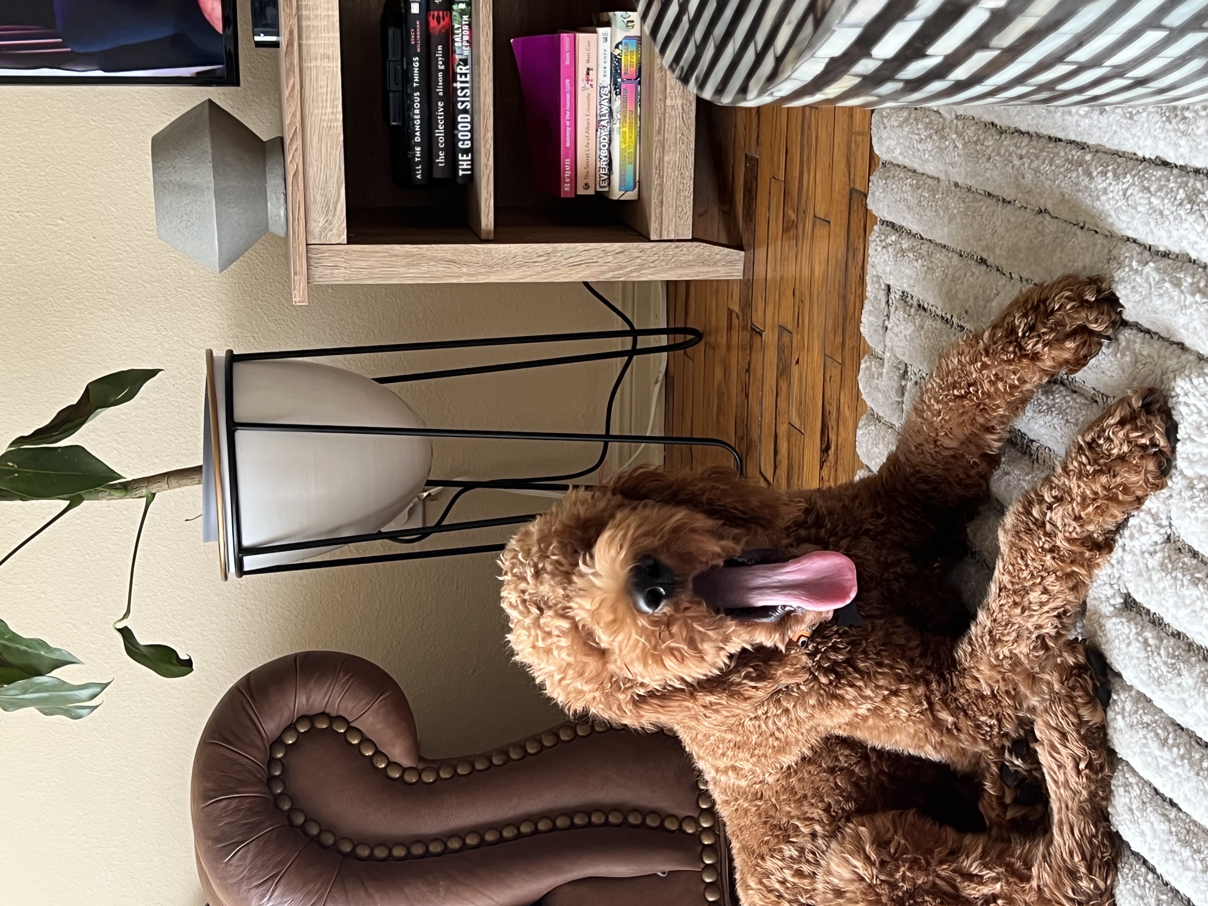 I go with my foster mom’s flow, since I’m such a chill boy. I wake up around 6 with her, but lay around until 7 when I can greet the tiny humans, and eat breakfast then go out and play with my foster brother for about an hour. If we do a walk, it’s around 8. Then it’s nap all morning until I play some more around lunch. I’m really good at lounging all day while my foster mom does house chores and takes care of tiny humans. Then dinner at 6 and I go out to play some more until I’m done for the day around 8. I sleep on my foster parents’ bedroom floor (I won’t sleep in my dog bed!)