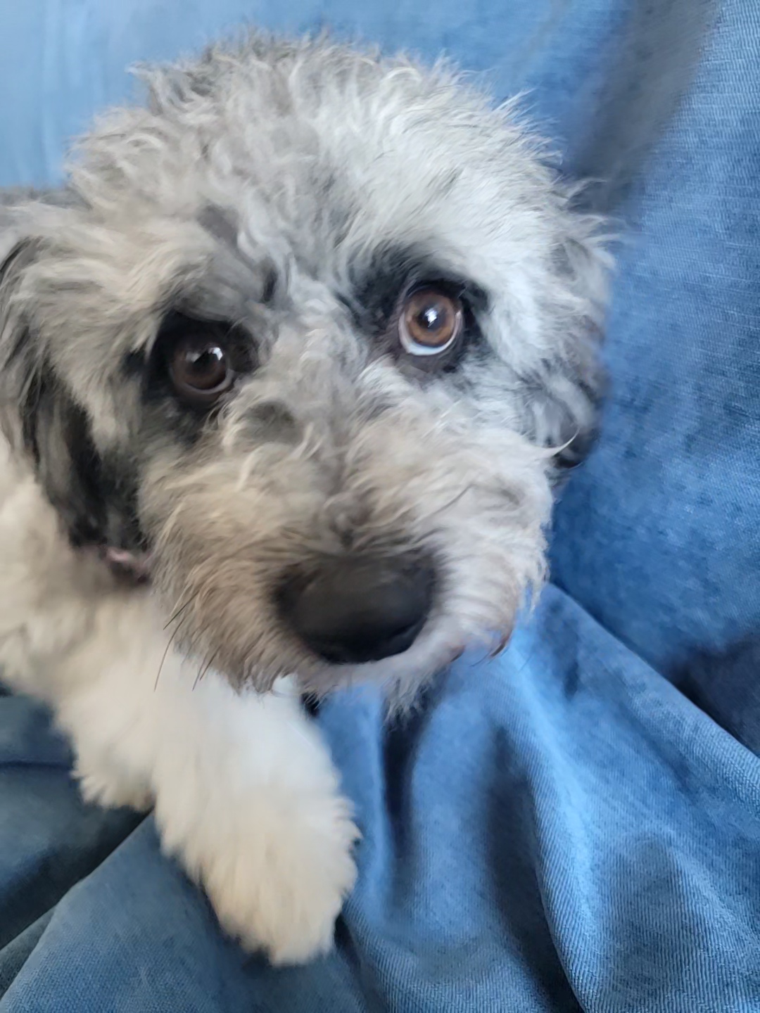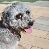 Hello there, future fuuuurever family! Trinket here—yes, down here! I’m an adorable (estimated) 6-8 month-old female mini-poodle mix, weighing in at a dainty 16.2 lbs. I may have started life as a stray, but I’m slowly learning the joys of the good life! I can be a bit shy at first, but once I feel safe, I’m all about the cuddles, nose nuzzles, and gentle kisses.