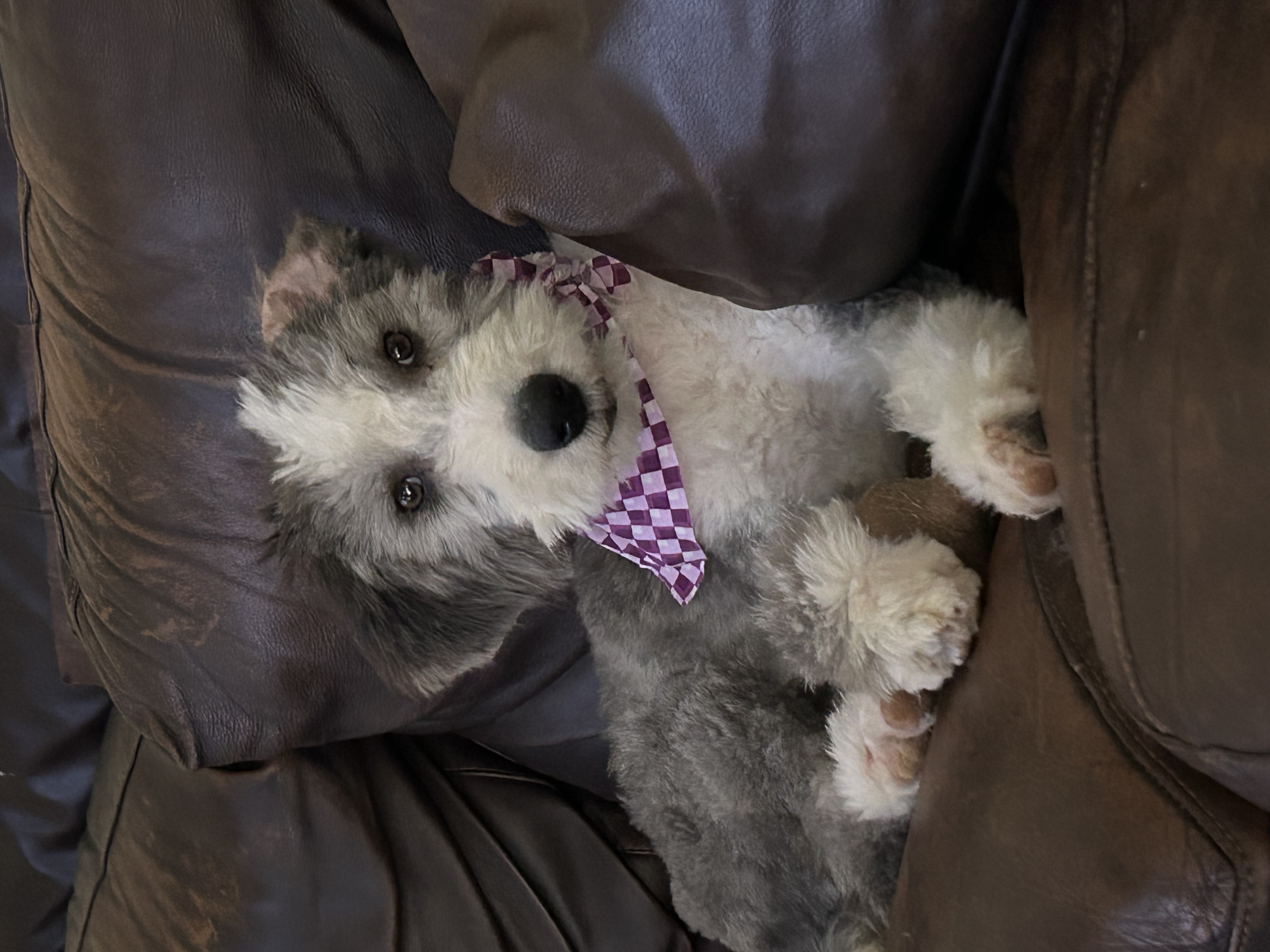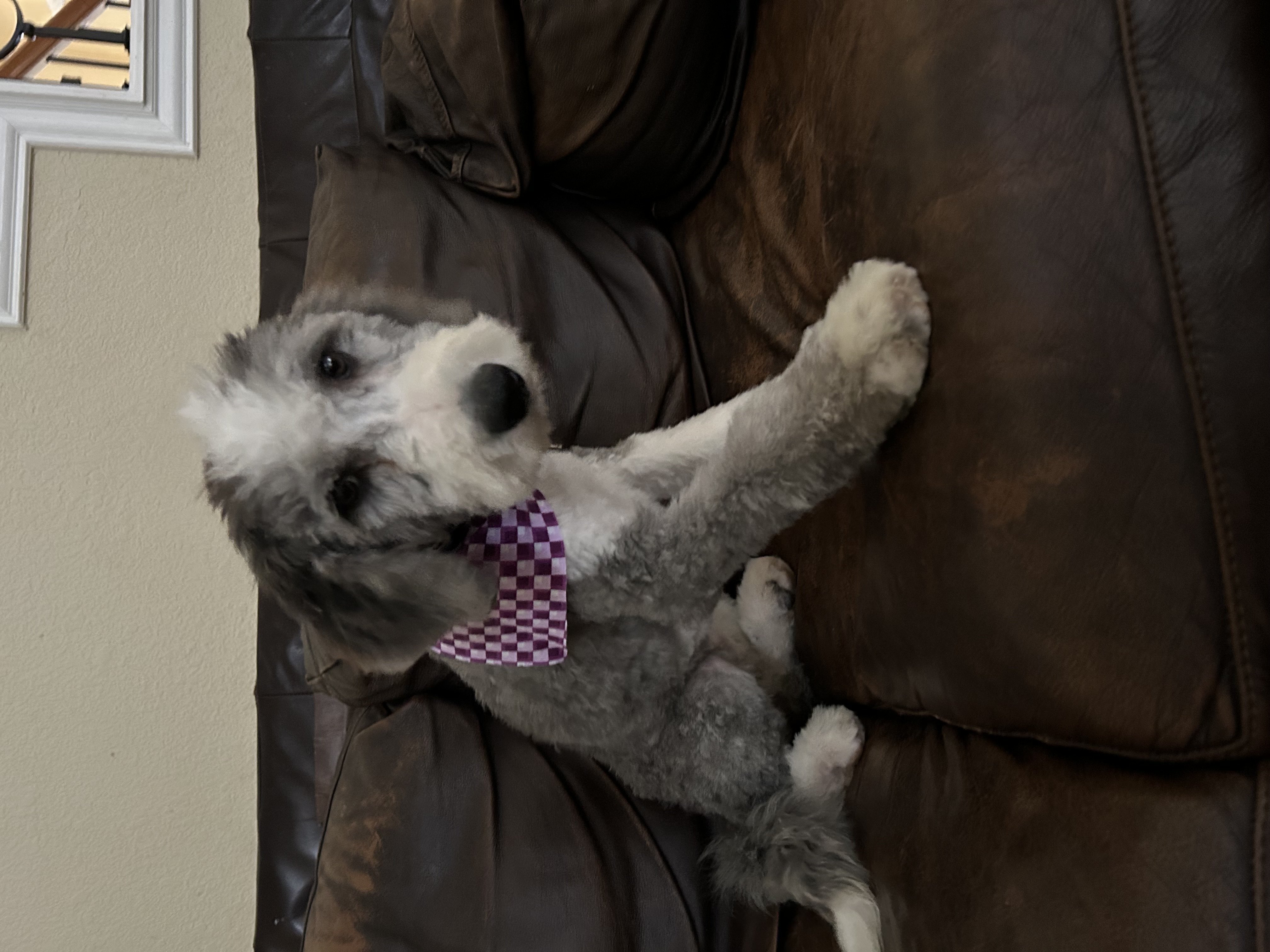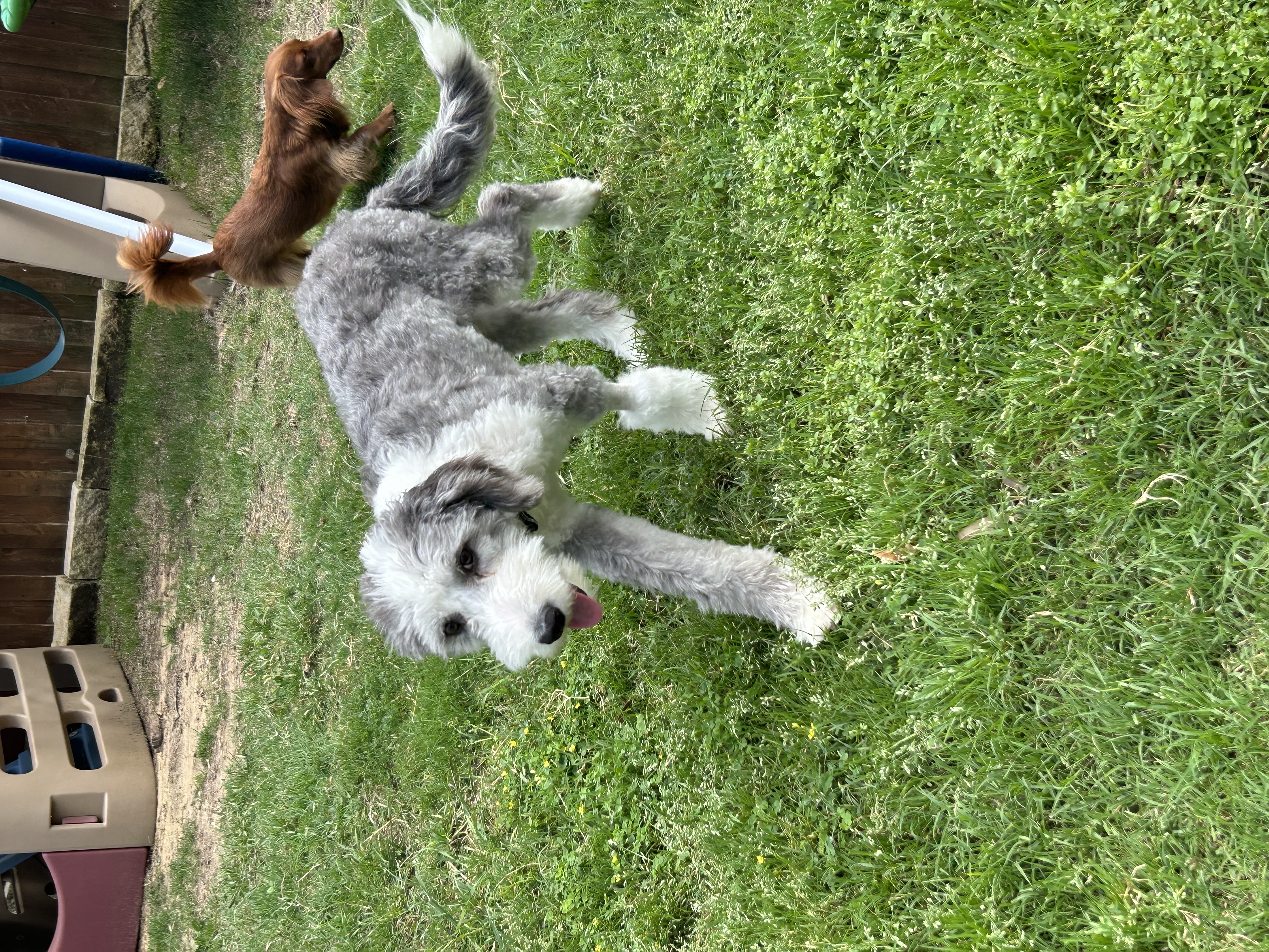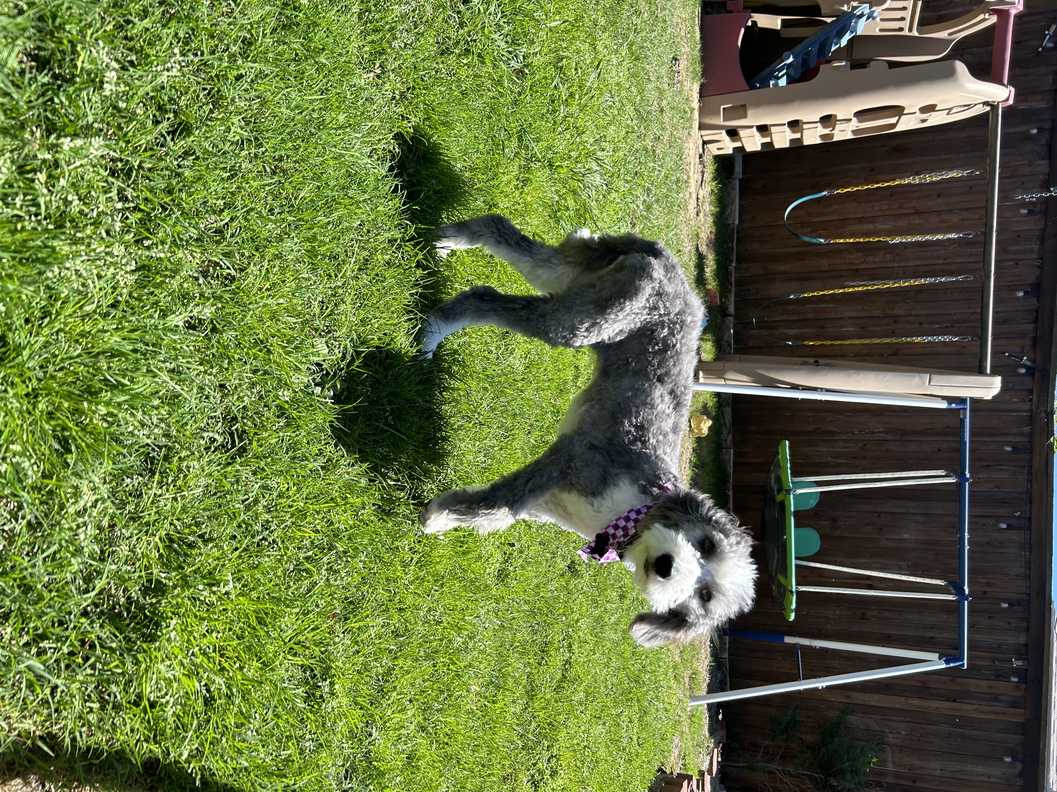 Hi! My name is Violet, and I'm a 10-month-old female Sheepadoodle weighing in at approximately 25 lbs and growing!