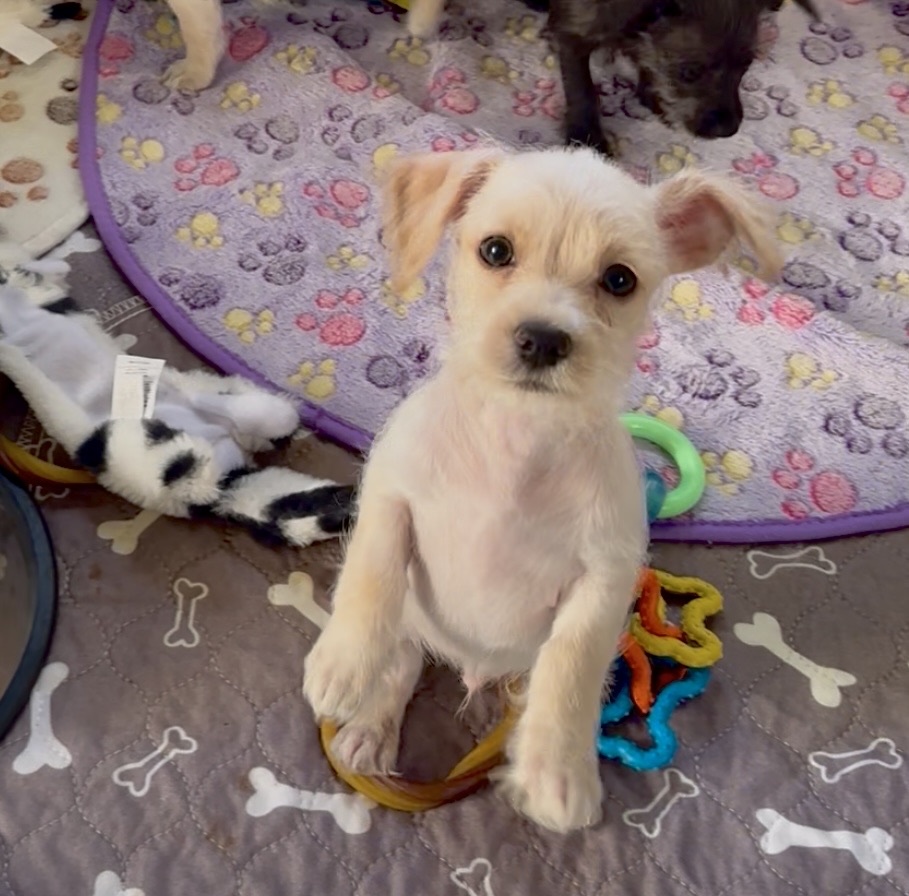 Hi! My name is Weenie, and I’m an 8-week-old mystery mix with a whole lot of cuteness—just ask my foster mom. No one’s quite sure what breed I am, but one thing’s for sure: I’ve got charm to spare and a heart as big as my paws. Right now, I weigh 3 pounds, making me the biggest of my litter—and maybe the best cuddler, too.