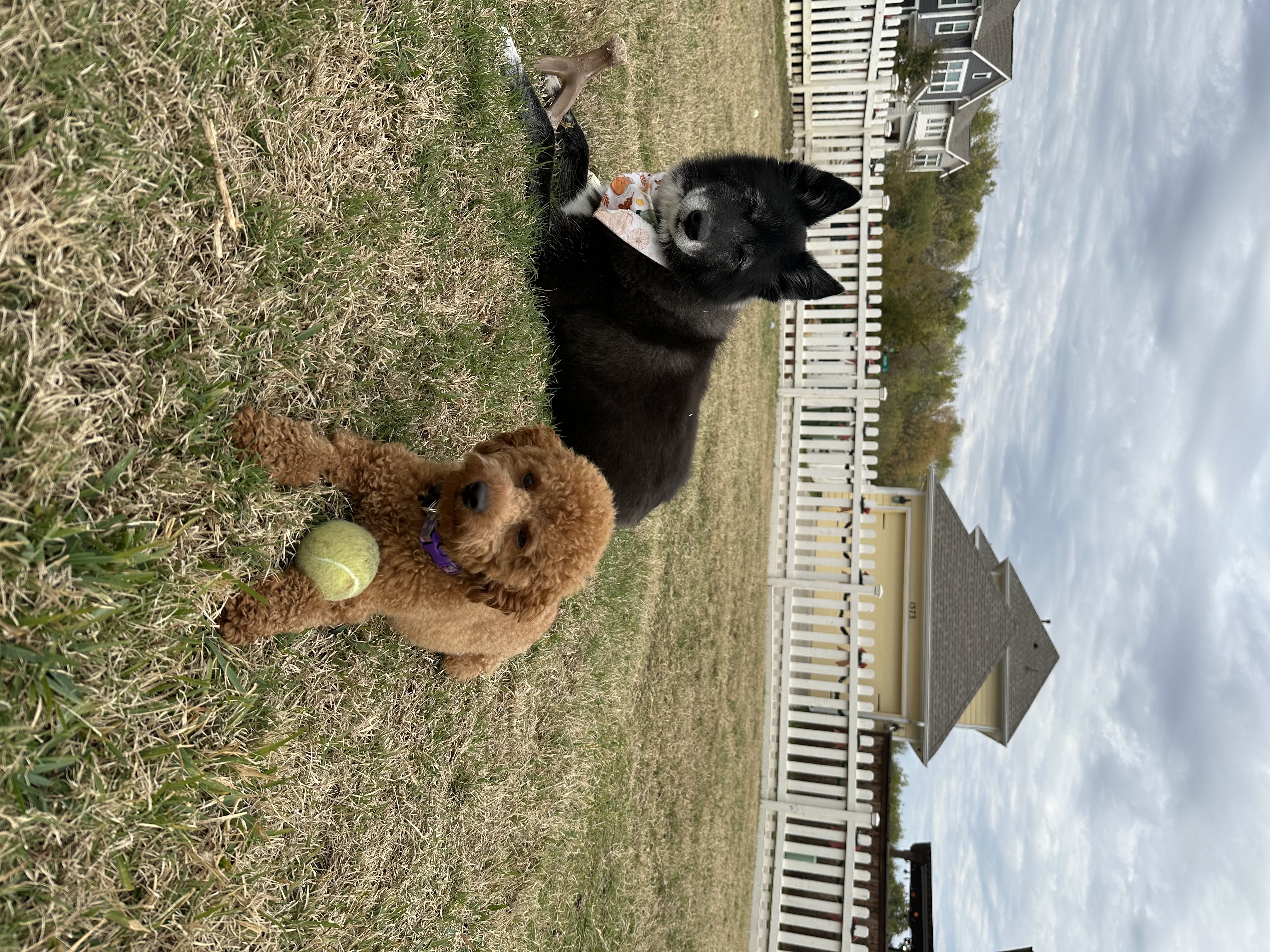 My happy place is the backyard, especially with a doggie door. In and out, in and out… all day long. I love zoomies, sunshine naps, and playing fetch forever—tennis balls are my favorite. Squeaky and crinkly toys make me very happy, and I have a funny habit of arranging my toys in a little circle before picking one to play with next.