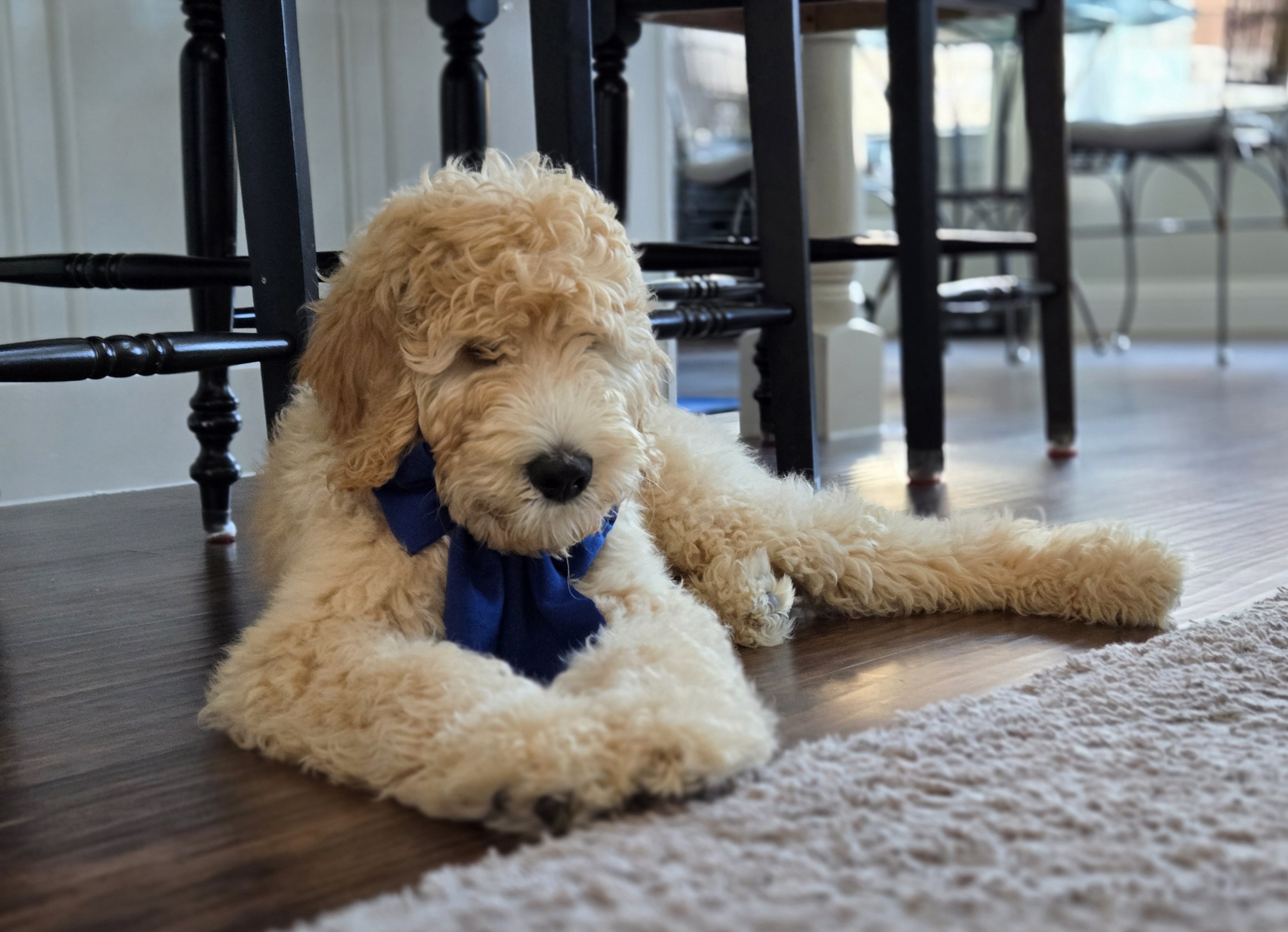 Hi, I'm Zurie! I'm an energetic 5-month-old male Goldendoodle weighing in at a perfect 29 pounds. If you're looking for a playful pup with endless energy for games of fetch or zoomies in the park, then I'm the pup for you!